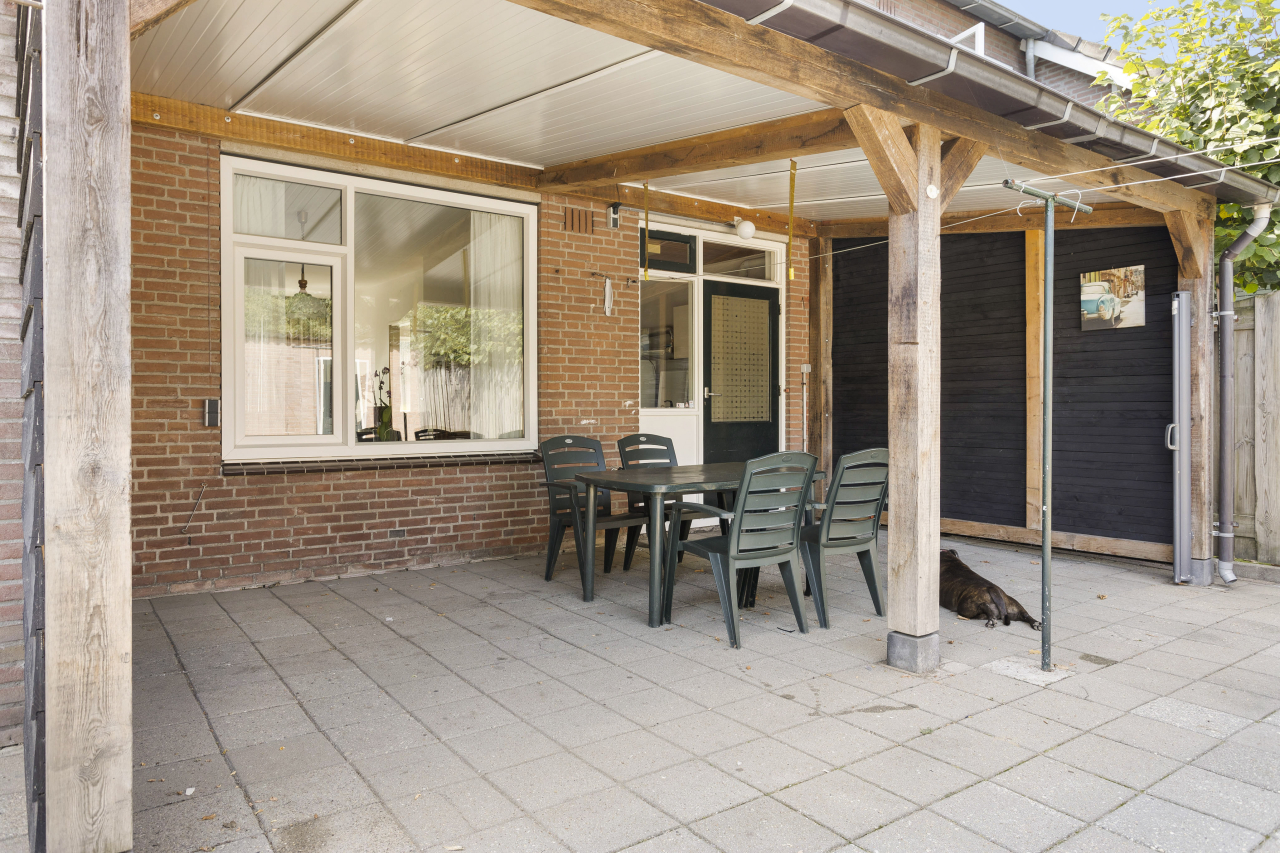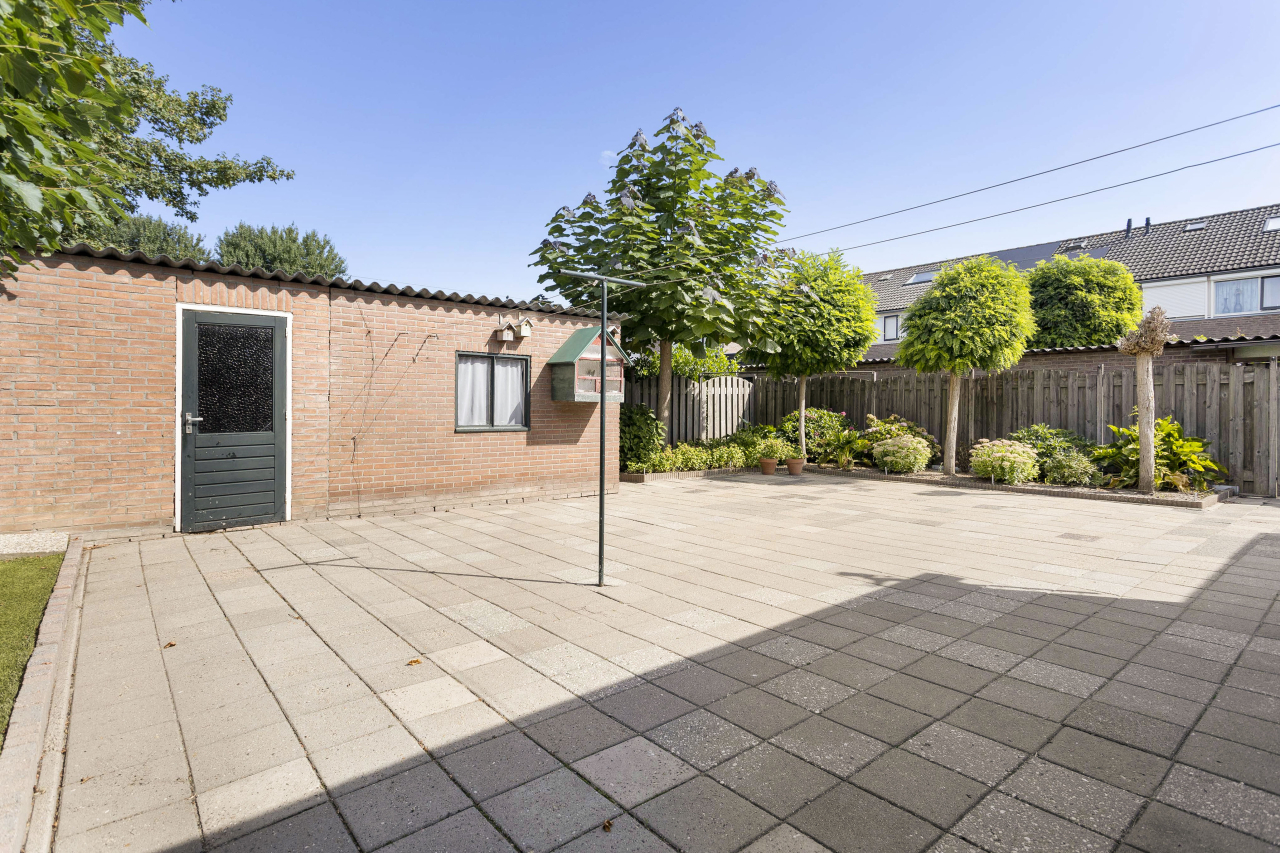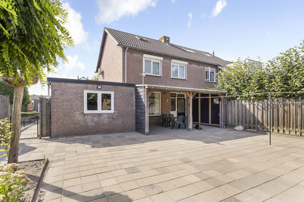 Achter de woning ligt een diepe tuin met achterom die grotendeels bestraat is en voorzien van enkele borders met bomen en beplanting. Er is tevens een fijne overkapping. Door de diepte van de tuin is er altijd een zonnig plekje te vinden. Achterin de tuin staat een ruime berging met dubbel raam en tuindeur. Kortom een fijne gezinswoning! Komt u kijken?