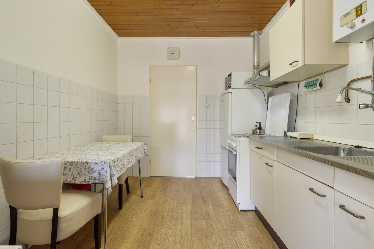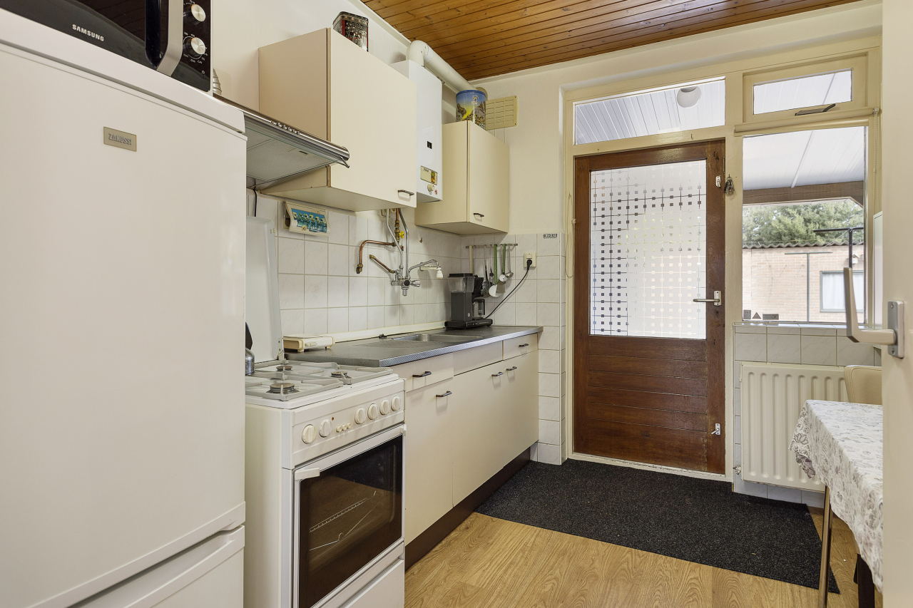 Aan de achterzijde van de woonkamer is de eethoek en via de gang is de aparte keuken bereikbaar. Deze eenvoudige keuken is voorzien van een aanrechtblad met spoelbak, keukenkasten, afzuigkap, geiser en losse keuken apparatuur. Aan de achterzijde zijn ramen en een deur met raam naar de tuin.