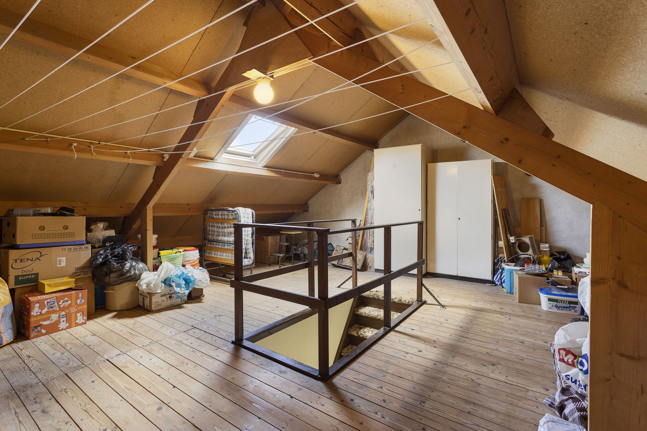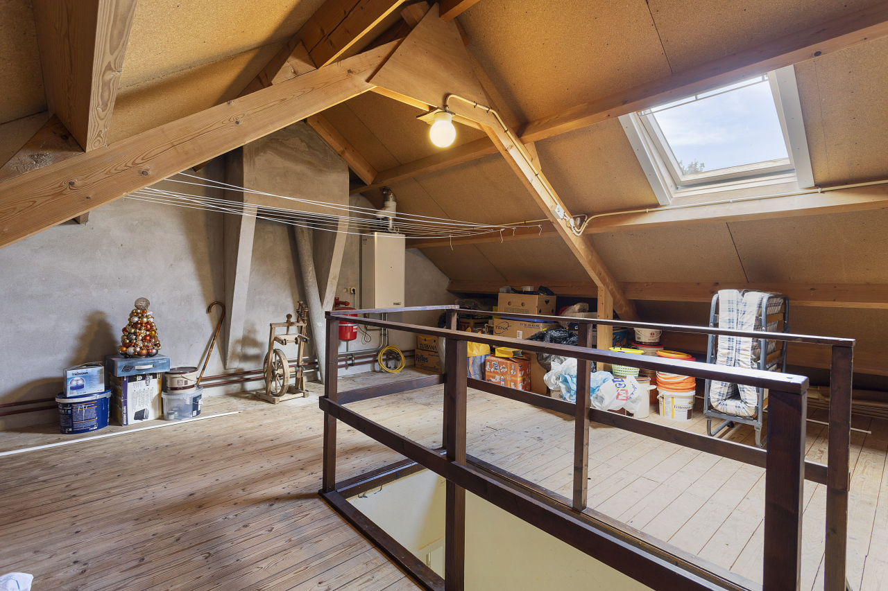 Deze ruime zolderverdieping met veel bergruimte heeft een houten vloer, groot Velux dakraam en hier hangt de Remeha CV ketel.