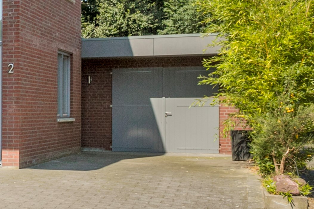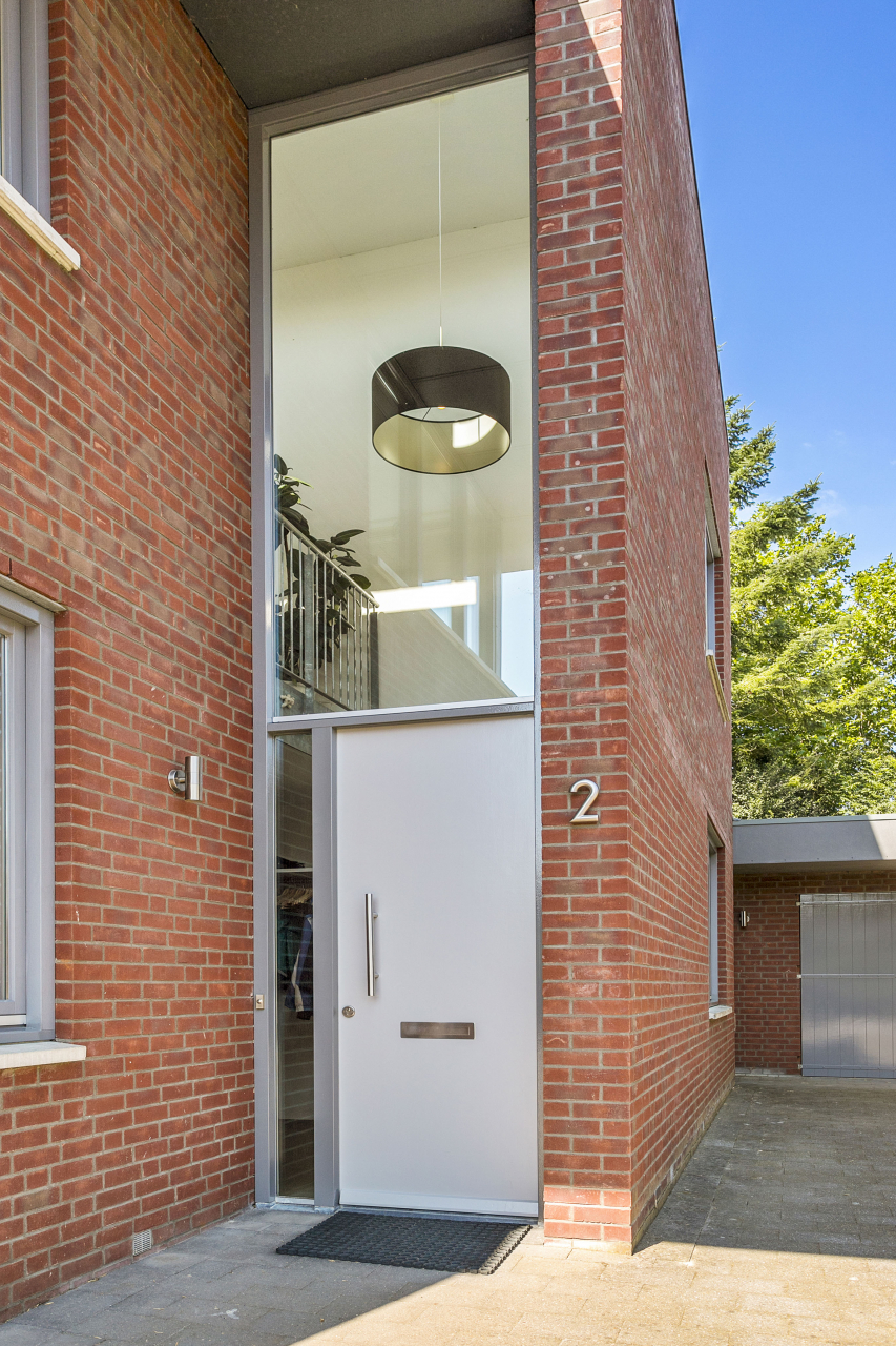 De entree van de woning is aan de zijkant met een fraaie glaspartij boven de voordeur. Tevens ligt naast de woning een grote garage en een oprit voor meerdere auto’s. De geïsoleerde garage is voorzien van dubbele garagedeuren, een loopdeur en ramen aan de tuinzijde.