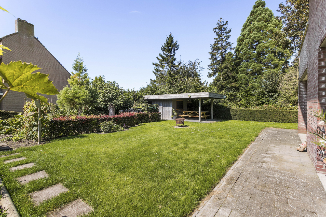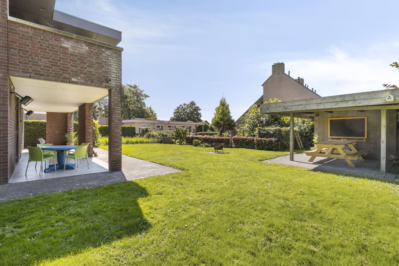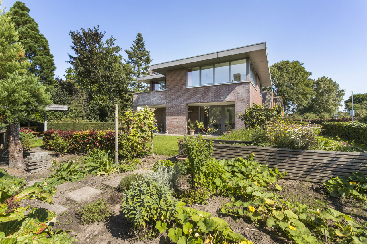 Rondom de woning ligt een heerlijk zonnige tuin met een achterom tussen de garage en het huis. Er zijn diverse terrassen bij de veranda, naast het huis en bij de houten berging. Verder een groot gazon, groentetuin, diverse borders, struiken, bomen en groene haag rondom de tuin. De berging met overkapping geeft veel extra bergruimte.