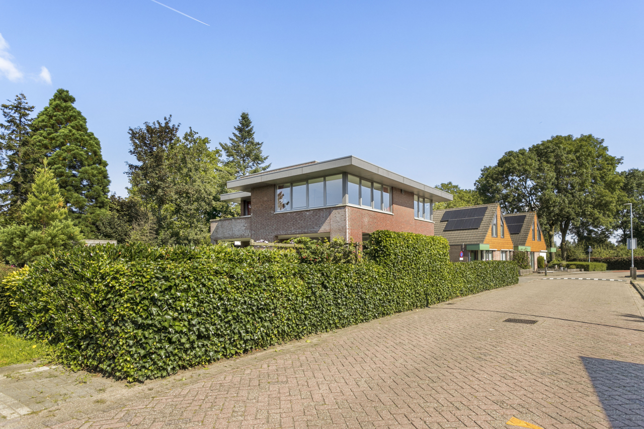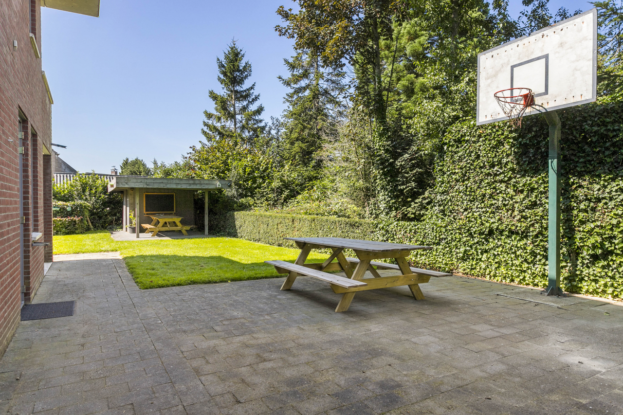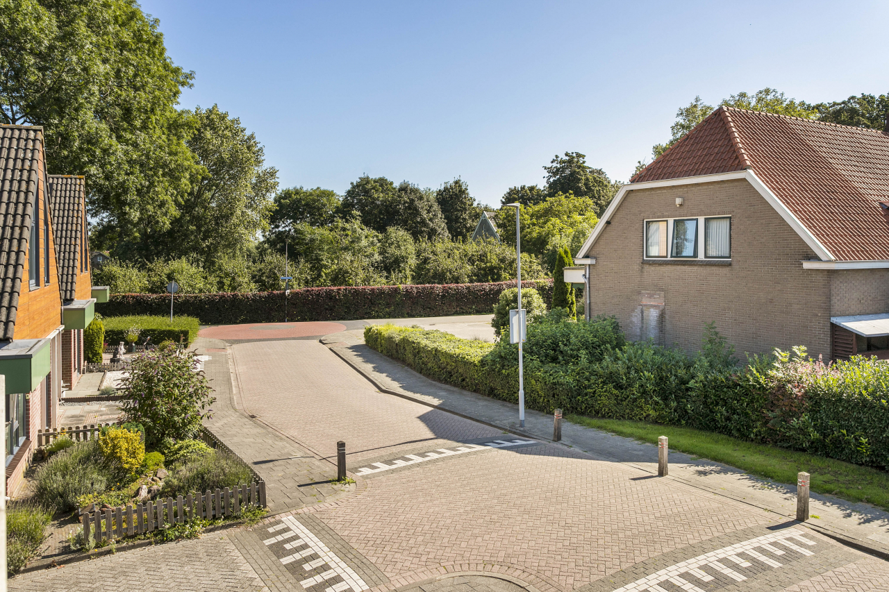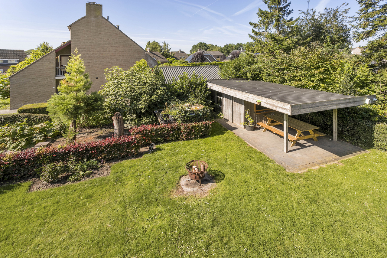Rondom de woning ligt een heerlijk zonnige tuin met een achterom tussen de garage en het huis. Er zijn diverse terrassen bij de veranda, naast het huis en bij de houten berging. Verder een groot gazon, groentetuin, diverse borders, struiken, bomen en groene haag rondom de tuin. De berging met overkapping geeft veel extra bergruimte.