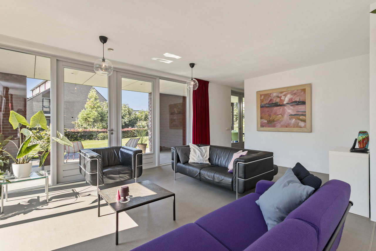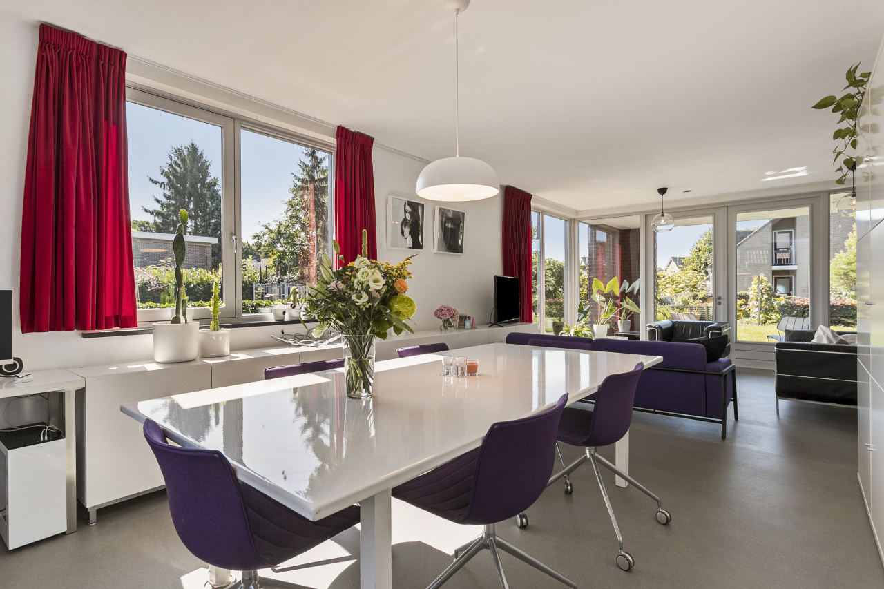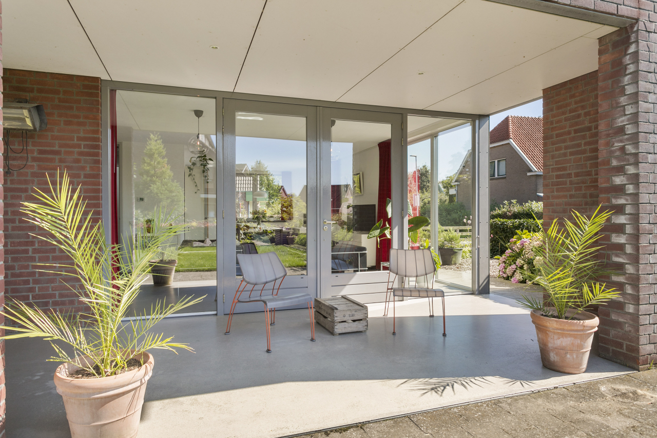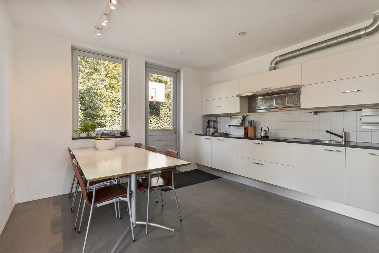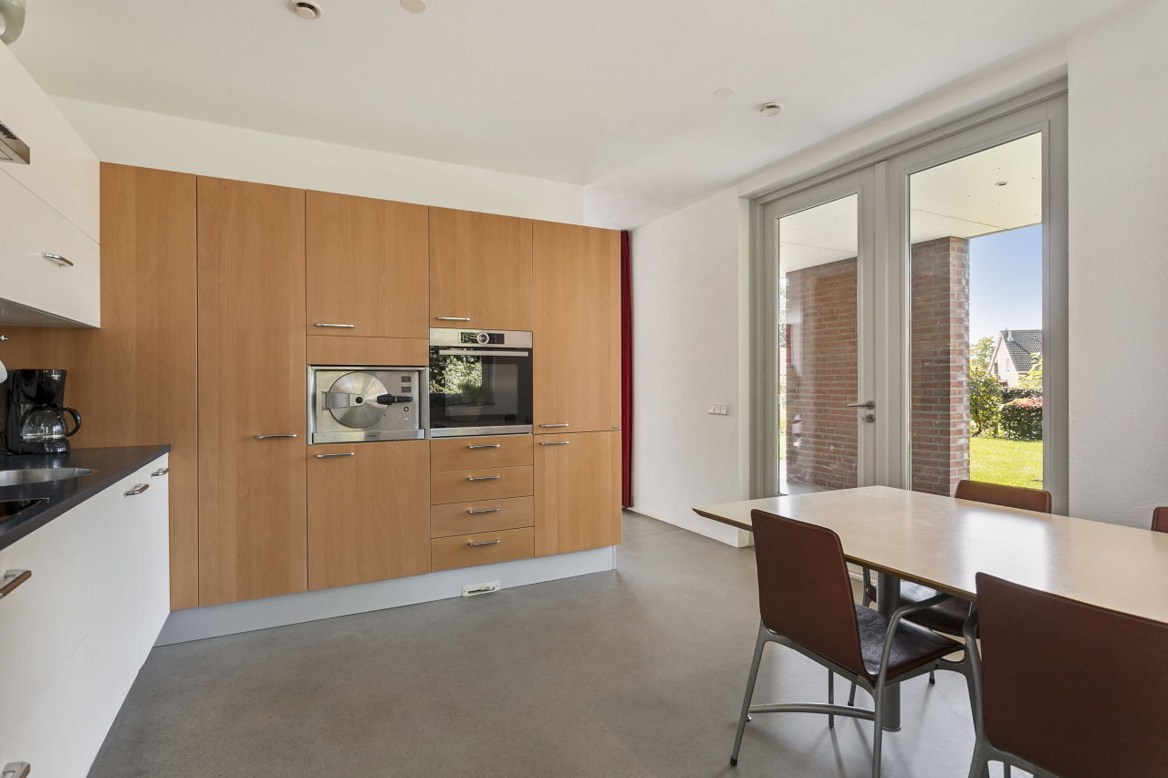 Bij de zithoek zijn kamerhoge ramen en openslaande deuren naar de veranda en tuin. Aansluitend ligt aan de achterzijde de halfopen woonkeuken. Deze keuken in L- opstelling is voorzien van diverse keukenkasten en inbouwapparatuur, openslaande deuren en een raam en deur aan de achterzijde. Er is voldoende ruimte voor een gezellige, grote eettafel. De openslaande deuren in de keuken geven ook toegang tot de veranda waar het heerlijk toeven is met zicht op de tuin.