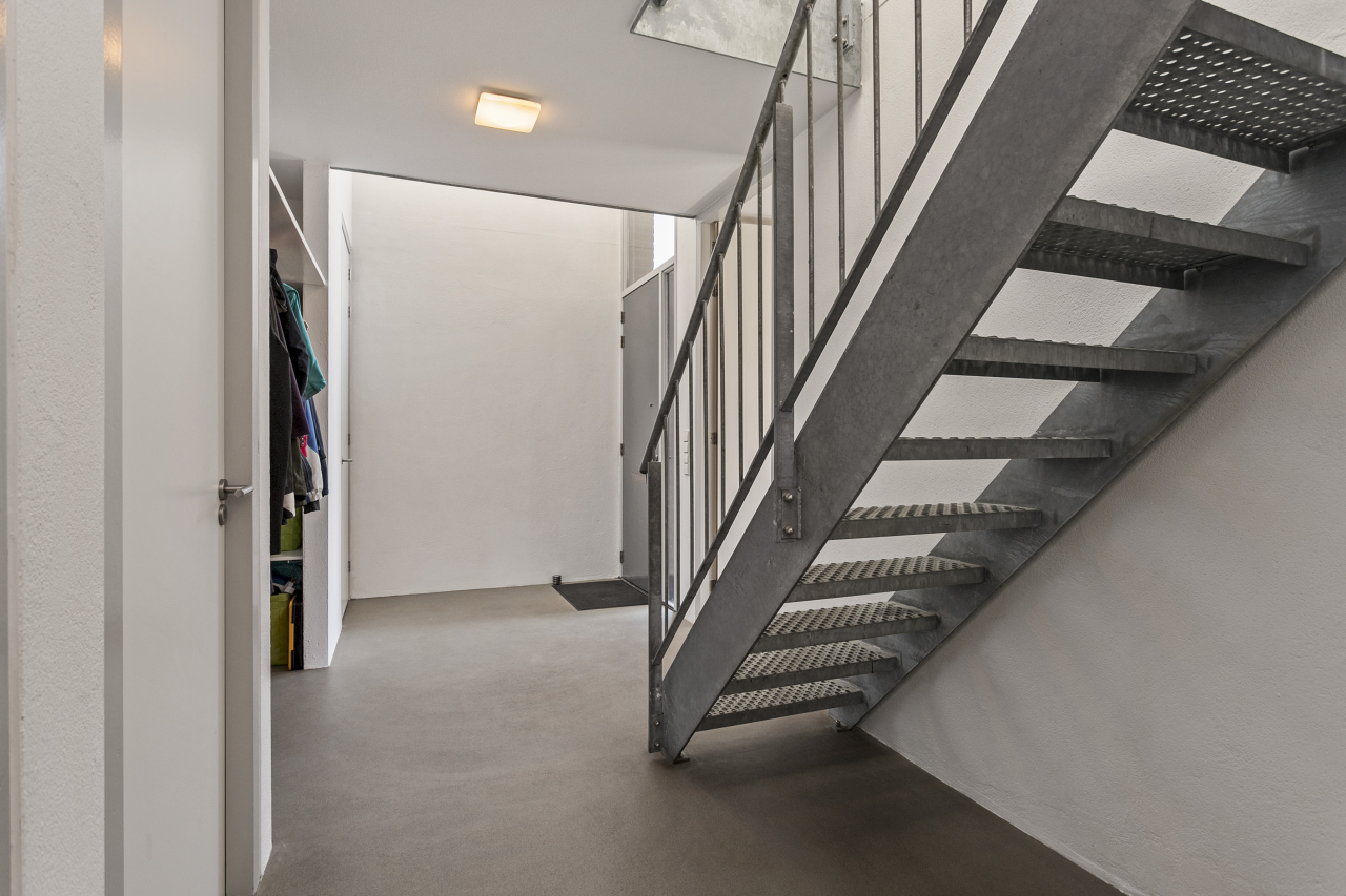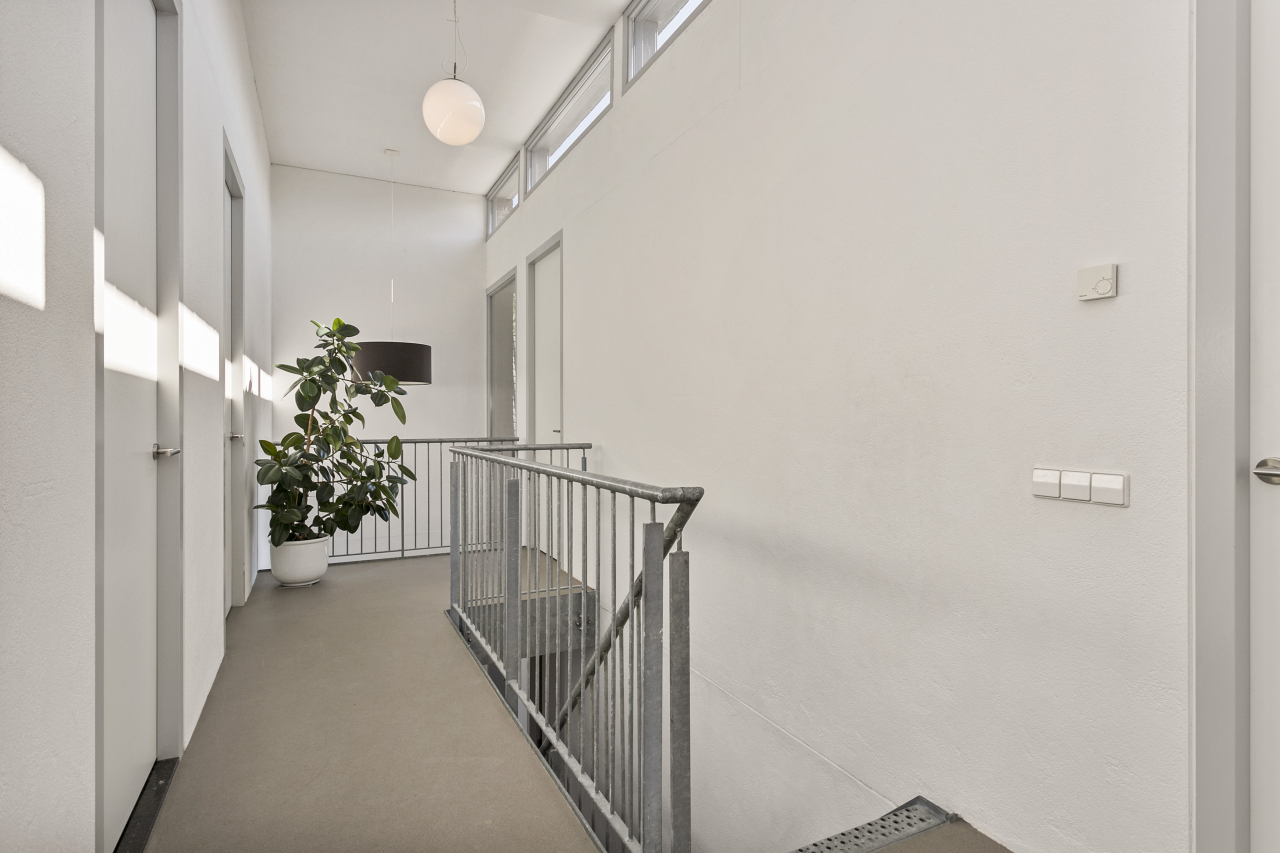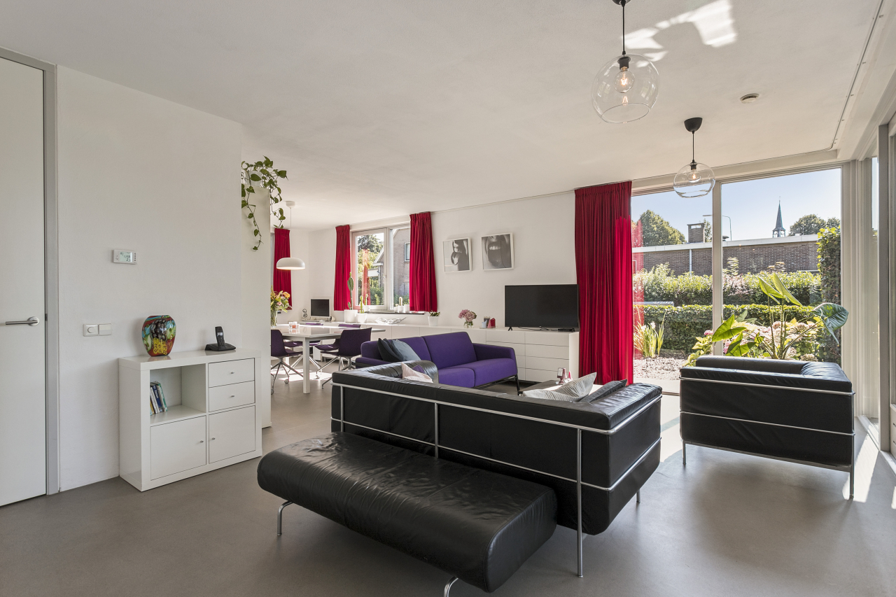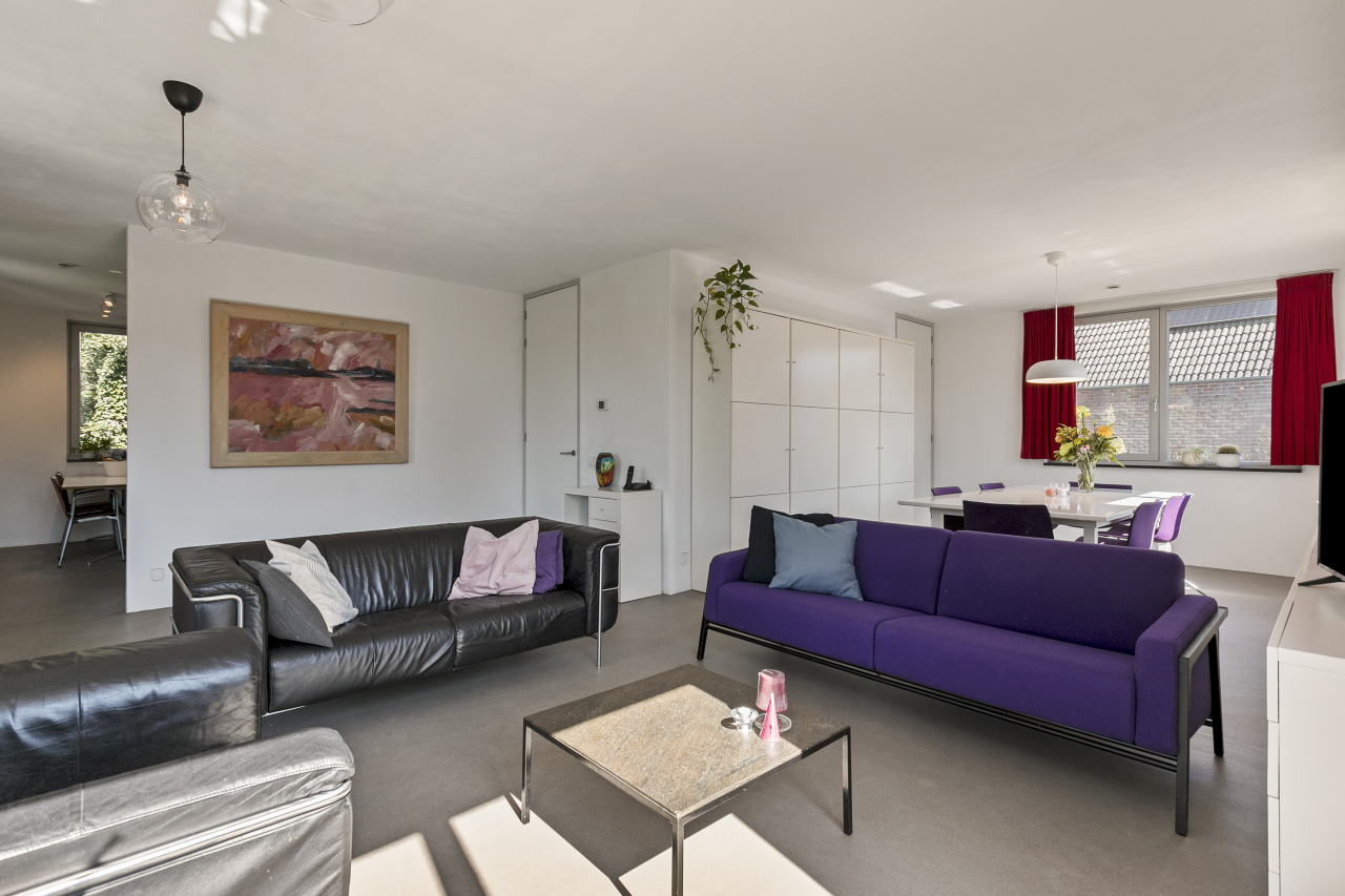 Vanuit de lichte, centrale hal met vide, meterkast, garderobe, trapopgang en modern toilet met fonteintje zijn alle ruimtes op de begane grond bereikbaar. In de royale L-vormige woonkamer aan de voorzijde ligt zoals in het gehele huis, een strakke epoxytroffel vloer met comfortabele vloerverwarming. Er zijn diverse grote ramen bij de eethoek met zicht op de groene tuin.