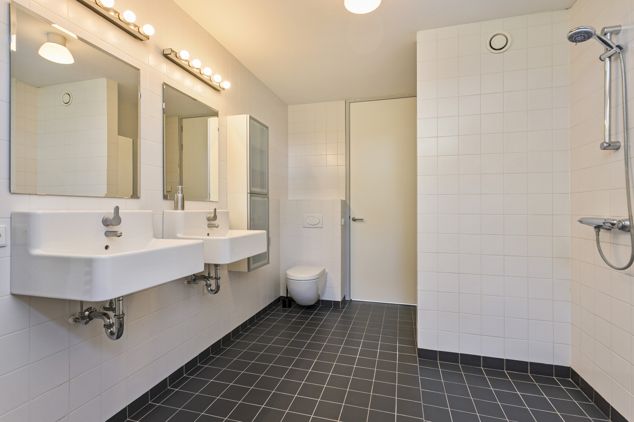 Slaapkamer 3 aan de achterzijde heeft openslaande deuren naar het balkon, een inbouwkast en hoog plafond. De volledig betegelde, moderne badkamer ook aan de achterzijde is ingericht met een dubbele wastafel, royale inloop douche met 3 douche kranen, designradiator en 2e hangend toilet.