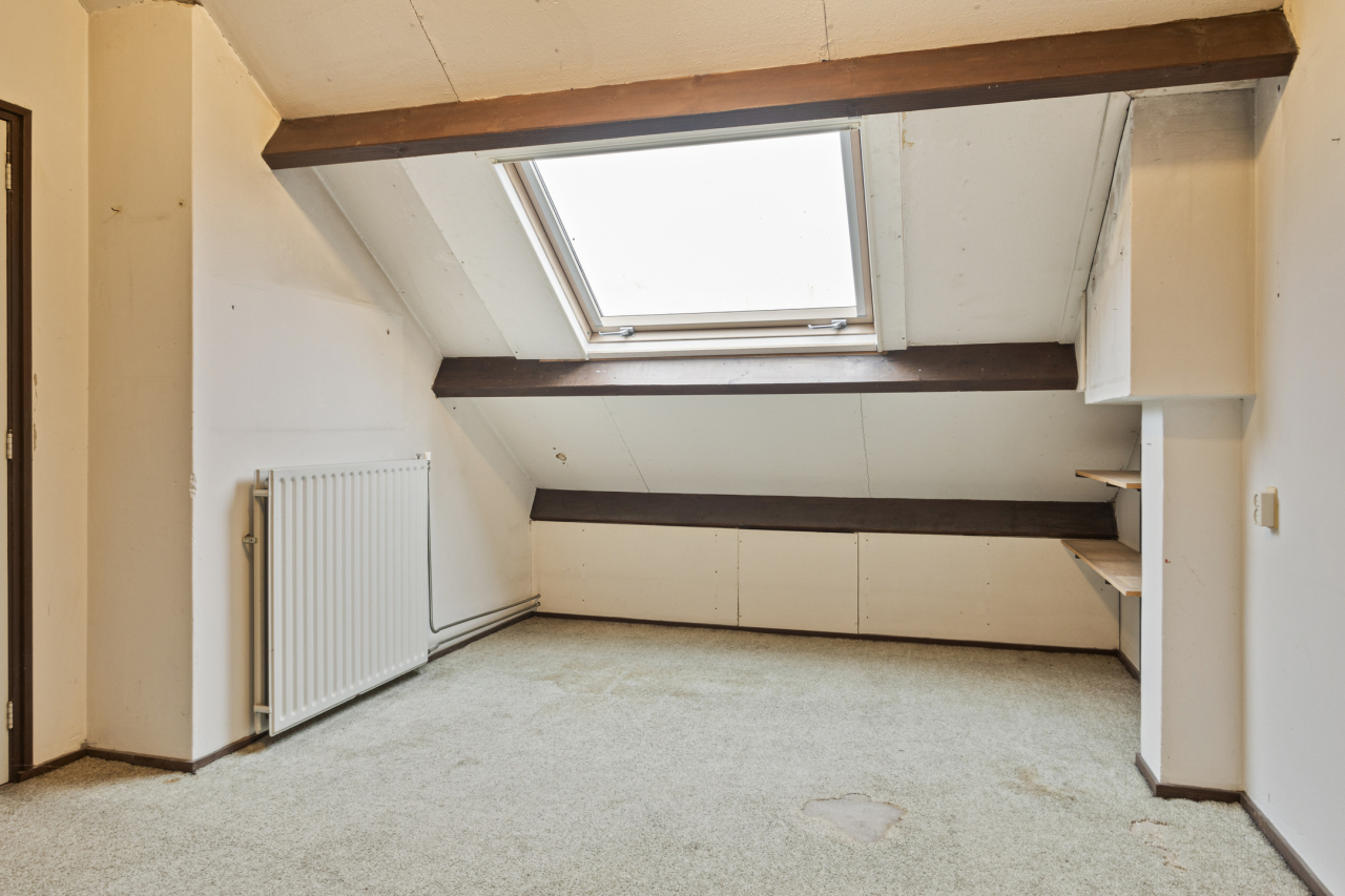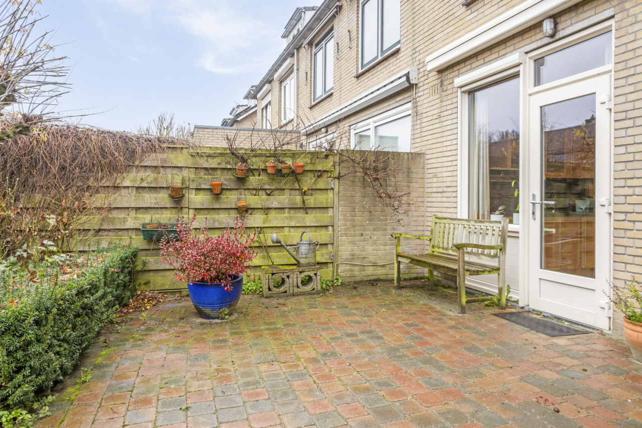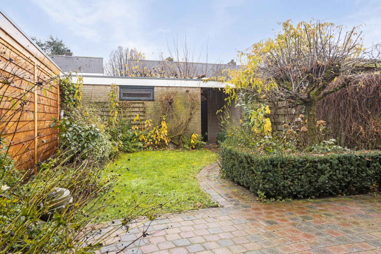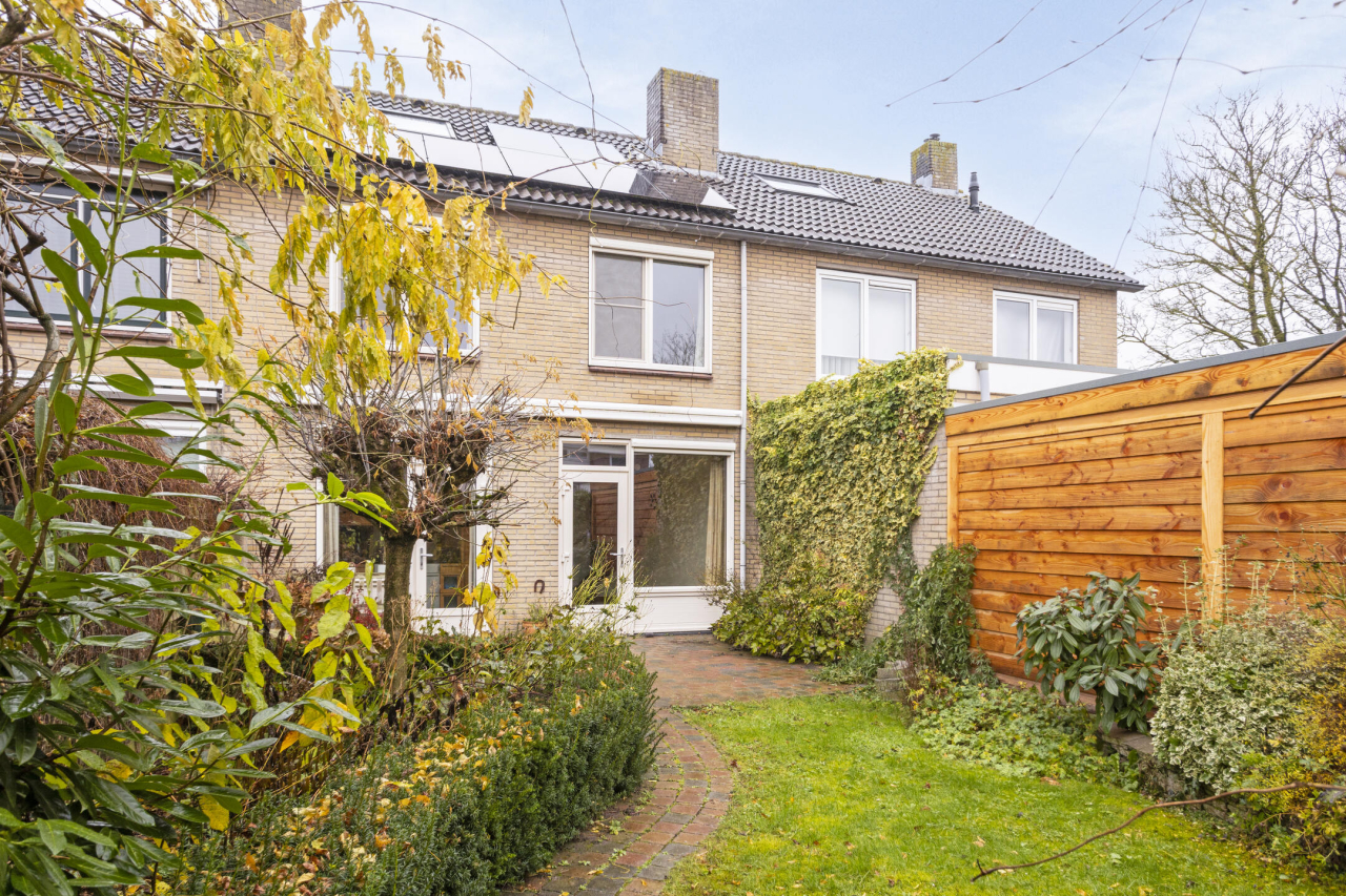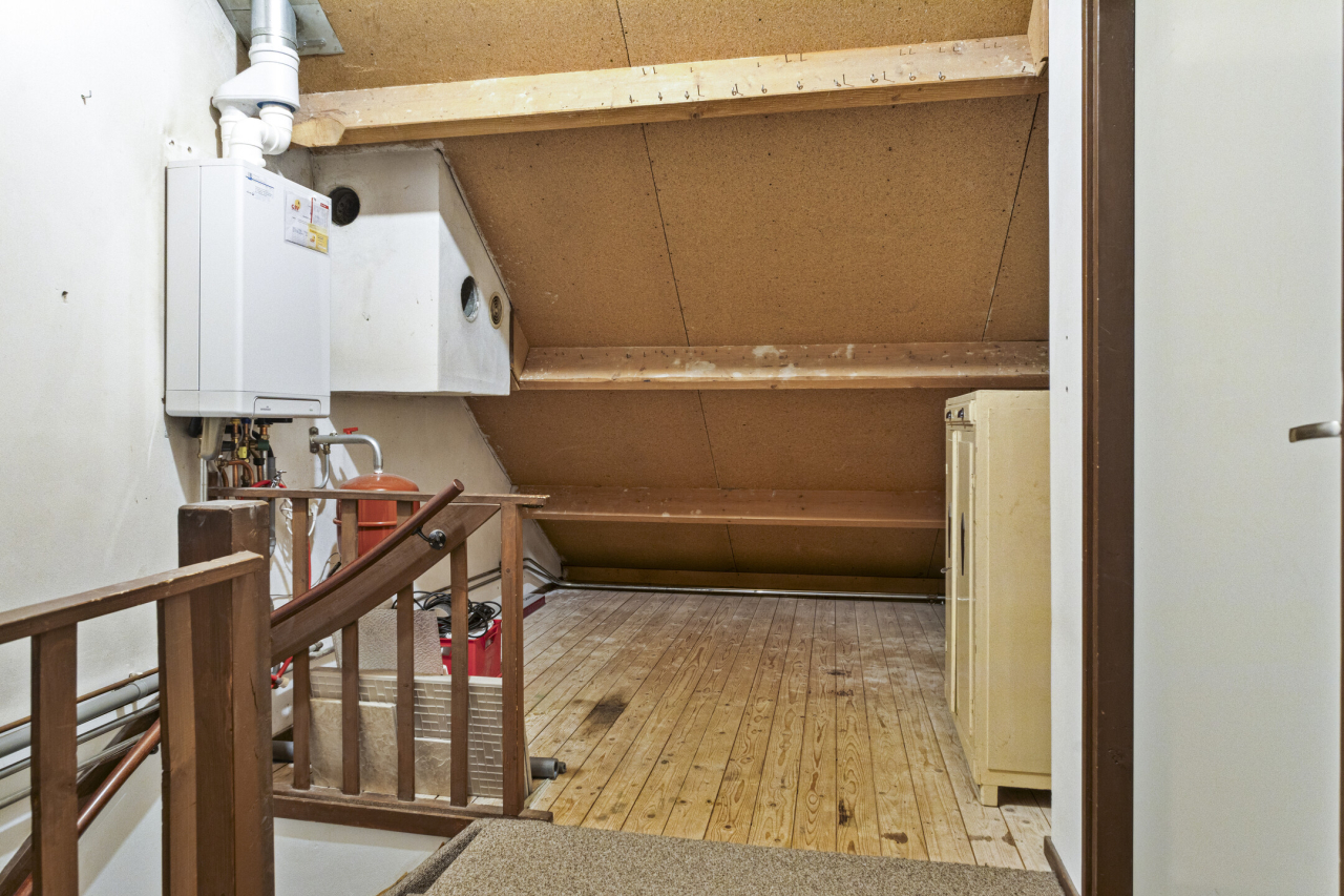Via een vaste trap is de 2e verdieping bereikbaar met de 4e slaapkamer met groot Veluxraam met hor en bergruimte achter de knieschotten. Op de voorzolder is de witgoedaansluiting en hangt de Remeha CV HR ketel (2020). Achter de woning ligt een zonnige groene tuin met een groot terras direct achter de woning met sierbestrating. Verder borders met beplanting en struiken. Achterin de tuin staat een stenen berging en is een achterom.