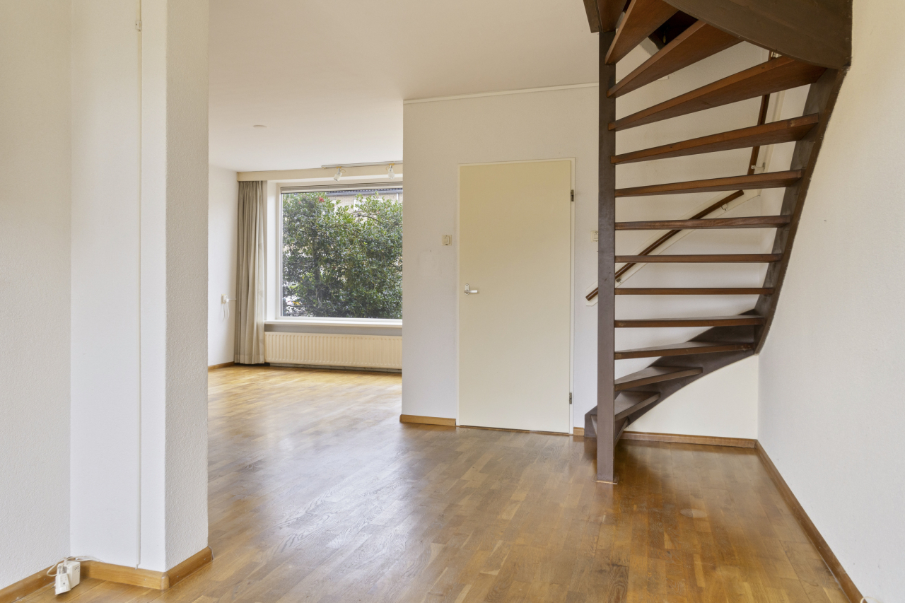 De overdekte entree van de woning is aan de voorzijde. Vanuit de hal met garderobe, meterkast met o.a. de omvormer van de zonnepanelen en toilet met fonteintje is de woonkamer bereikbaar. De lichte woonkamer met voor en achter grote ramen is voorzien van een lamel parketvloer. Aan de achterzijde is de eethoek met zicht op de zonnige tuin op het Zuidoosten. Er is aan de buitenzijde voor een elektrisch rolluik en achterzijde een elektrisch zonnescherm. Aan de achterzijde van de woonkamer is een tuindeur en deur naar de keuken. De keuken met tegelvloer heeft een granieten aanrechtblad in L-vorm met spoelbak en inbouwapparatuur zoals: een ATAG 6 pits inductiekookplaat, afzuigschouw, Siemens oven, Siemens koelvriescombinatie, Siemens vaat wasser en een close-boiler voor snel warm water.