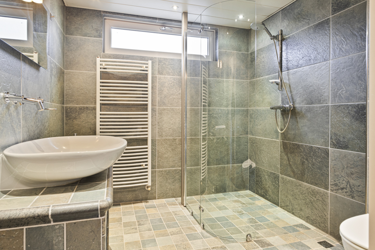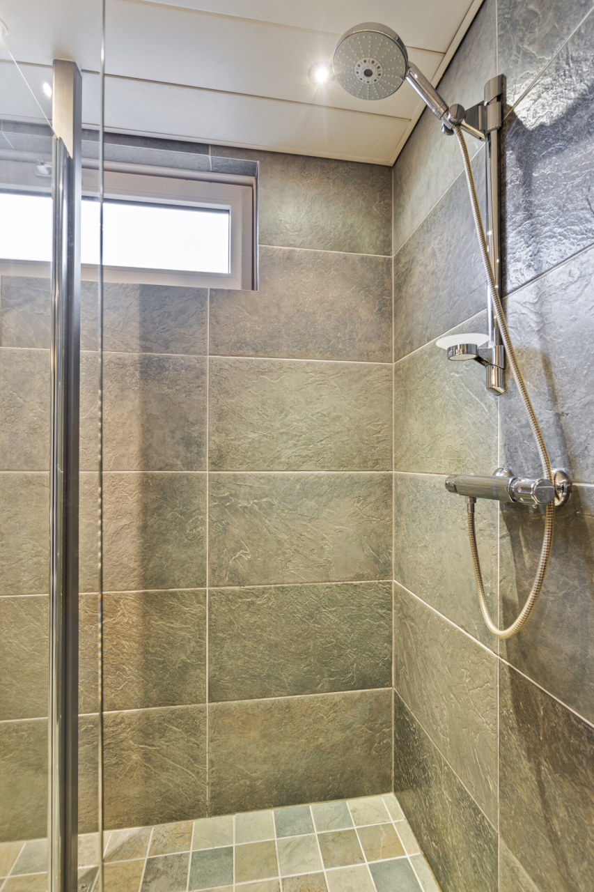 De slaapkamers aan de achterzijde met vinylvloer zijn ook voorzien van grote ramen met een elektrische screen. De volledig betegelde fraaie badkamer is ingericht met inloopdouche, breed wastafelmeubel , designradiator en 2e (hangend) toilet. Het plafond is voorzien van inbouwspots.