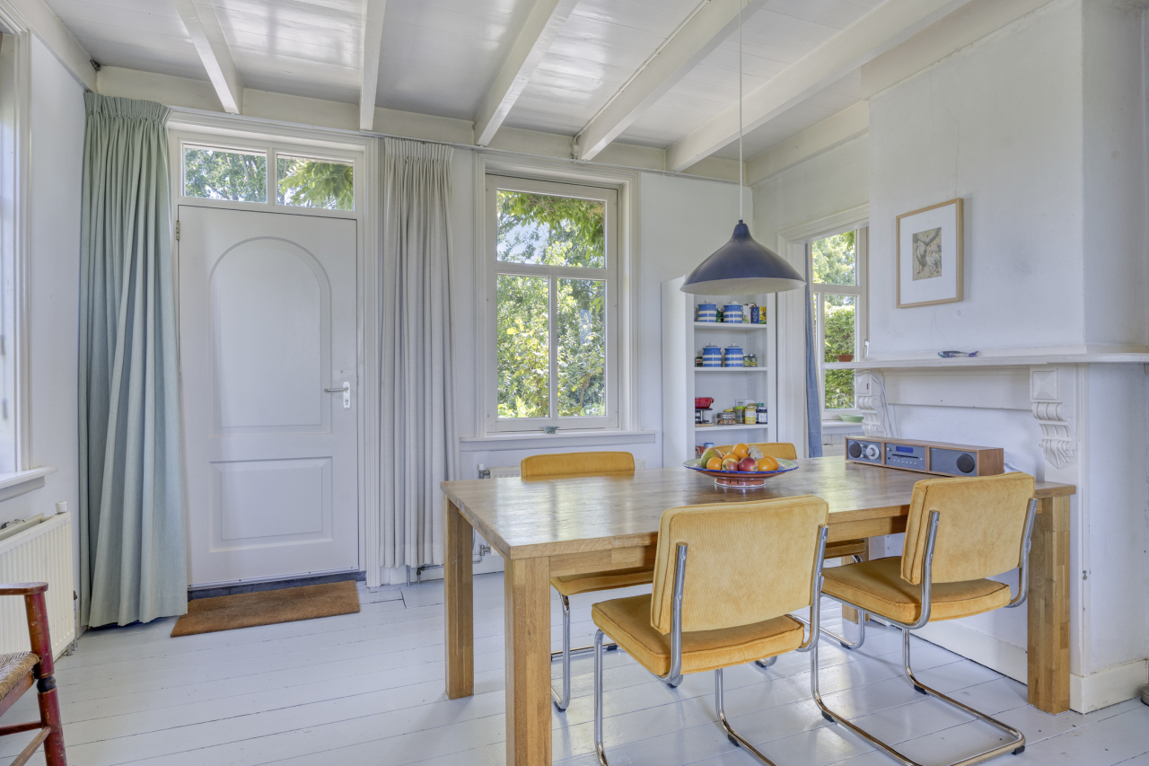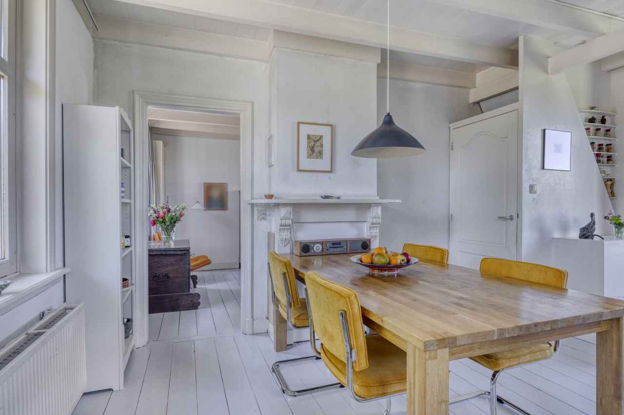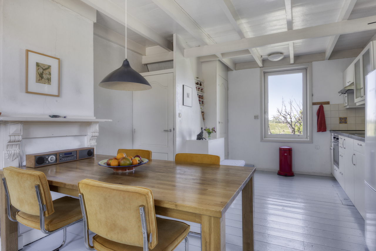 De sfeervolle woonkeuken met balkenplafond is voorzien van een licht geschilderde houten vloer en aan de voorzijde ramen met roedeverdeling. Aan de achterzijde is de trap naar het souterrain en de trap naar de 1e verdieping. Aan de voorzijde in de woonkeuken bij de schouw staat de eethoek en aan de achterzijde is de keukenopstelling. Deze is voorzien van een granieten aanrechtblad met diverse keukenkasten /lades en inbouwapparatuur zoals een Siemens 4 pits inductiekookplaat, Siemens oven en Inventum afzuigkap. Het grote raam aan de achterzijde kijkt fraai uit over de uiterwaarden. Via een doorgang in de woonkeuken is de woonkamer bereikbaar met aan de voorzijde ramen met roedeverdeling en naast het raam de meterkast. De woonkamer is ook voorzien van een licht geschilderde houten vloer en een karakteristiek balkenplafond. Vanuit de zithoek aan de achterzijde is ook bijzonder mooi uitzicht over de uiterwaarden.