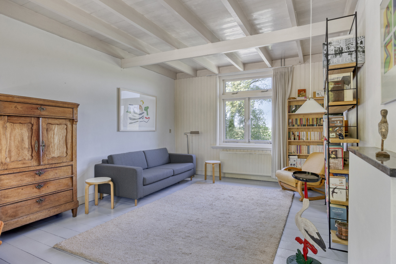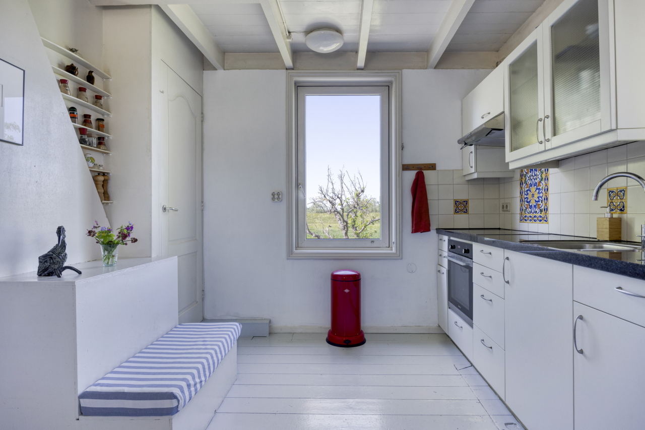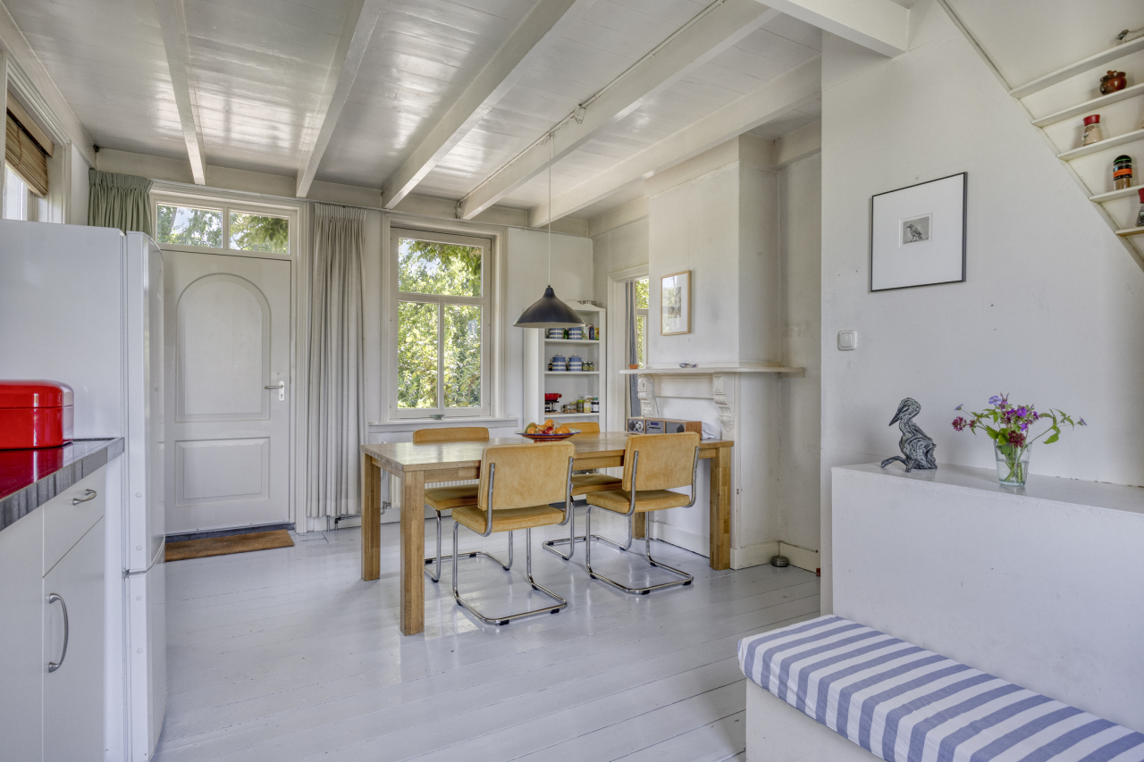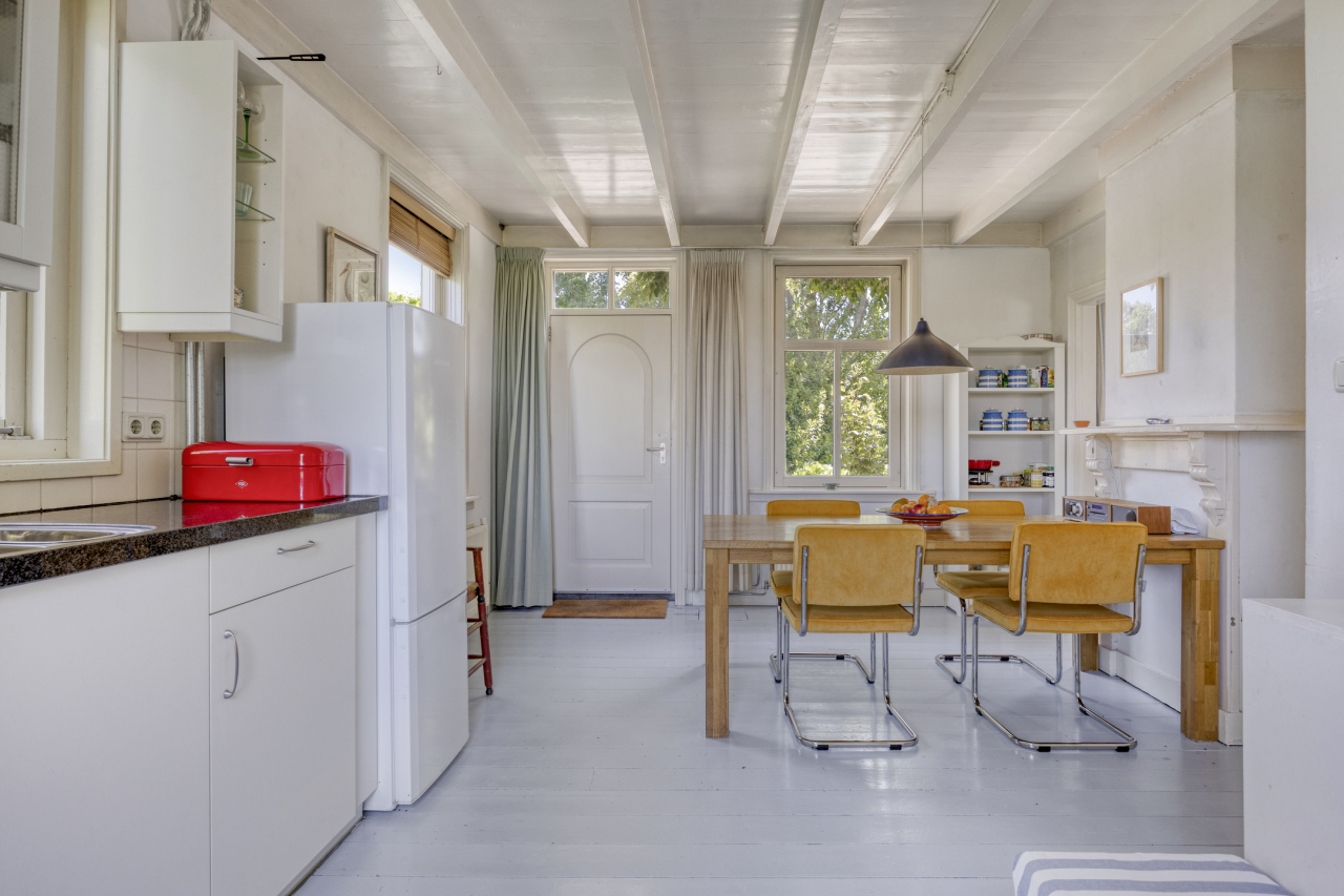 De sfeervolle woonkeuken met balkenplafond is voorzien van een licht geschilderde houten vloer en aan de voorzijde ramen met roedeverdeling. Aan de achterzijde is de trap naar het souterrain en de trap naar de 1e verdieping. Aan de voorzijde in de woonkeuken bij de schouw staat de eethoek en aan de achterzijde is de keukenopstelling. Deze is voorzien van een granieten aanrechtblad met diverse keukenkasten /lades en inbouwapparatuur zoals een Siemens 4 pits inductiekookplaat, Siemens oven en Inventum afzuigkap. Het grote raam aan de achterzijde kijkt fraai uit over de uiterwaarden. Via een doorgang in de woonkeuken is de woonkamer bereikbaar met aan de voorzijde ramen met roedeverdeling en naast het raam de meterkast. De woonkamer is ook voorzien van een licht geschilderde houten vloer en een karakteristiek balkenplafond. Vanuit de zithoek aan de achterzijde is ook bijzonder mooi uitzicht over de uiterwaarden.