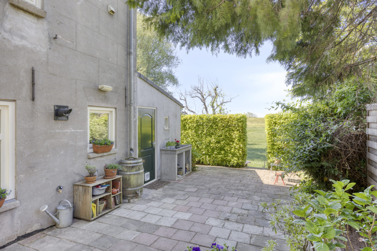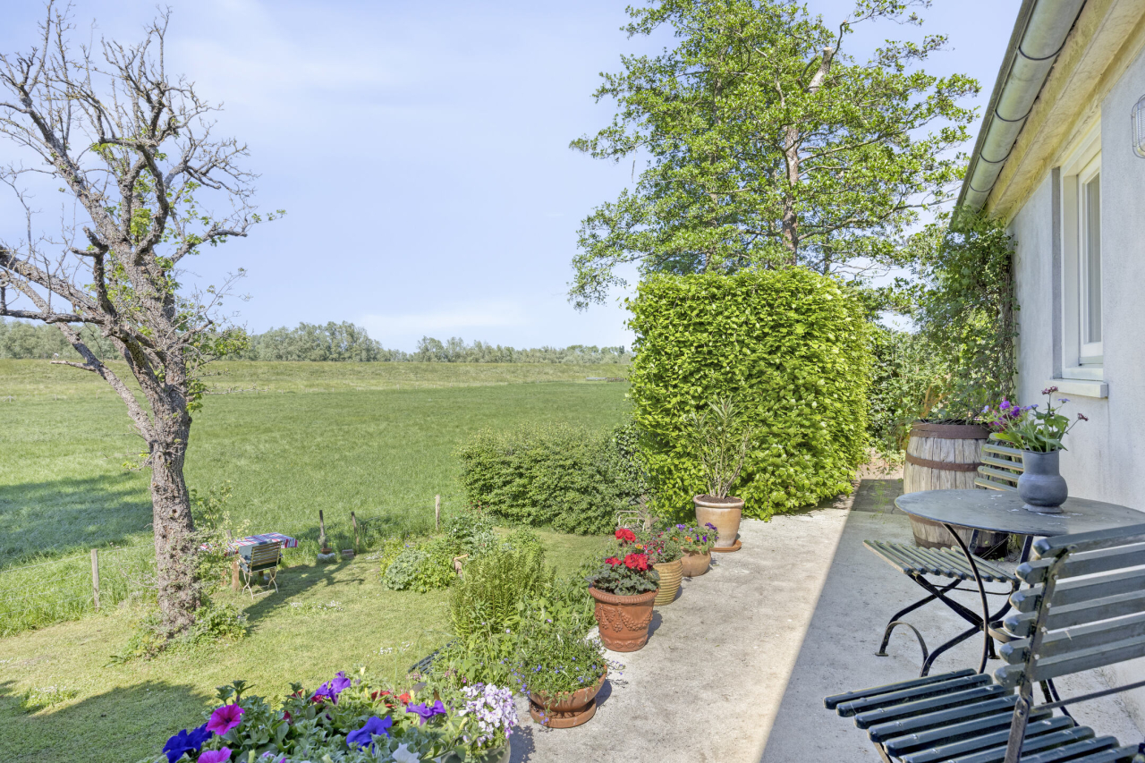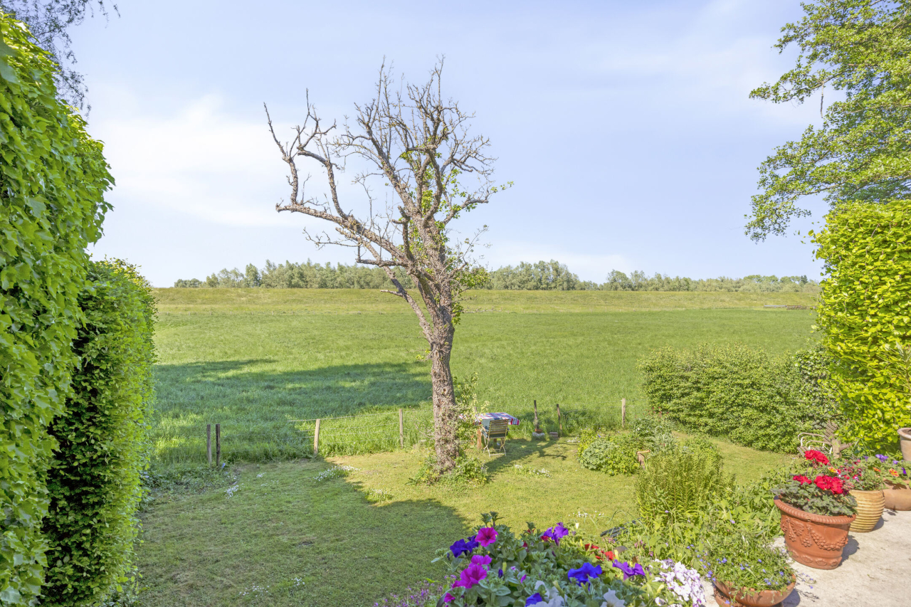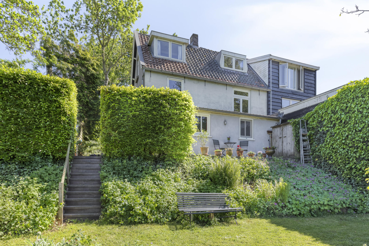 Achter en naast de woning ligt een heerlijke tuin met een groot terras bereikbaar via de tuindeur in het souterrain en via de trap naast de woning. De zijtuin is grotendeels bestraat en voorzien van borders en groene hagen. Achter de uitbouw is een fijn zitje met een houten bergkast en uitzicht over de diepe tuin en uiterwaarden. Via een trap tussen twee hagen is het laagste niveau van de tuin bereikbaar met een groot gazon en meerdere borders met planten, bomen en struiken. De achtertuin loopt door in de uiterwaarden.