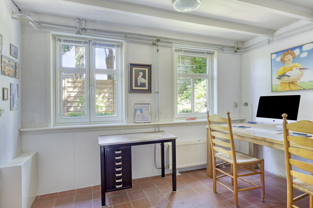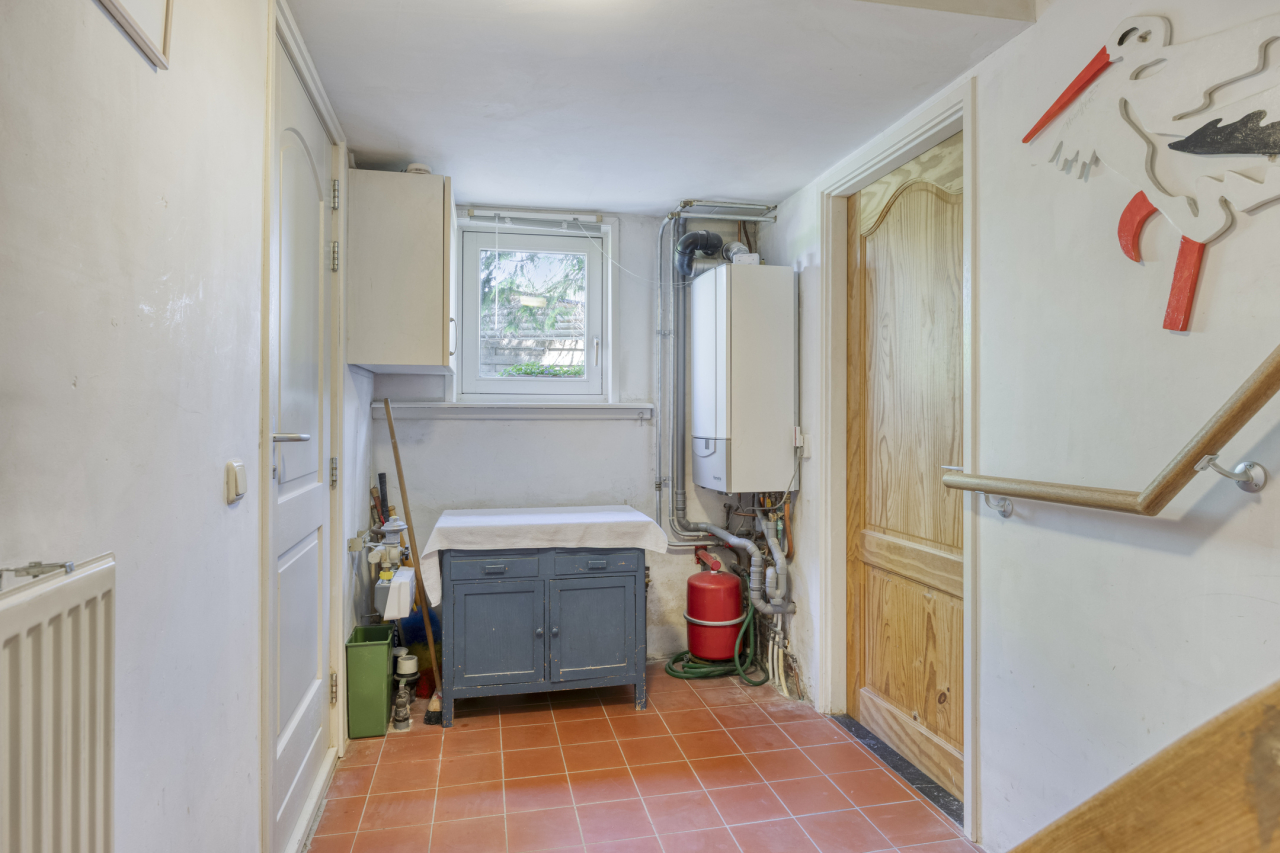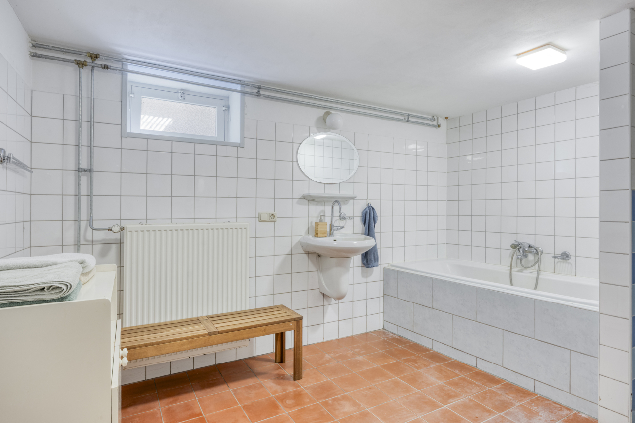 Via een vaste trap met deur in de woonkeuken is het souterrain bereikbaar met een ruime hal met plavuizen. Hier bevinden zich de witgoedaansluitingen, de Remeha CV HR ketel en het toilet. Aan de voorzijde is een kamer die op dit moment in gebruik is als werkkamer. Deze is voorzien van 2 ramen met roedeverdeling en een schouw met houtkachel. Tevens aan de voorzijde ligt de royale en volledig betegelde badkamer met een ligbad, aparte douche en een wastafel. Voor extra ventilatie en daglicht is een klapraam aanwezig. Aan de achterzijde is de uitbouw met een grote tuin/ slaapkamer. Deze is voorzien van twee grote ramen waardoor deze heerlijk licht is en er is tevens een (paneel)deur naar buiten.
