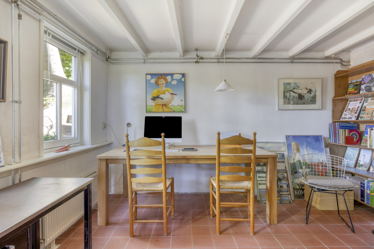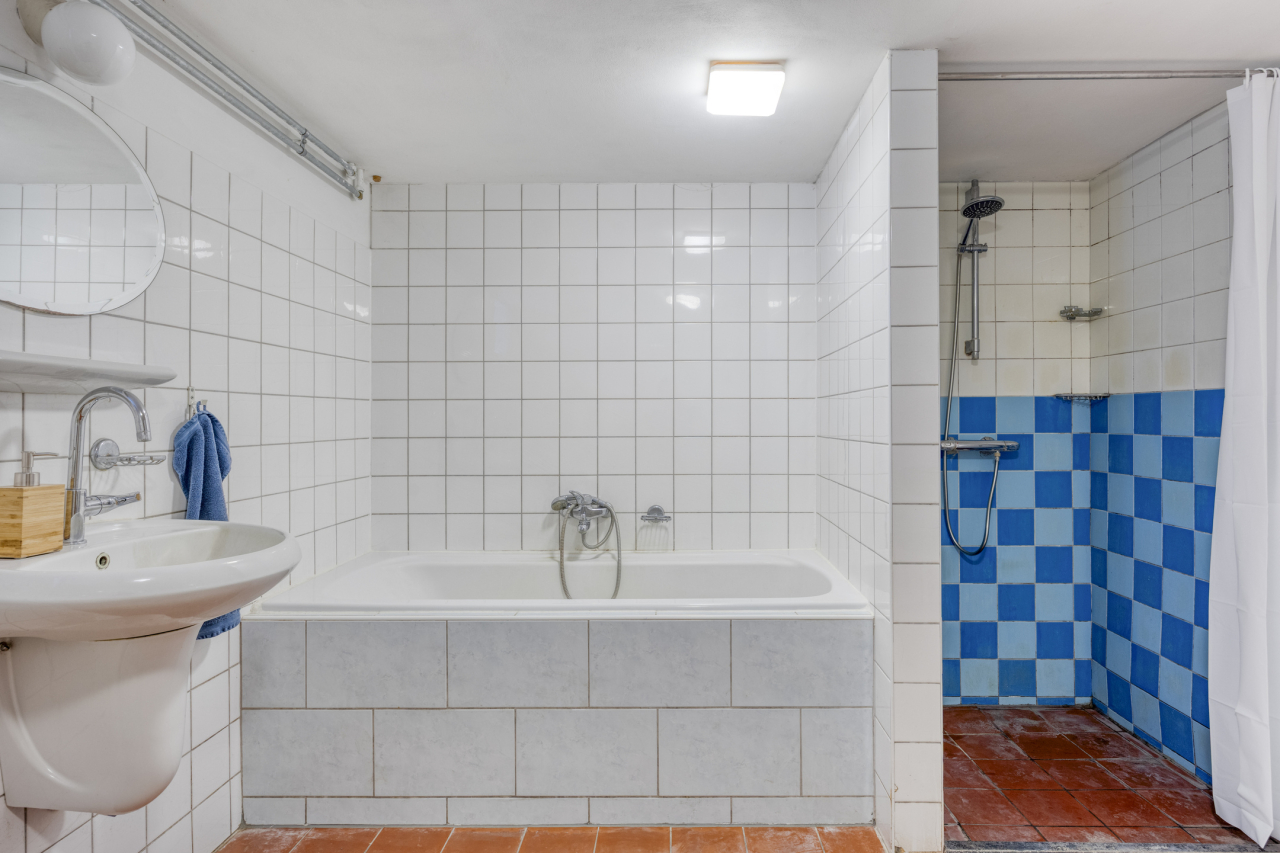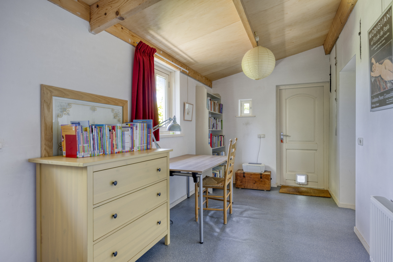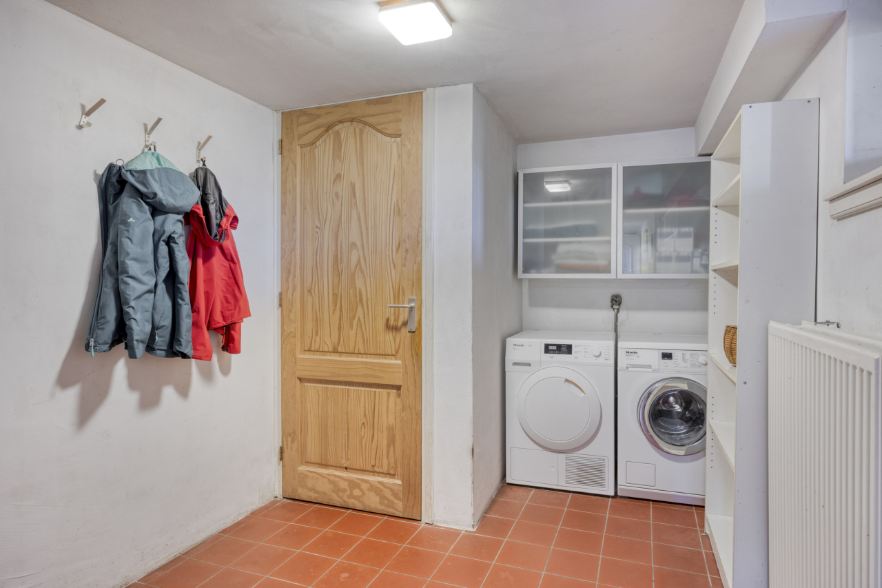 Via een vaste trap met deur in de woonkeuken is het souterrain bereikbaar met een ruime hal met plavuizen. Hier bevinden zich de witgoedaansluitingen, de Remeha CV HR ketel en het toilet. Aan de voorzijde is een kamer die op dit moment in gebruik is als werkkamer. Deze is voorzien van 2 ramen met roedeverdeling en een schouw met houtkachel. Tevens aan de voorzijde ligt de royale en volledig betegelde badkamer met een ligbad, aparte douche en een wastafel. Voor extra ventilatie en daglicht is een klapraam aanwezig. Aan de achterzijde is de uitbouw met een grote tuin/ slaapkamer. Deze is voorzien van twee grote ramen waardoor deze heerlijk licht is en er is tevens een (paneel)deur naar buiten.
