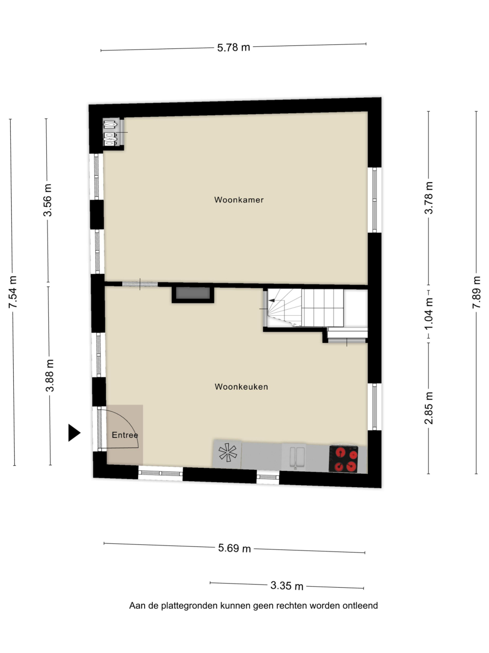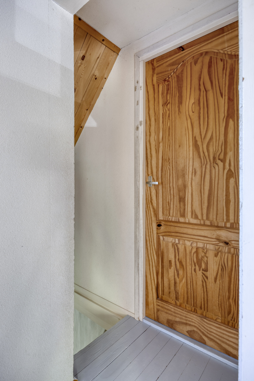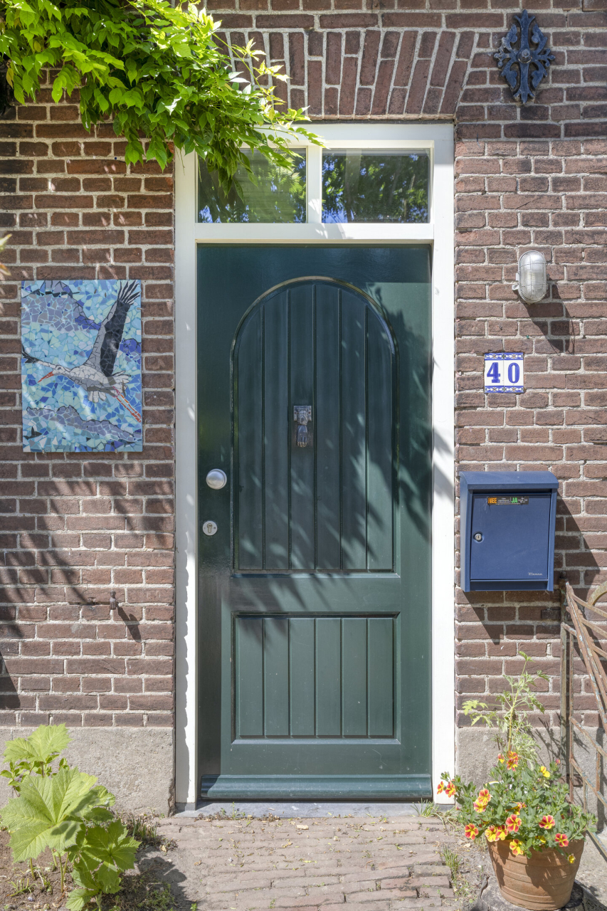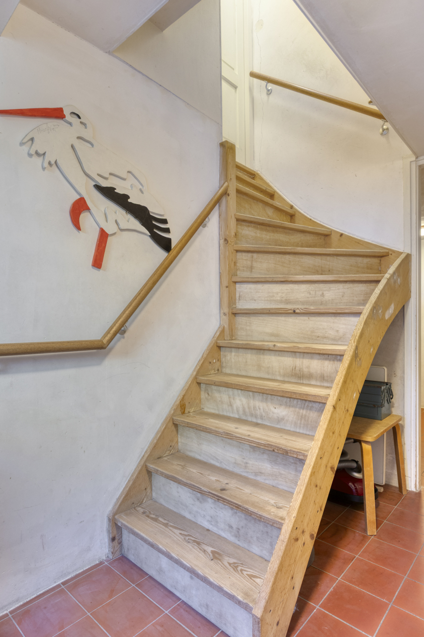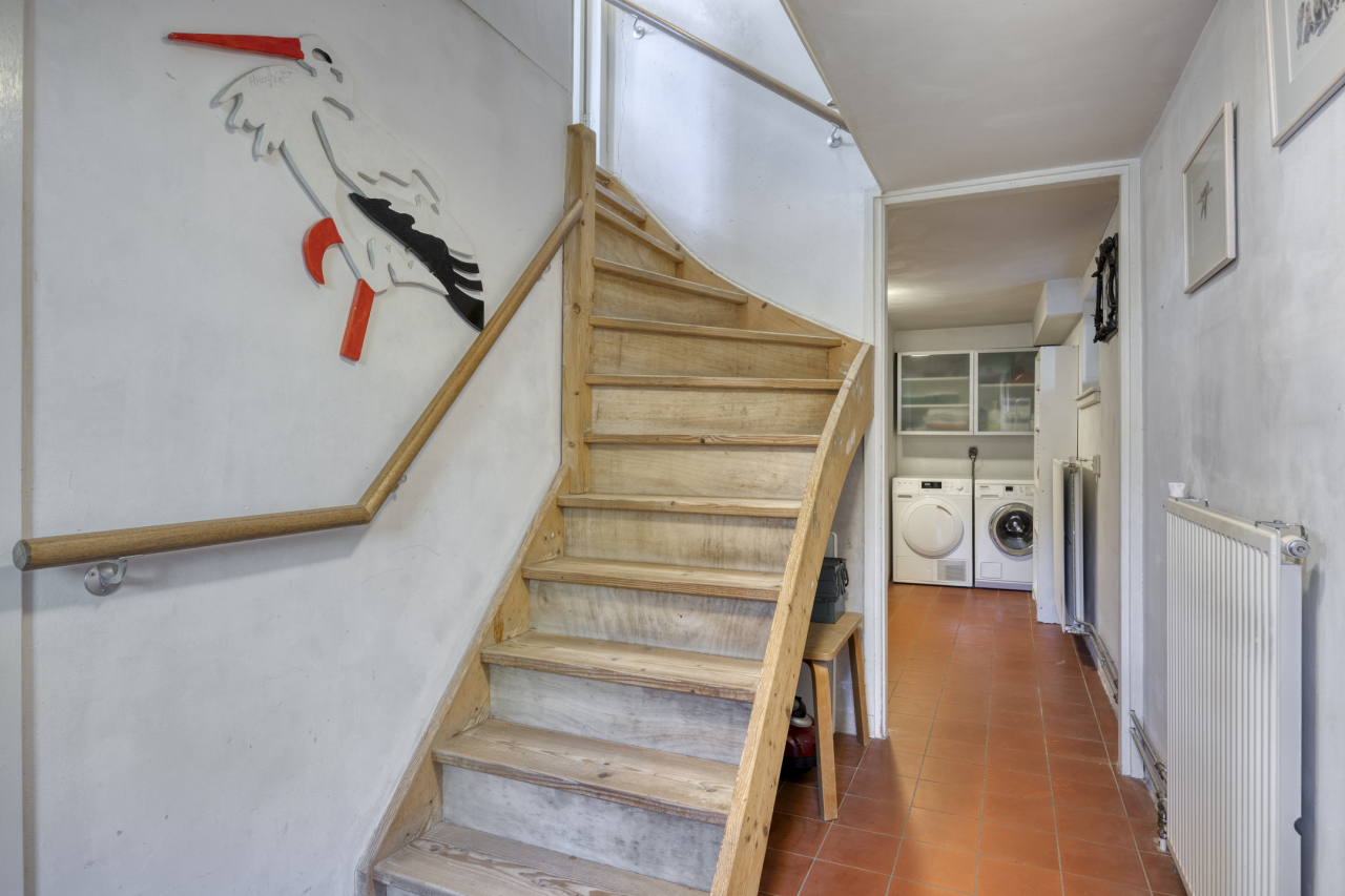 De entree van de woning is aan de voorzijde, via de paneel voordeur met bovenlicht en naast de trap naar de tuin.
