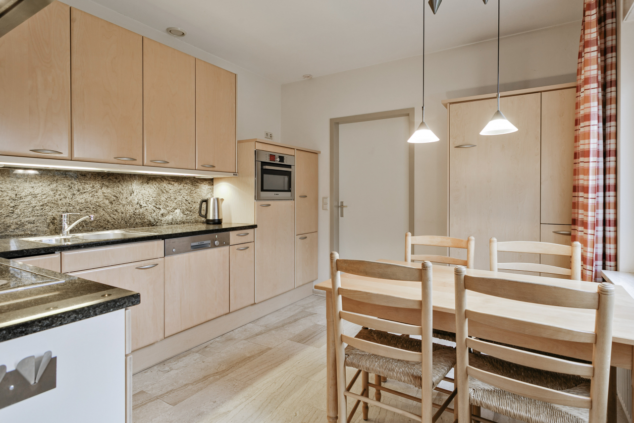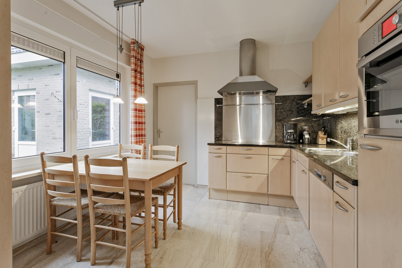 Aan de achterzijde ligt de keuken met aanrechtblad in L- vorm met 1,5 spoelbak en diverse keuken kasten en inbouw-apparatuur zoals: Bosch vaatwasser(2020) en Bosch combi-oven (2020), Miele 4-pits keramische kookplaat, afzuigschouw en Miele koelkast.