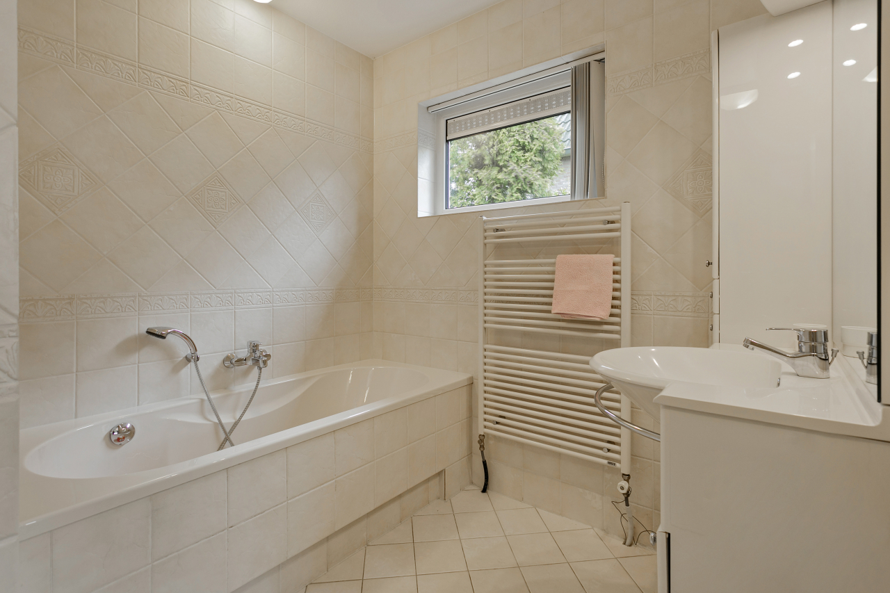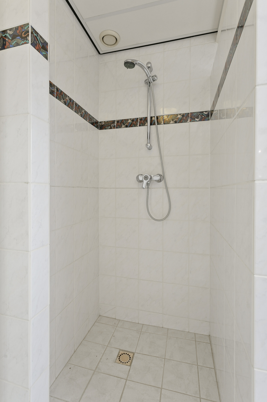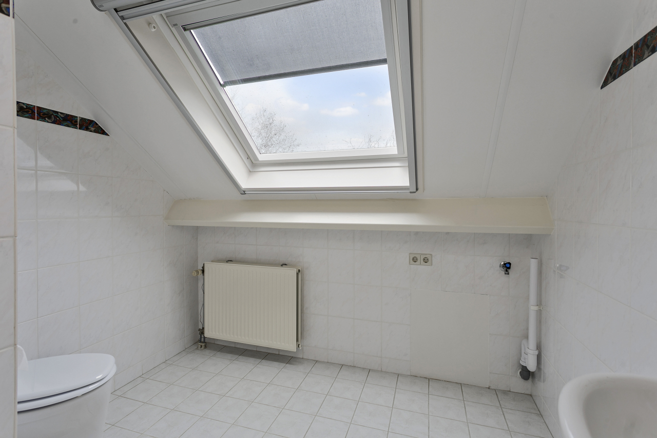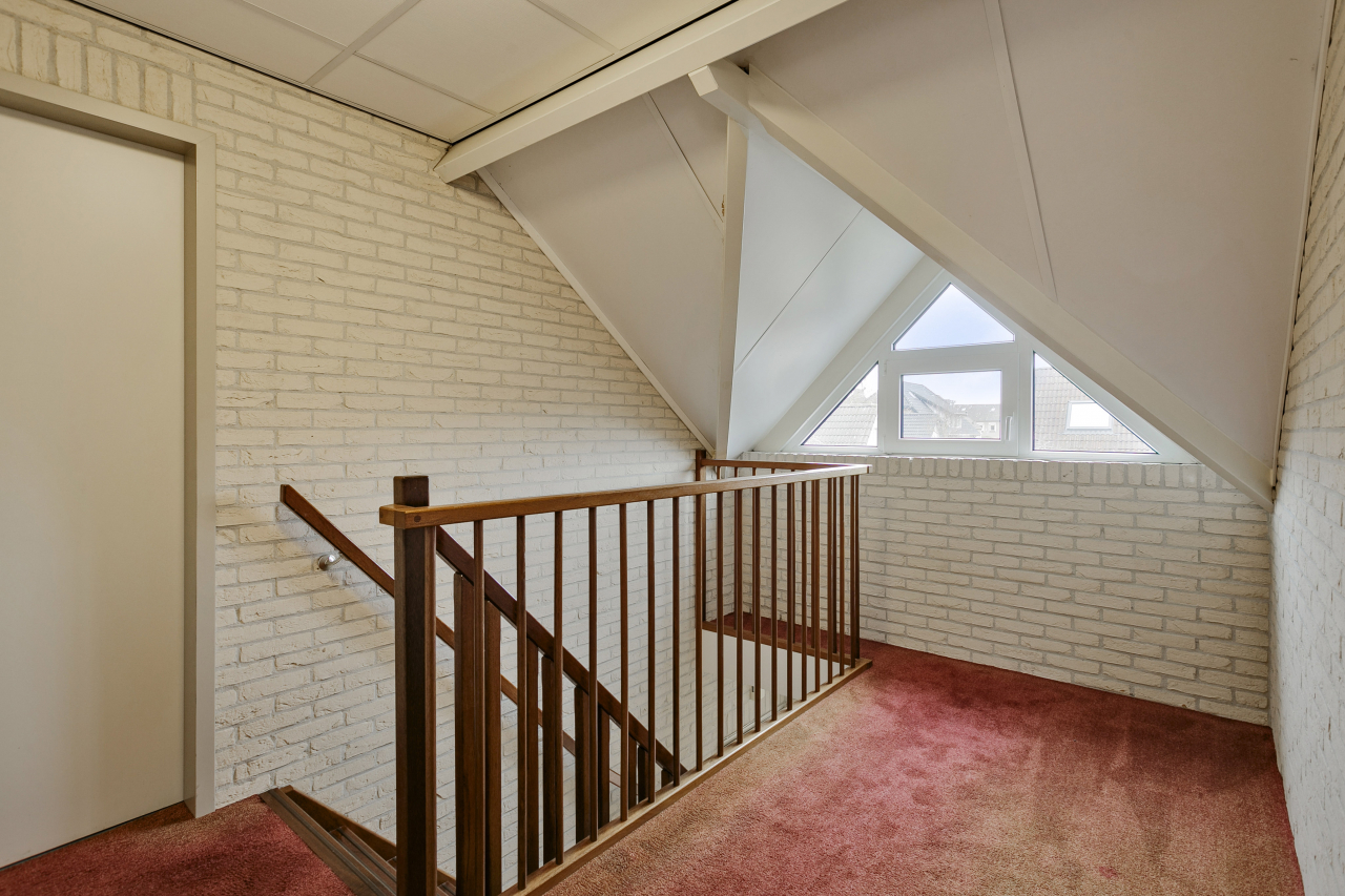 De 1e verdieping is vanuit de hal bereikbaar. Opvallend is de puntvormige dakkapel op de ruime overloop die zorgt voor extra ruimte en licht. Aan de overloop liggen 2 royale slaapkamers en de 2e badkamer. De rechter slaapkamer is voorzien van vloerbedekking, 2 grote dakramen en bergruimte achter de knieschotten. De 2e badkamer, tevens volledig betegeld is voorzien van een wastafel, inloop douche, groot dakraam en 2e toilet.