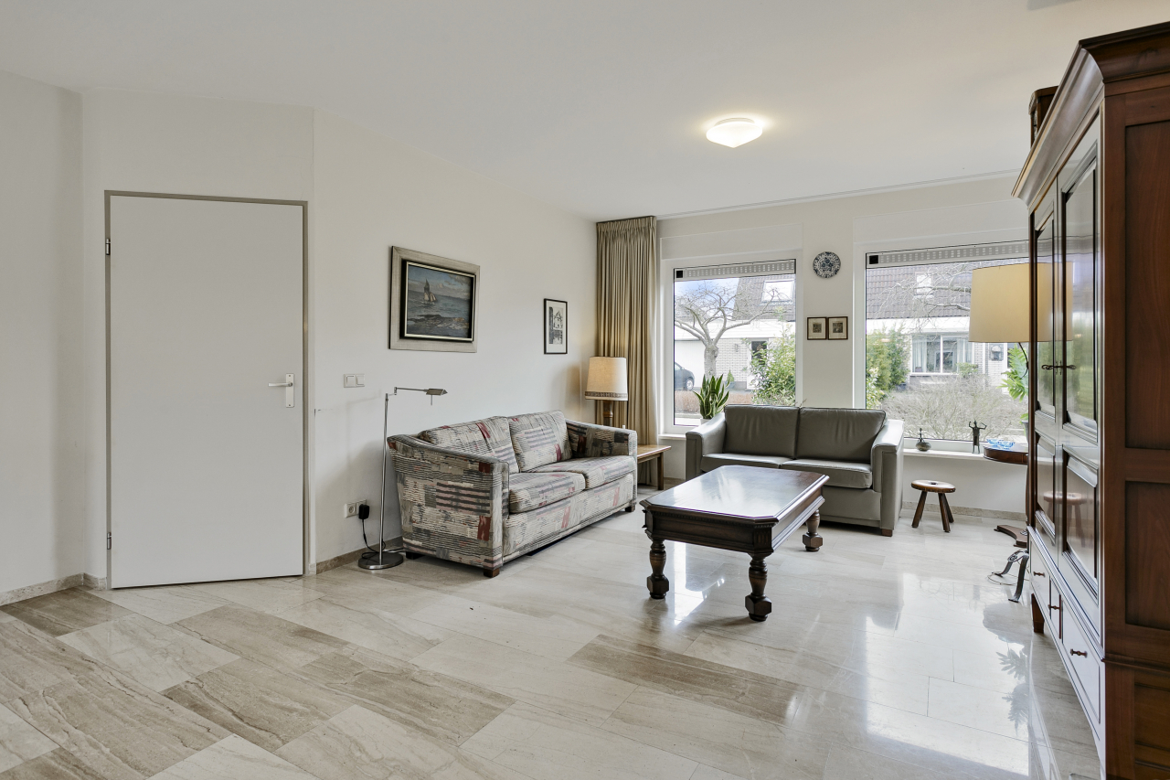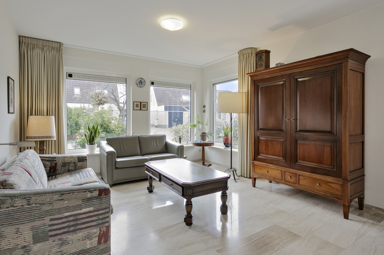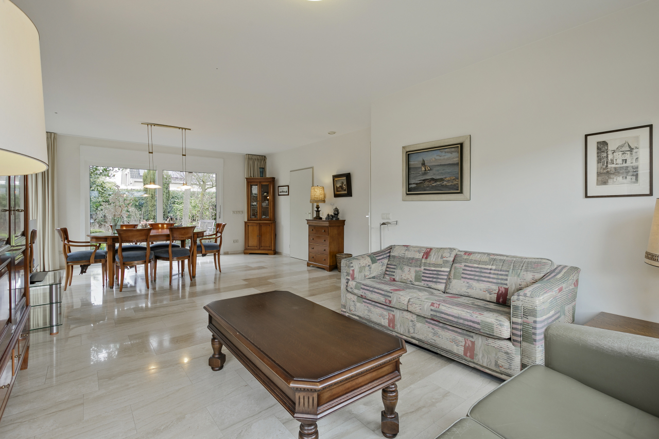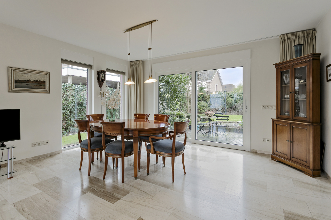 De lichte woonkamer in “L-vorm” is zoals de gehele begane grond voorzien van een mooie marmeren tegelvloer met vloerverwarming. Aan de voorzijde is de zithoek met 3 grote ramen met zicht op de voortuin. Er is een rookkanaal met mogelijkheid voor een sfeervolle gashaard.