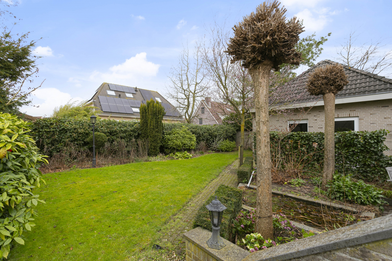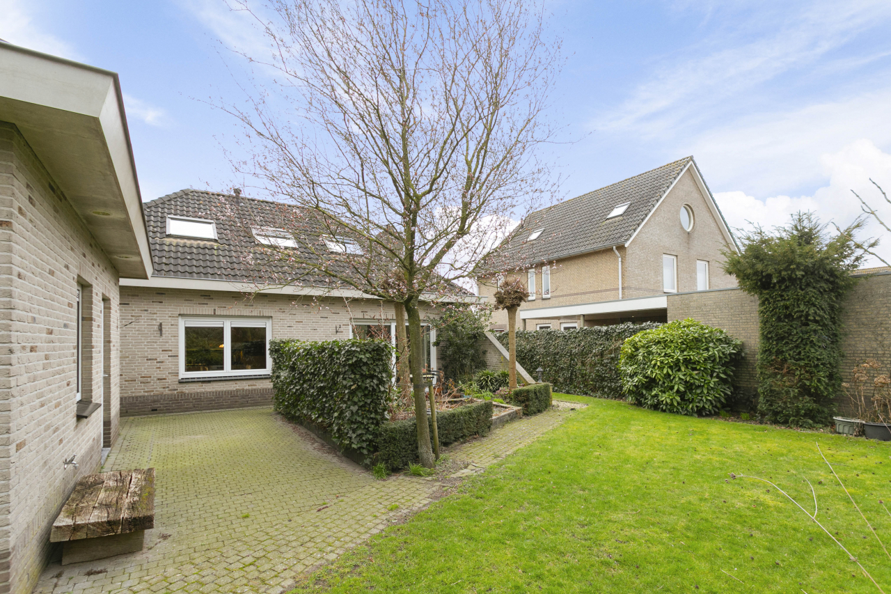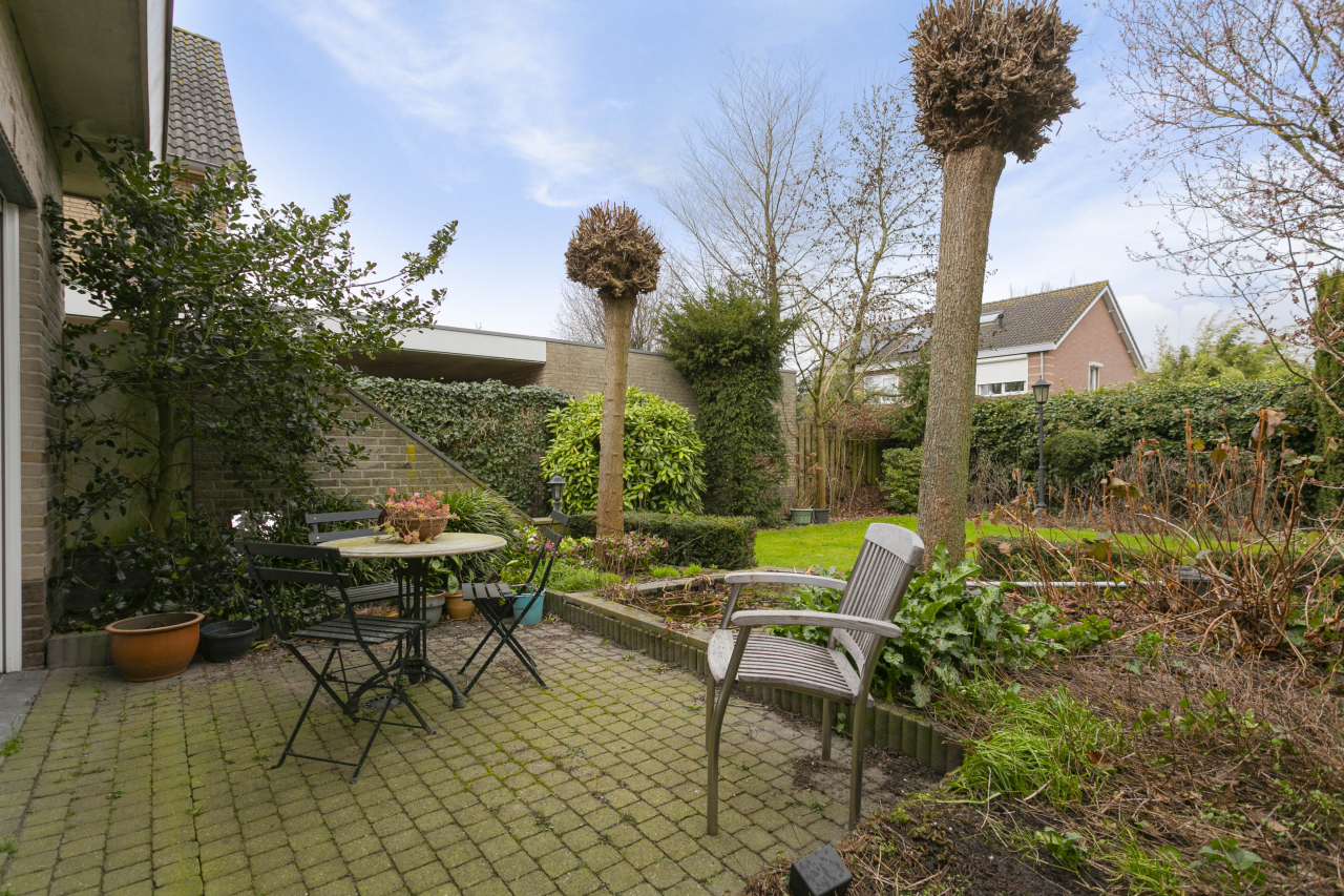 Achter en naast de woning ligt een zonnige tuin op het Westen met een terras bij de schuifpui. Verder is de groen omheinde tuin ingericht met een groot gazon, sierbestrating, siergrind en diverse borders met planten, struiken en sierbomen. Achter de garage staat nog houten tuinhuisje.