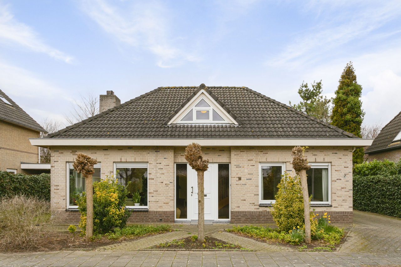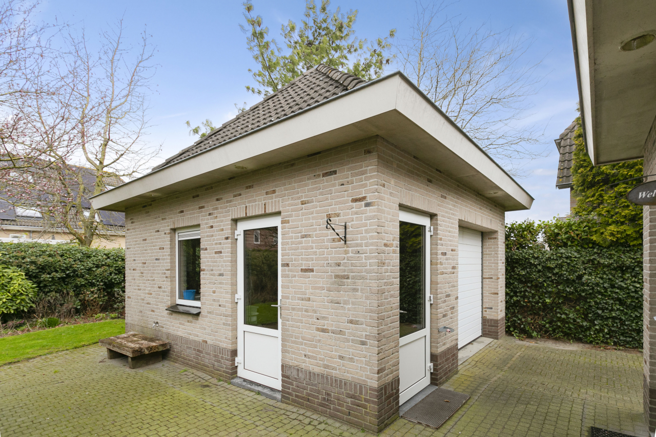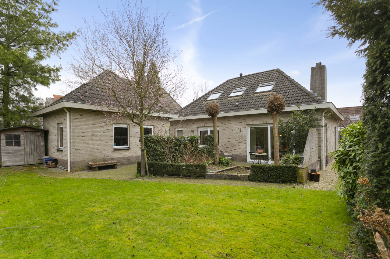 Achter en naast de woning ligt een zonnige tuin op het Westen met een terras bij de schuifpui. Verder is de groen omheinde tuin ingericht met een groot gazon, sierbestrating, siergrind en diverse borders met planten, struiken en sierbomen. Achter de garage staat nog houten tuinhuisje.