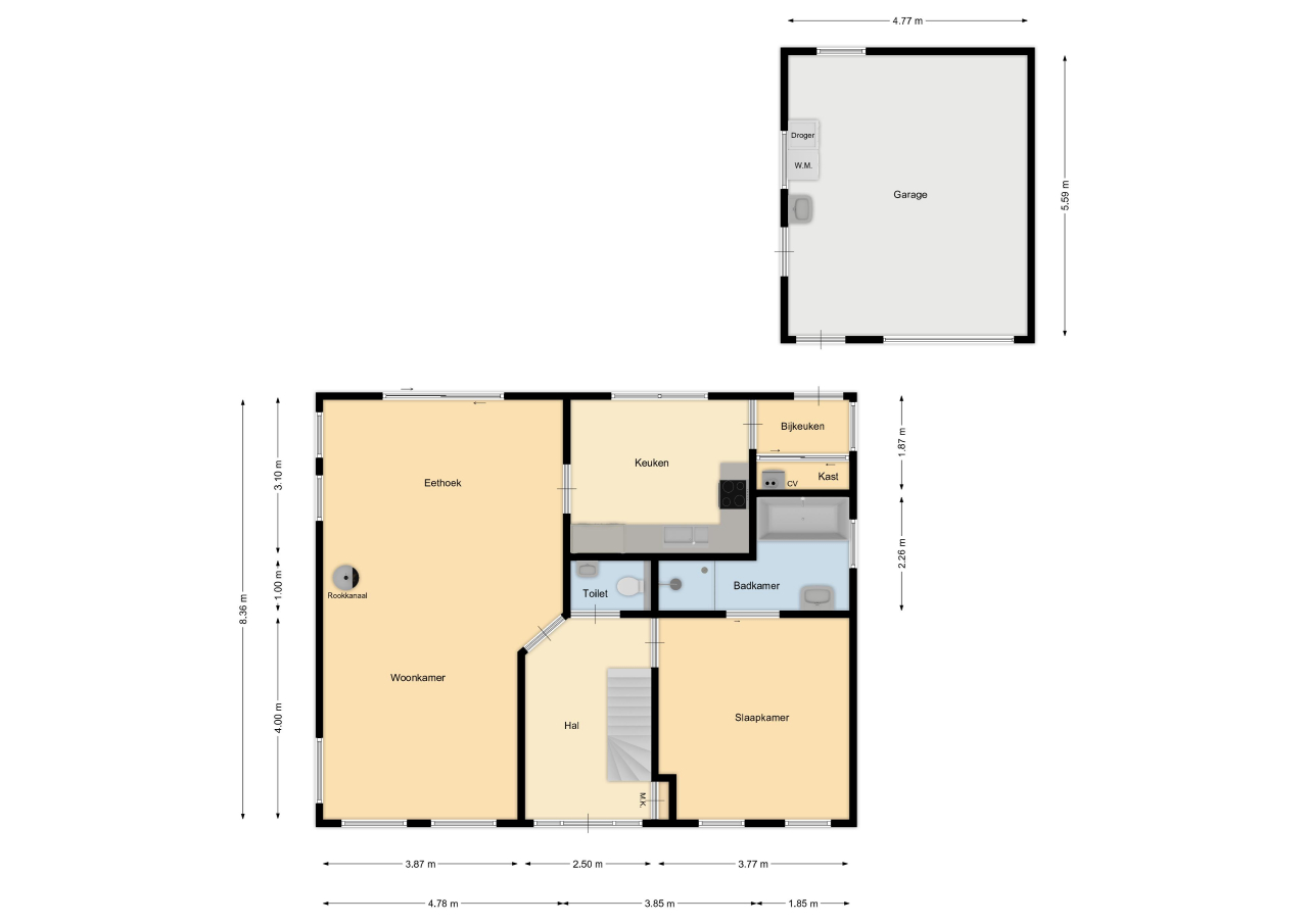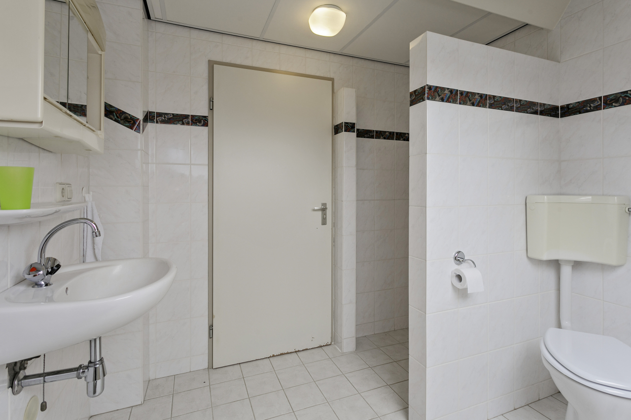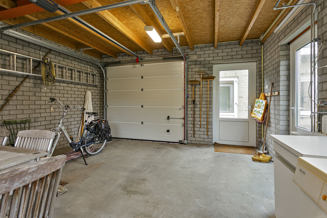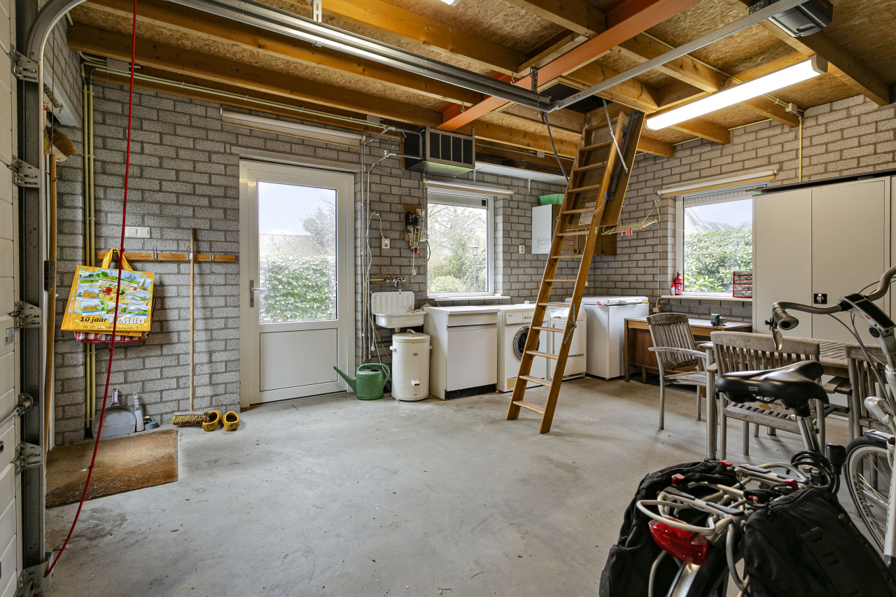 De grote garage met elektrische sectionaaldeur (op afstand bedienbaar) is voorzien van 2 loopdeuren, 2 ramen, stortbak en de witgoed aansluitingen. Via een vlizotrap is de grote bergzolder bereikbaar.