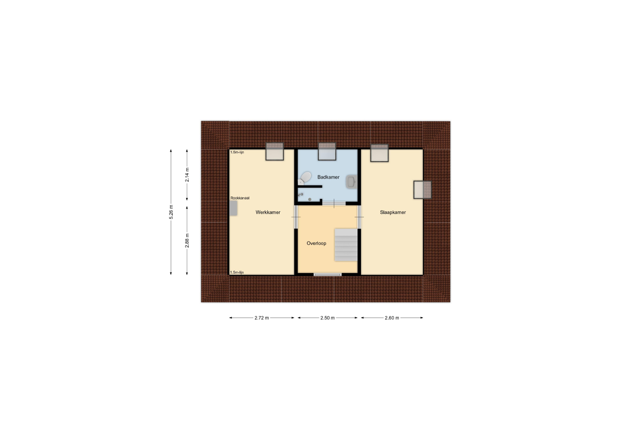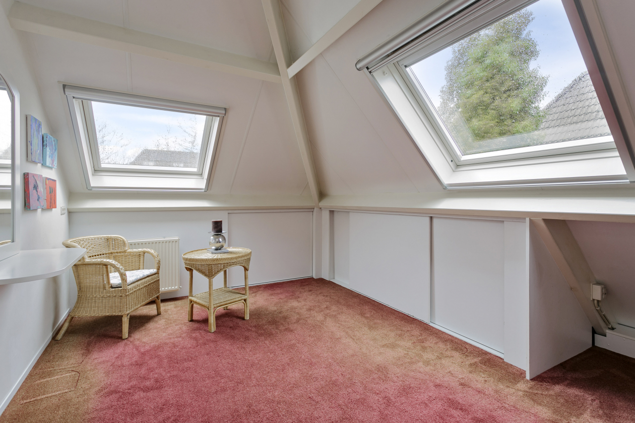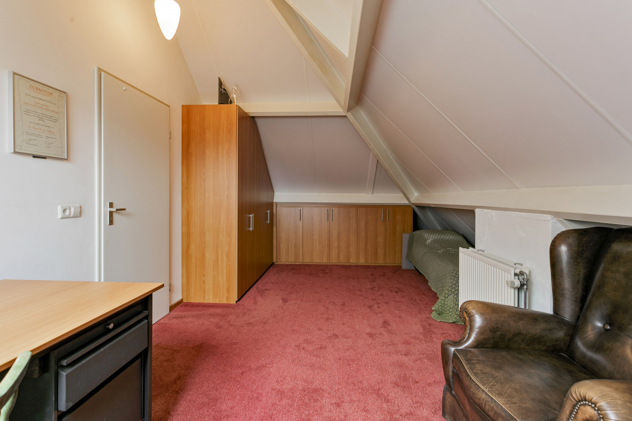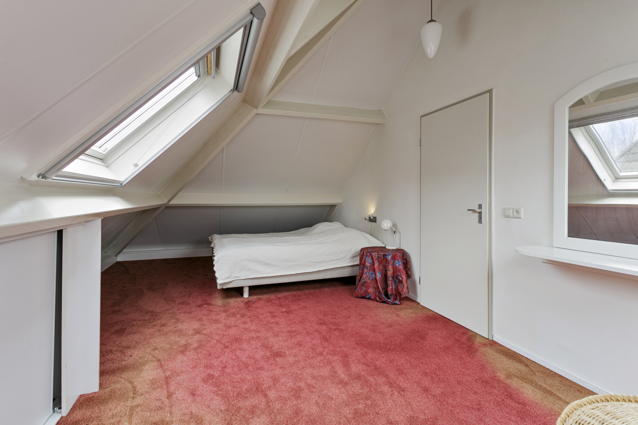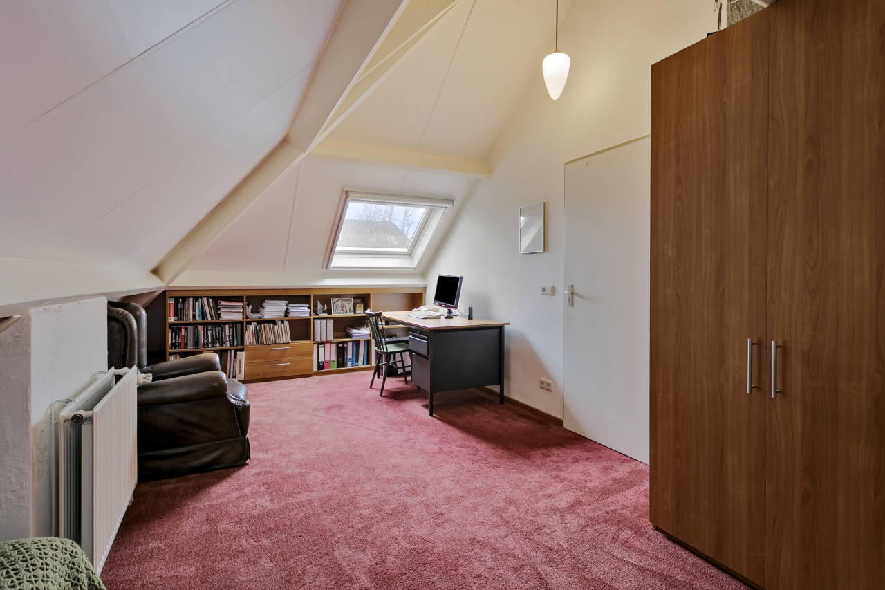 De ruime linker slaapkamer heeft een grote (hoek) inbouwkast en dakraam aan de achterzijde en is in gebruik als werkkamer.