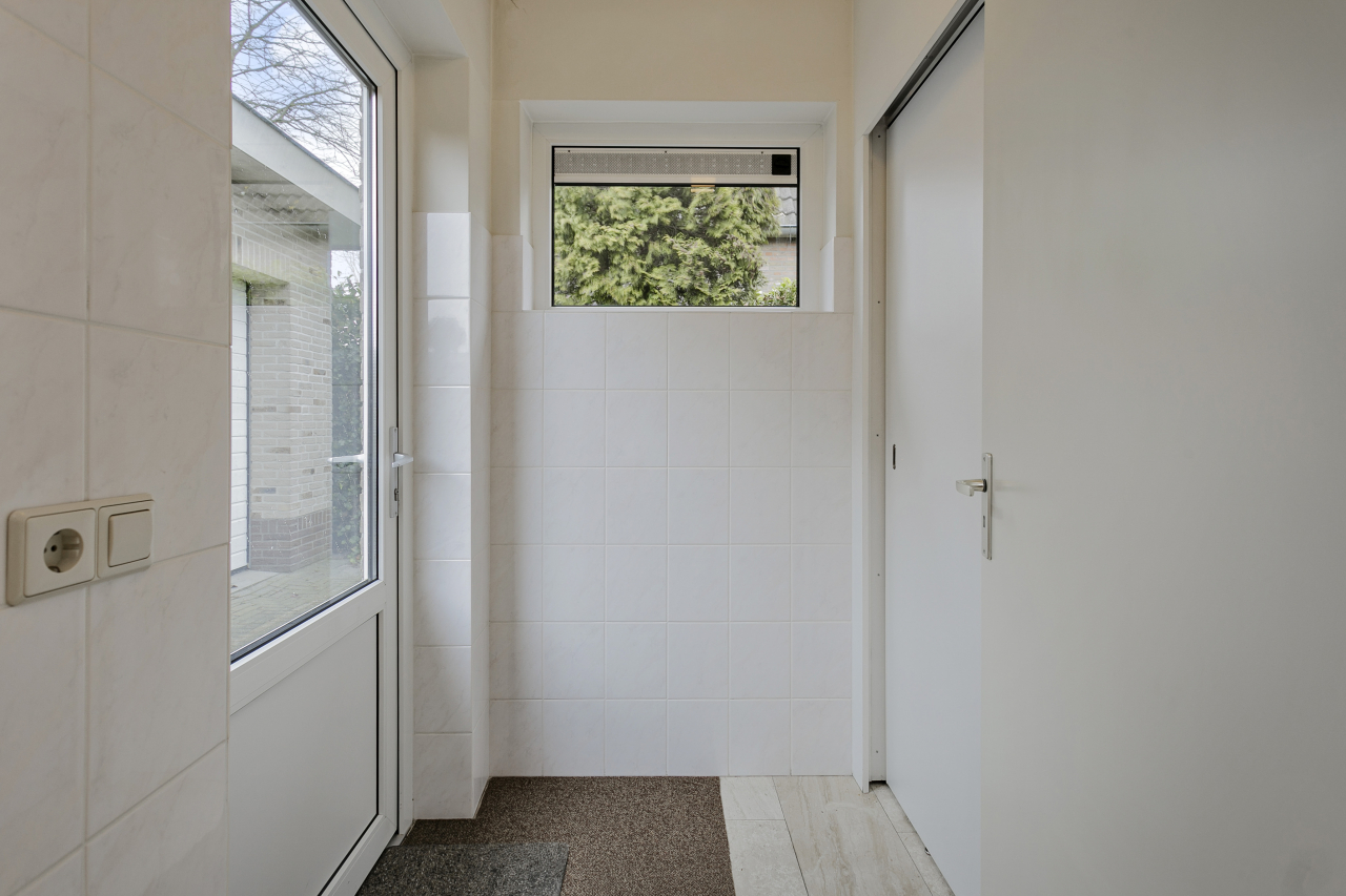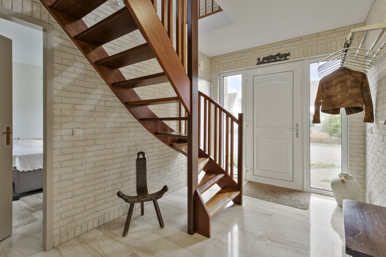 De entree van de woning is aan de voorzijde in het midden van de woning. Naast het oprit naar de vrijstaande grote garage. Vanuit de lichte, centrale hal met garderobe, trapopgang, meterkast en modern toilet met fonteintje, zijn de woonkamer en slaapkamer op de begane grond bereikbaar.