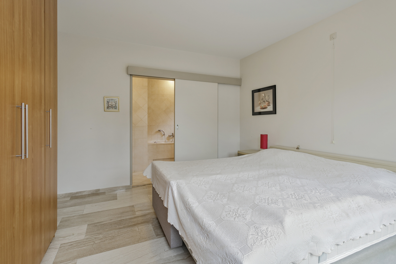 De royale ouderslaapkamer tevens met marmeren vloer met vloerverwarming heeft 2 grote ramen aan de voorzijde. Aansluitend ligt de volledig betegelde badkamer met comfortabele vloerverwarming, wastafelmeubel, ligbad, designradiator en aparte inloopdouche. Het toilet is in de hal.