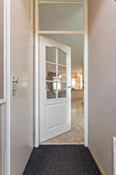 Vanuit de lichte hal met garderobe en meterkast is de woonkamer bereikbaar.