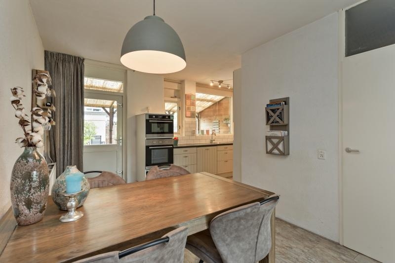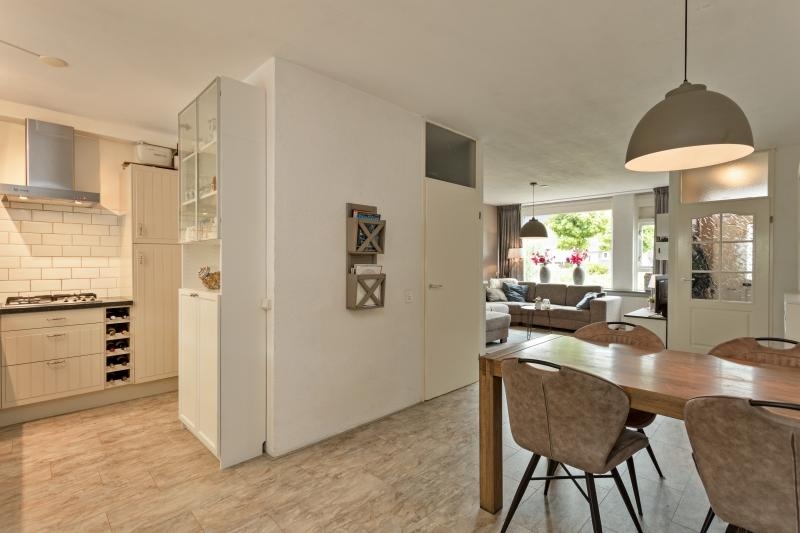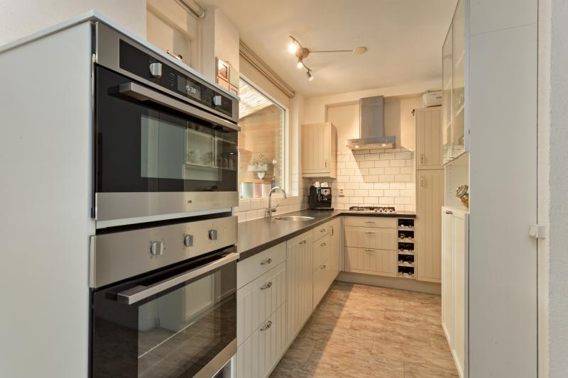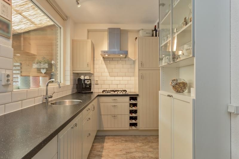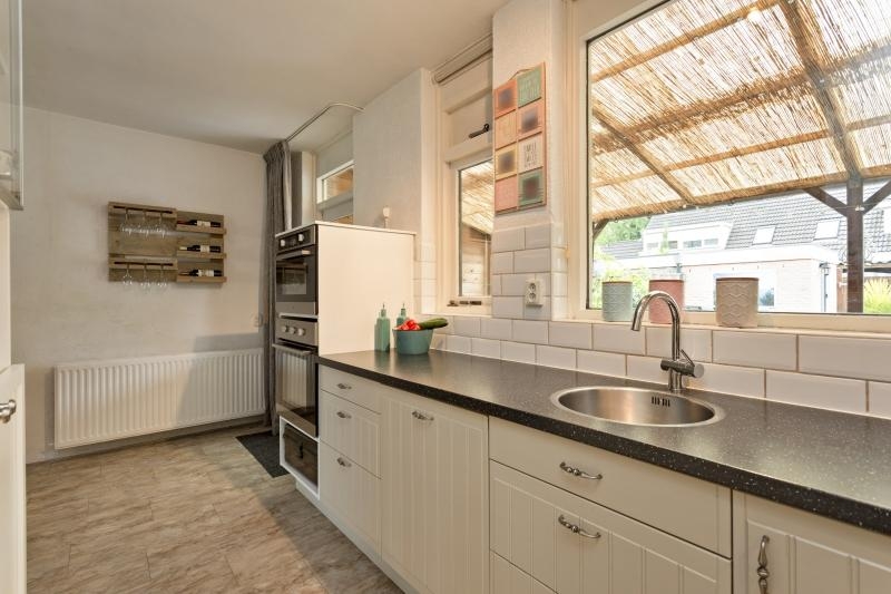 Bij de open keuken aan de achterzijde ligt de eethoek. Deze moderne keuken is voorzien van een aanrechtblad in L-vorm en van diverse inbouwapparatuur.