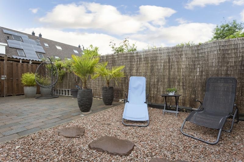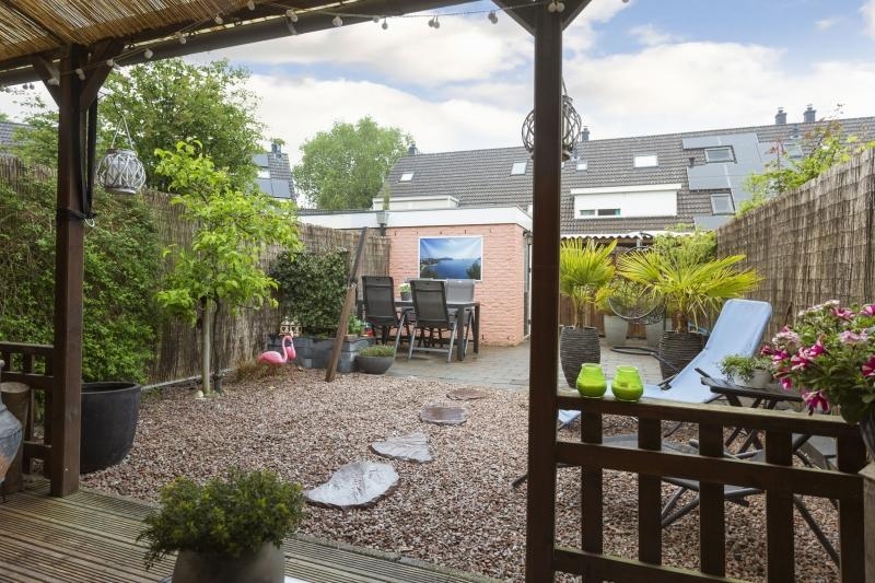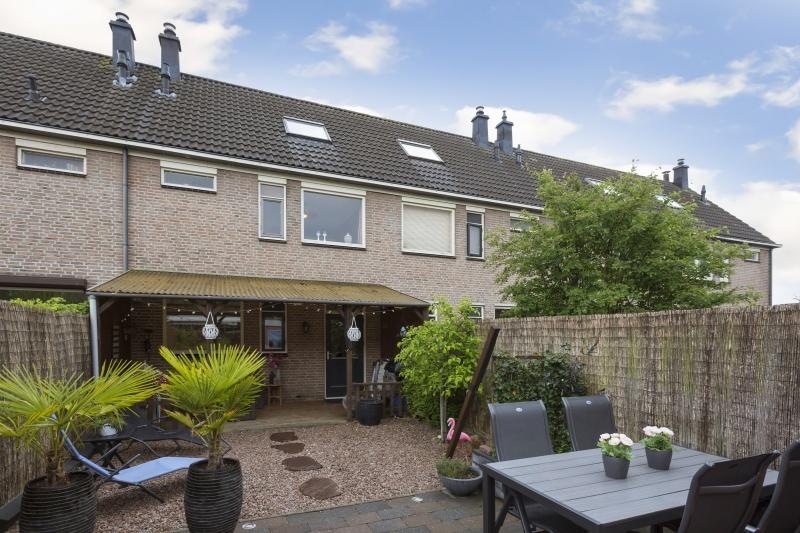 Achter de woning ligt de onderhoudsvriendelijk tuin met een vlonderterras met overkapping / veranda , sierbestrating en terras achter in de tuin. Tevens staat er een stenen berging en is er de poort met achterom.