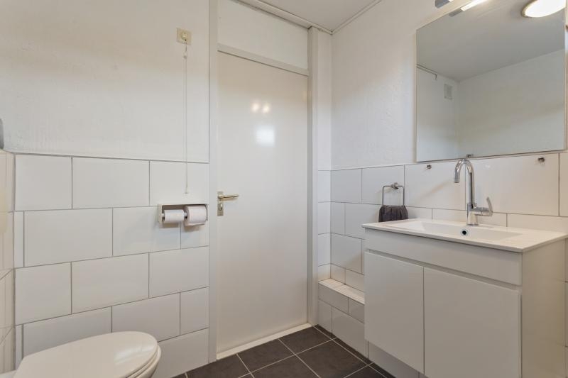 De wit (muur) met grijs (vloer) betegelde badkamer aan de achterzijde is ingericht met een douchecabine, wastafelmeubel, designradiator en 2e (hangend) toilet.