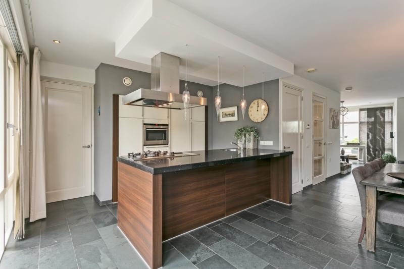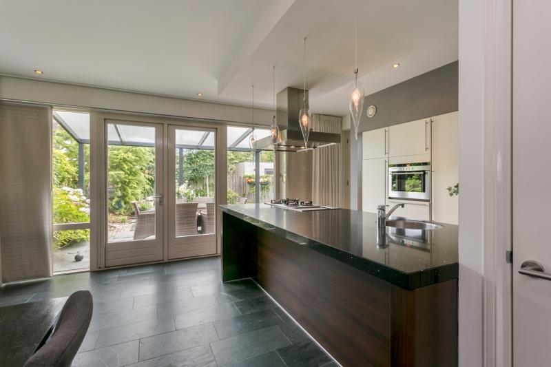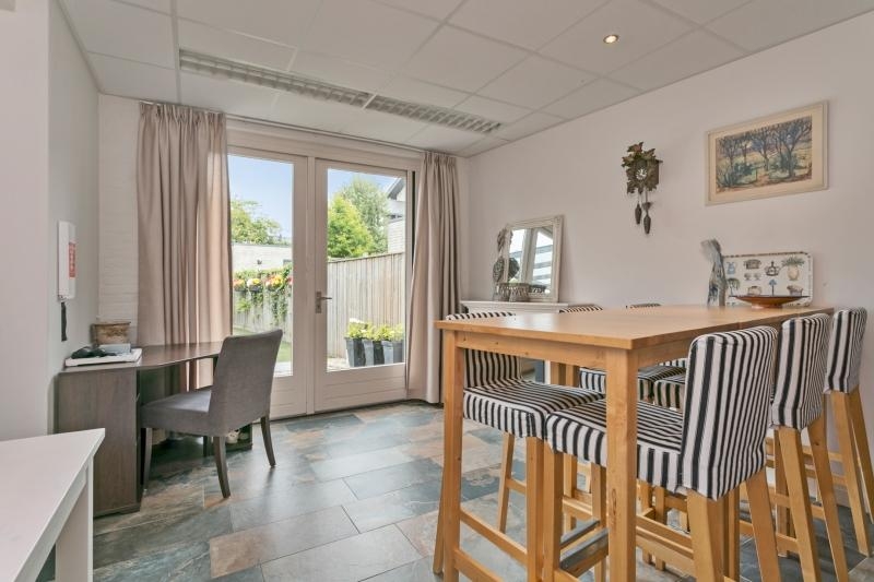 Het plafond heeft in de woonkamer en keuken inbouwspots en vanuit de keuken is de garage / kantoor bereikbaar.