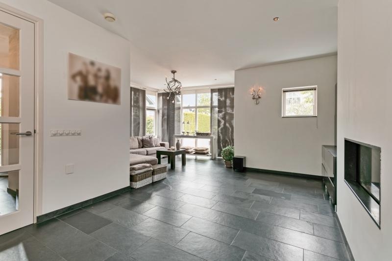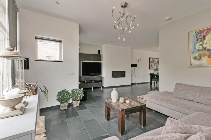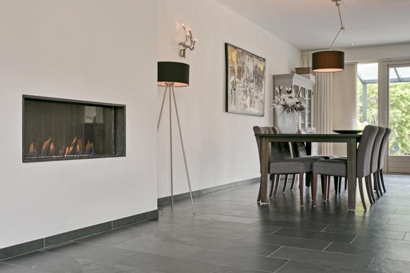 De L-vormige ruime woonkamer met aan de achterzijde openslaande deuren, is tevens voorzien van een mooie leisteenvloer met vloerverwarming. Aan de voorzijde in de lichte ldquo;erkerrdquo; is de zithoek met een moderne op afstand bedienbare gashaard.