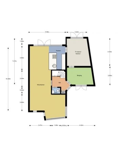 Via de hal op de begane grond is inpandig de berging/garage bereikbaar. Deze voormalige garage is op dit moment in gebruik als bijkeuken/ berging (voor) en achter als kantoor of TV ruimte. Aan de achterzijde zijn openslaande deuren naar de tuin.
