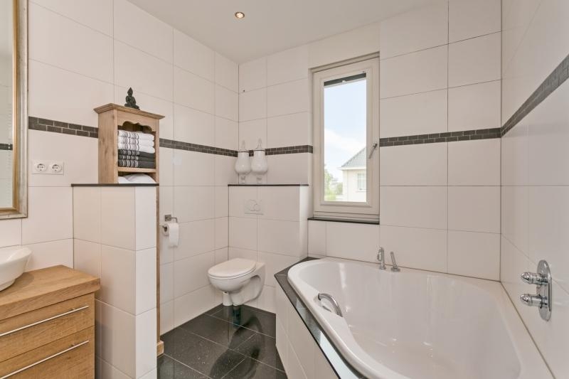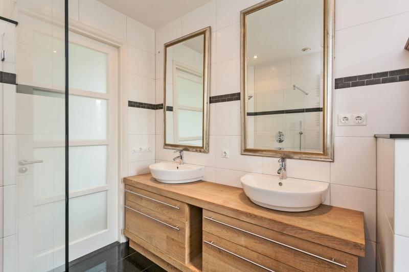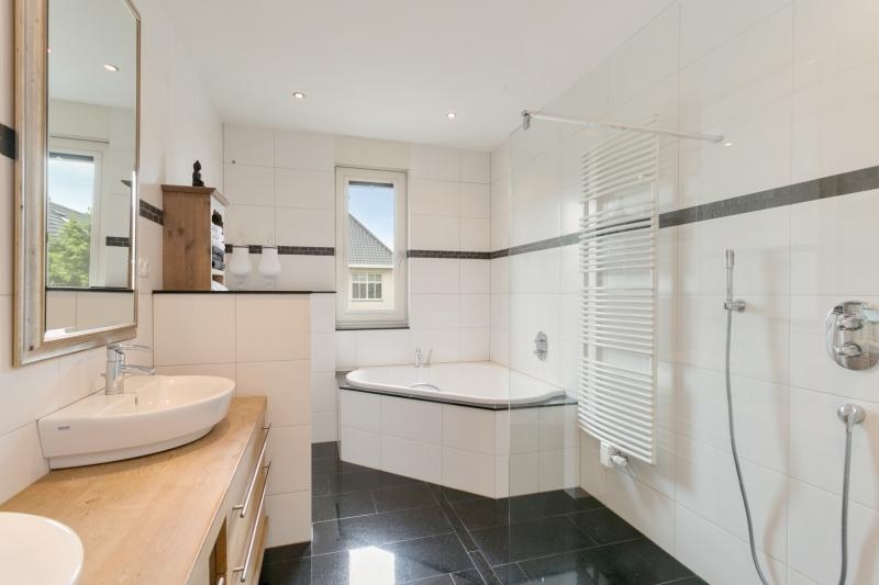 De royale badkamer (volledig betegeld) met inbouwspots en vloerverwarming is voorzien van een hoekligbad, aparte inloopdouche, 2e (wand)toilet, designradiator en fraai dubbel wastafelmeubel.