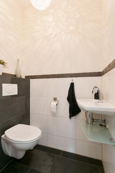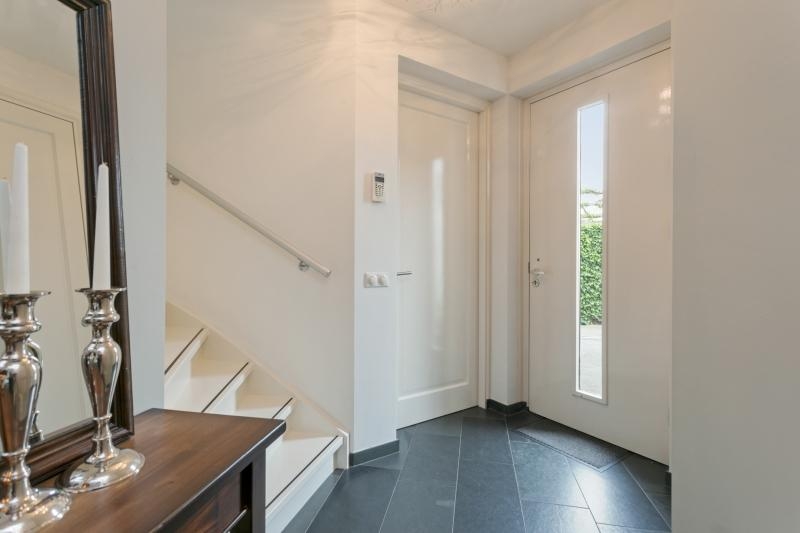 Via de ruime hal met donkergrijze leisteenvloer met vloerverwarming, garderobe, meterkast, modern toilet met fonteintje bereikt u de woonkamer. Let op de fraaie (paneel) deuren in de woning en de glad gestucte muren.