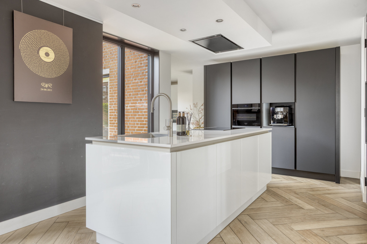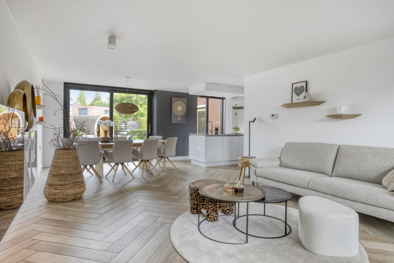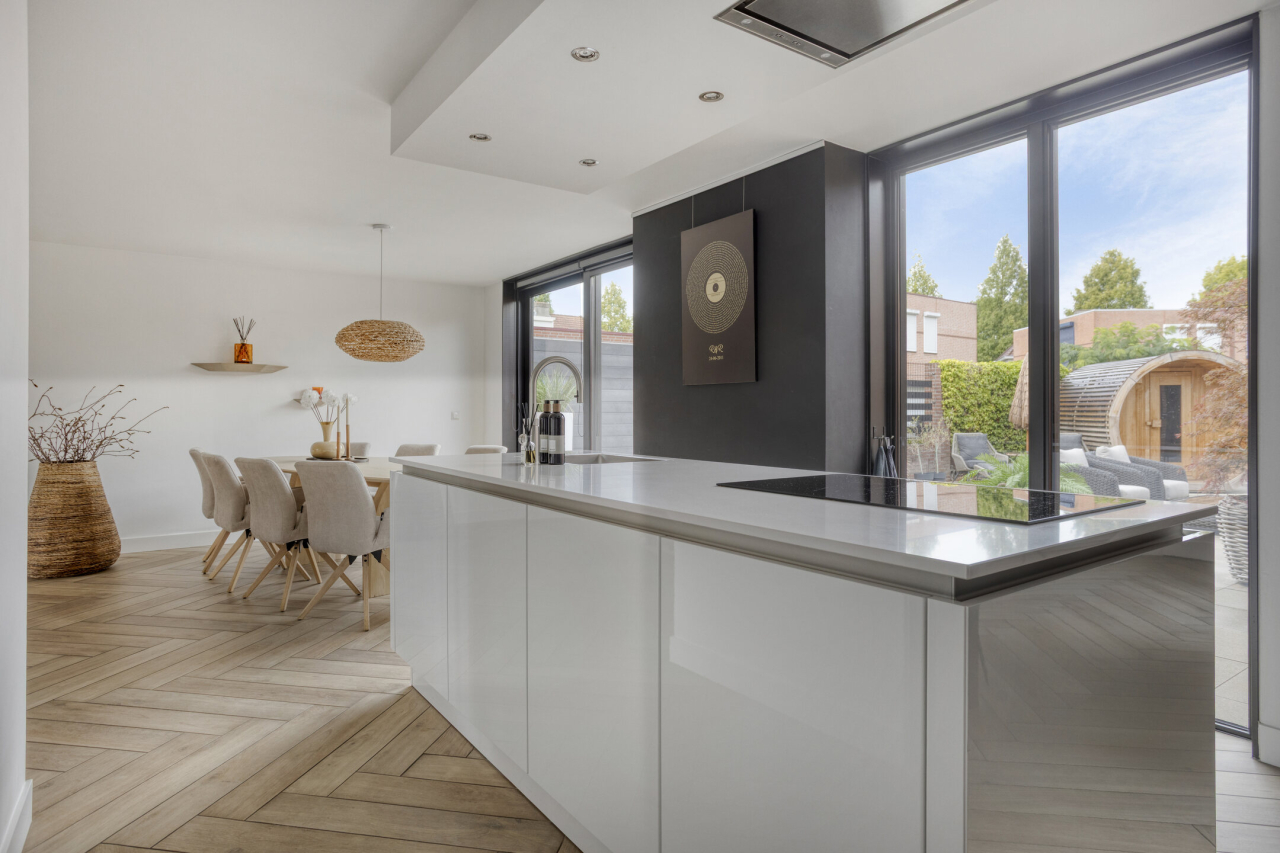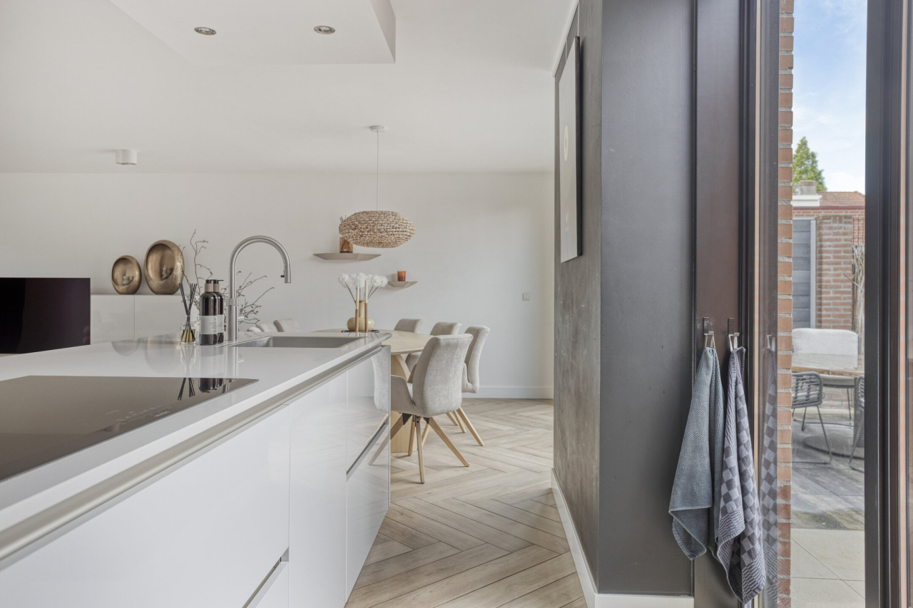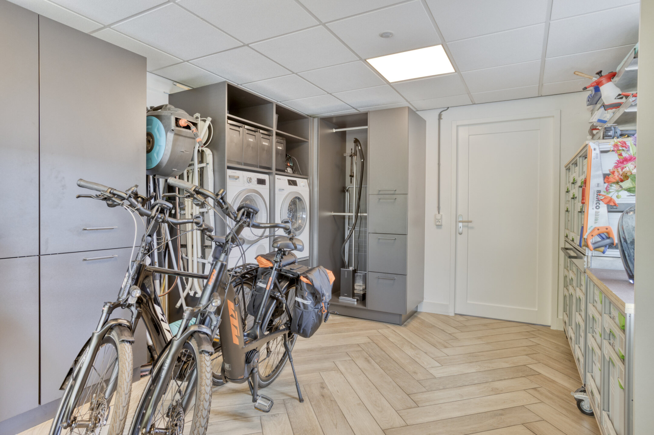 De overdekte entree is aan de voorzijde met een fraaie nieuwe voordeur en hoog raam. Vanuit de hal met visgraat tegelvloer met vloerverwarming, garderobe, trapopgang, trapkast, meterkast, modern toilet met fonteintje zijn de ouderslaapkamer met badkamer en via een stalen glazen deur de keuken/woonkamer bereikbaar. De ruime en lichte woonkamer met fraaie tegelvloer met vloerverwarming is voorzien van kamerhoge ramen voor bij de zithoek en aan de achterzijde bij de eethoek met een schuifpui. De luxe keuken is voorzien van een kook- en spoeleiland met composiet aanrechtblad. Deze is ingericht met diverse (hoge) keukenkasten, -lades en inbouwapparatuur zoals een 5 pits Miele inductie kookplaat met plafond afzuigkap, grote Siemens koelkast, Siemens combi stoom-oven, Miele vaatwasser en een handige Quooker. Aansluitend aan de keuken ligt de strakke bijkeuken met fraaie, hoge kasten met veel extra opbergruimte. En ook hier diverse inbouwapparatuur zoals een grote Siemens vriezer, een 2e grote Siemens koelkast en een wijnklimaatkast. Vanuit de bijkeuken zijn de inpandige berging / garage en (via een tuindeur) de tuin bereikbaar. Aan de voorzijde van de woning ligt de ouderslaapkamer met tevens een mooie tegelvloer met vloerverwarming en de moderne1e badkamer. Deze badkamer is ingericht met een dubbel wastafelmeubel , designradiator en royale inloopdouche met regendouche en handdouche.