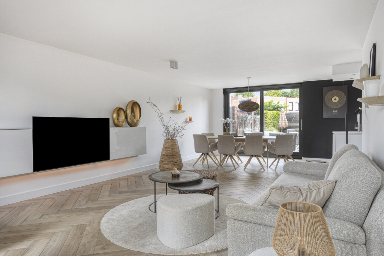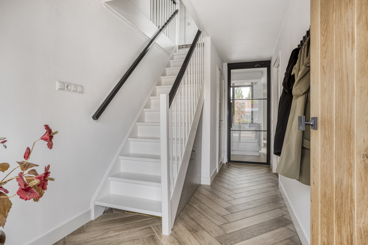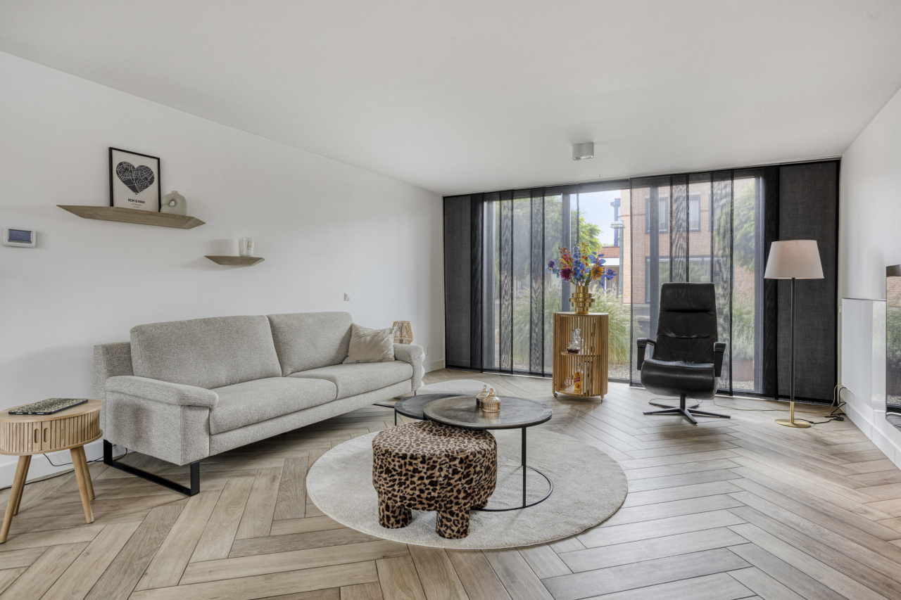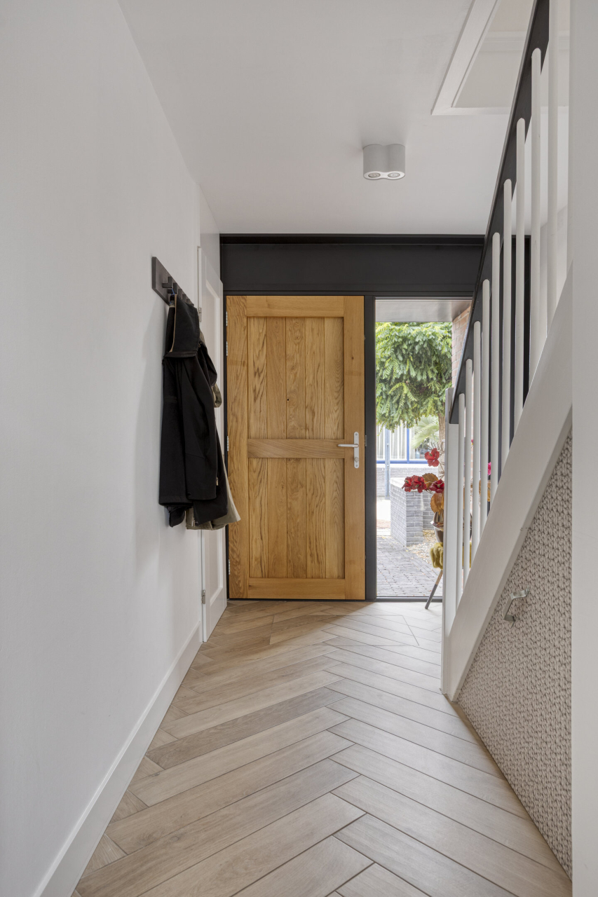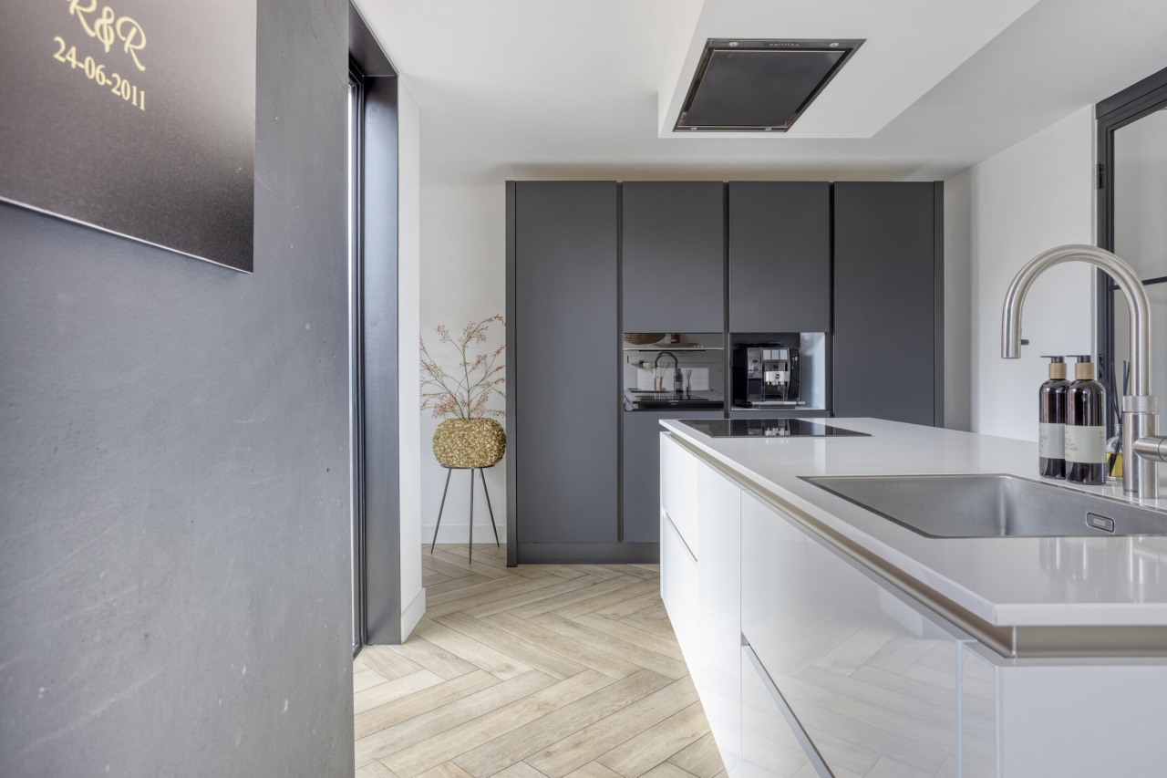 De overdekte entree is aan de voorzijde met een fraaie nieuwe voordeur en hoog raam. Vanuit de hal met visgraat tegelvloer met vloerverwarming, garderobe, trapopgang, trapkast, meterkast, modern toilet met fonteintje zijn de ouderslaapkamer met badkamer en via een stalen glazen deur de keuken/woonkamer bereikbaar. De ruime en lichte woonkamer met fraaie tegelvloer met vloerverwarming is voorzien van kamerhoge ramen voor bij de zithoek en aan de achterzijde bij de eethoek met een schuifpui. De luxe keuken is voorzien van een kook- en spoeleiland met composiet aanrechtblad. Deze is ingericht met diverse (hoge) keukenkasten, -lades en inbouwapparatuur zoals een 5 pits Miele inductie kookplaat met plafond afzuigkap, grote Siemens koelkast, Siemens combi stoom-oven, Miele vaatwasser en een handige Quooker. Aansluitend aan de keuken ligt de strakke bijkeuken met fraaie, hoge kasten met veel extra opbergruimte. En ook hier diverse inbouwapparatuur zoals een grote Siemens vriezer, een 2e grote Siemens koelkast en een wijnklimaatkast. Vanuit de bijkeuken zijn de inpandige berging / garage en (via een tuindeur) de tuin bereikbaar. Aan de voorzijde van de woning ligt de ouderslaapkamer met tevens een mooie tegelvloer met vloerverwarming en de moderne1e badkamer. Deze badkamer is ingericht met een dubbel wastafelmeubel , designradiator en royale inloopdouche met regendouche en handdouche.
