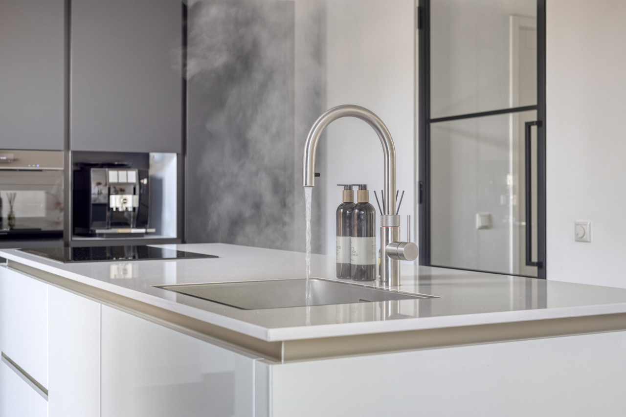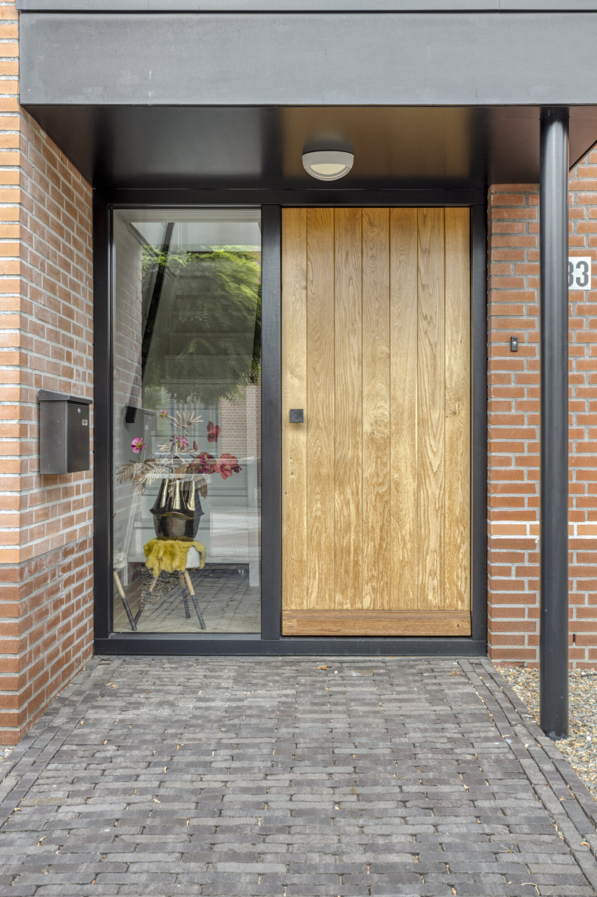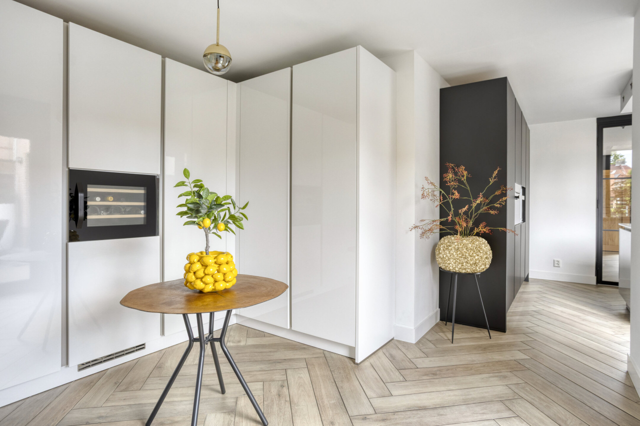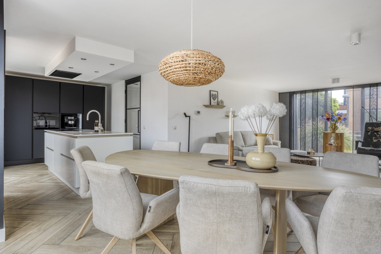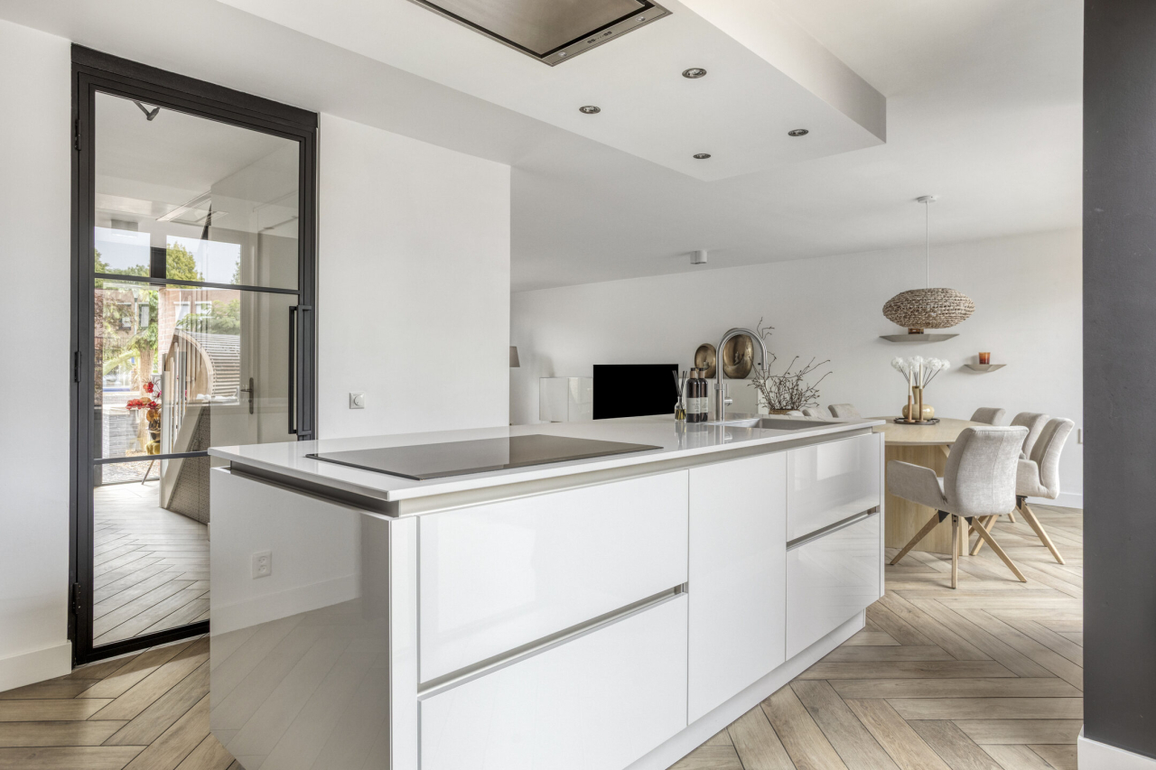 De overdekte entree is aan de voorzijde met een fraaie nieuwe voordeur en hoog raam. Vanuit de hal met visgraat tegelvloer met vloerverwarming, garderobe, trapopgang, trapkast, meterkast, modern toilet met fonteintje zijn de ouderslaapkamer met badkamer en via een stalen glazen deur de keuken/woonkamer bereikbaar. De ruime en lichte woonkamer met fraaie tegelvloer met vloerverwarming is voorzien van kamerhoge ramen voor bij de zithoek en aan de achterzijde bij de eethoek met een schuifpui. De luxe keuken is voorzien van een kook- en spoeleiland met composiet aanrechtblad. Deze is ingericht met diverse (hoge) keukenkasten, -lades en inbouwapparatuur zoals een 5 pits Miele inductie kookplaat met plafond afzuigkap, grote Siemens koelkast, Siemens combi stoom-oven, Miele vaatwasser en een handige Quooker. Aansluitend aan de keuken ligt de strakke bijkeuken met fraaie, hoge kasten met veel extra opbergruimte. En ook hier diverse inbouwapparatuur zoals een grote Siemens vriezer, een 2e grote Siemens koelkast en een wijnklimaatkast. Vanuit de bijkeuken zijn de inpandige berging / garage en (via een tuindeur) de tuin bereikbaar. Aan de voorzijde van de woning ligt de ouderslaapkamer met tevens een mooie tegelvloer met vloerverwarming en de moderne1e badkamer. Deze badkamer is ingericht met een dubbel wastafelmeubel , designradiator en royale inloopdouche met regendouche en handdouche.