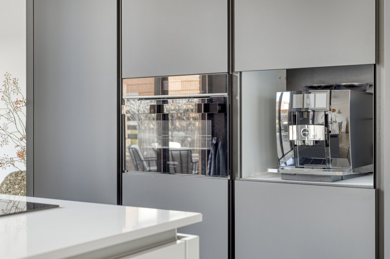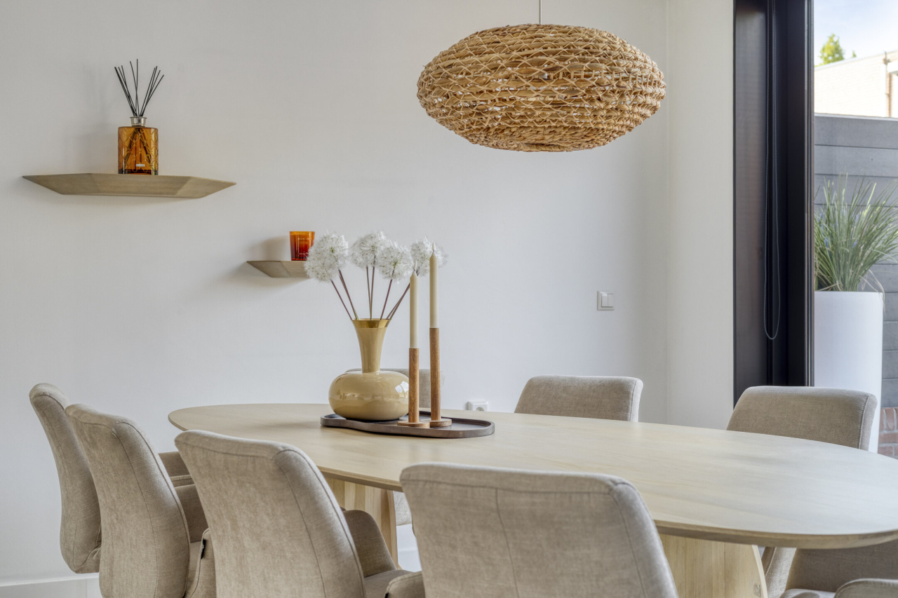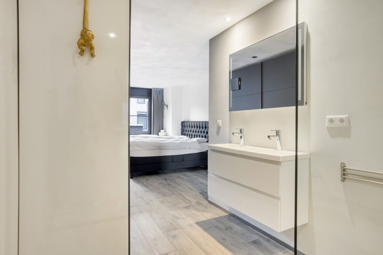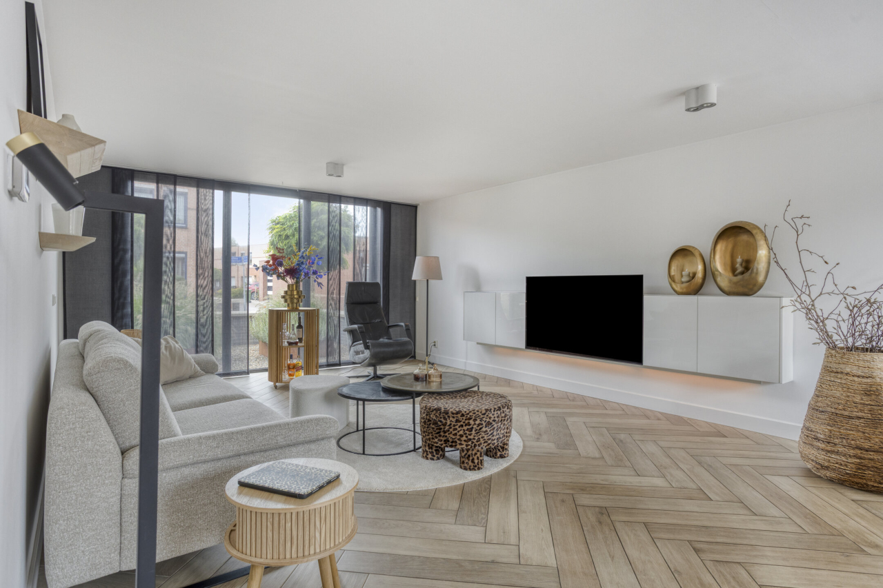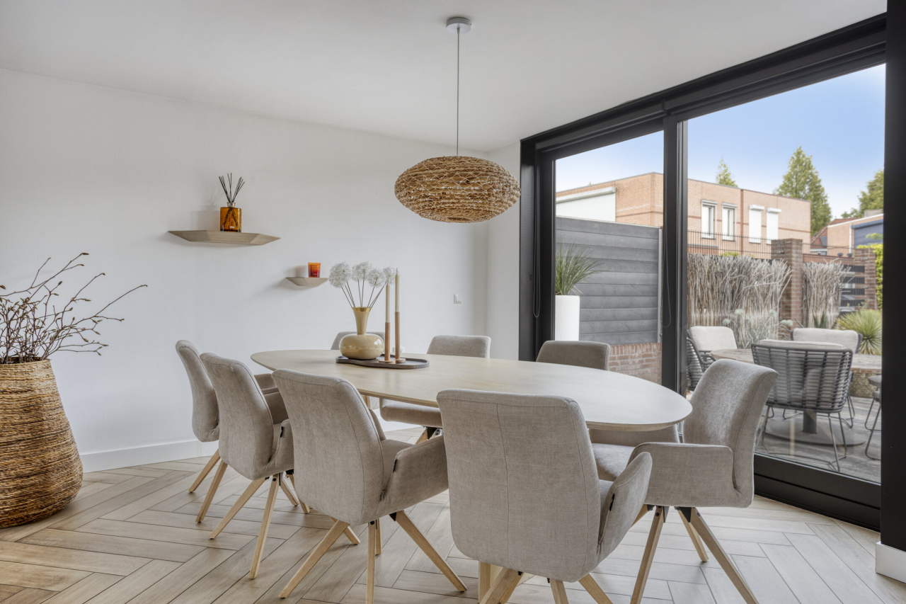 De overdekte entree is aan de voorzijde met een fraaie nieuwe voordeur en hoog raam. Vanuit de hal met visgraat tegelvloer met vloerverwarming, garderobe, trapopgang, trapkast, meterkast, modern toilet met fonteintje zijn de ouderslaapkamer met badkamer en via een stalen glazen deur de keuken/woonkamer bereikbaar. De ruime en lichte woonkamer met fraaie tegelvloer met vloerverwarming is voorzien van kamerhoge ramen voor bij de zithoek en aan de achterzijde bij de eethoek met een schuifpui. De luxe keuken is voorzien van een kook- en spoeleiland met composiet aanrechtblad. Deze is ingericht met diverse (hoge) keukenkasten, -lades en inbouwapparatuur zoals een 5 pits Miele inductie kookplaat met plafond afzuigkap, grote Siemens koelkast, Siemens combi stoom-oven, Miele vaatwasser en een handige Quooker. Aansluitend aan de keuken ligt de strakke bijkeuken met fraaie, hoge kasten met veel extra opbergruimte. En ook hier diverse inbouwapparatuur zoals een grote Siemens vriezer, een 2e grote Siemens koelkast en een wijnklimaatkast. Vanuit de bijkeuken zijn de inpandige berging / garage en (via een tuindeur) de tuin bereikbaar. Aan de voorzijde van de woning ligt de ouderslaapkamer met tevens een mooie tegelvloer met vloerverwarming en de moderne1e badkamer. Deze badkamer is ingericht met een dubbel wastafelmeubel , designradiator en royale inloopdouche met regendouche en handdouche.