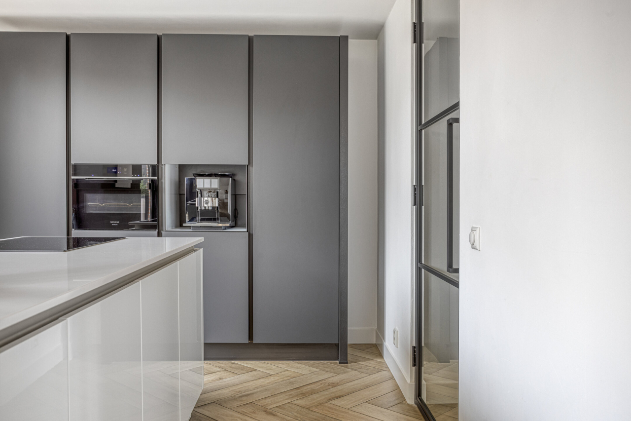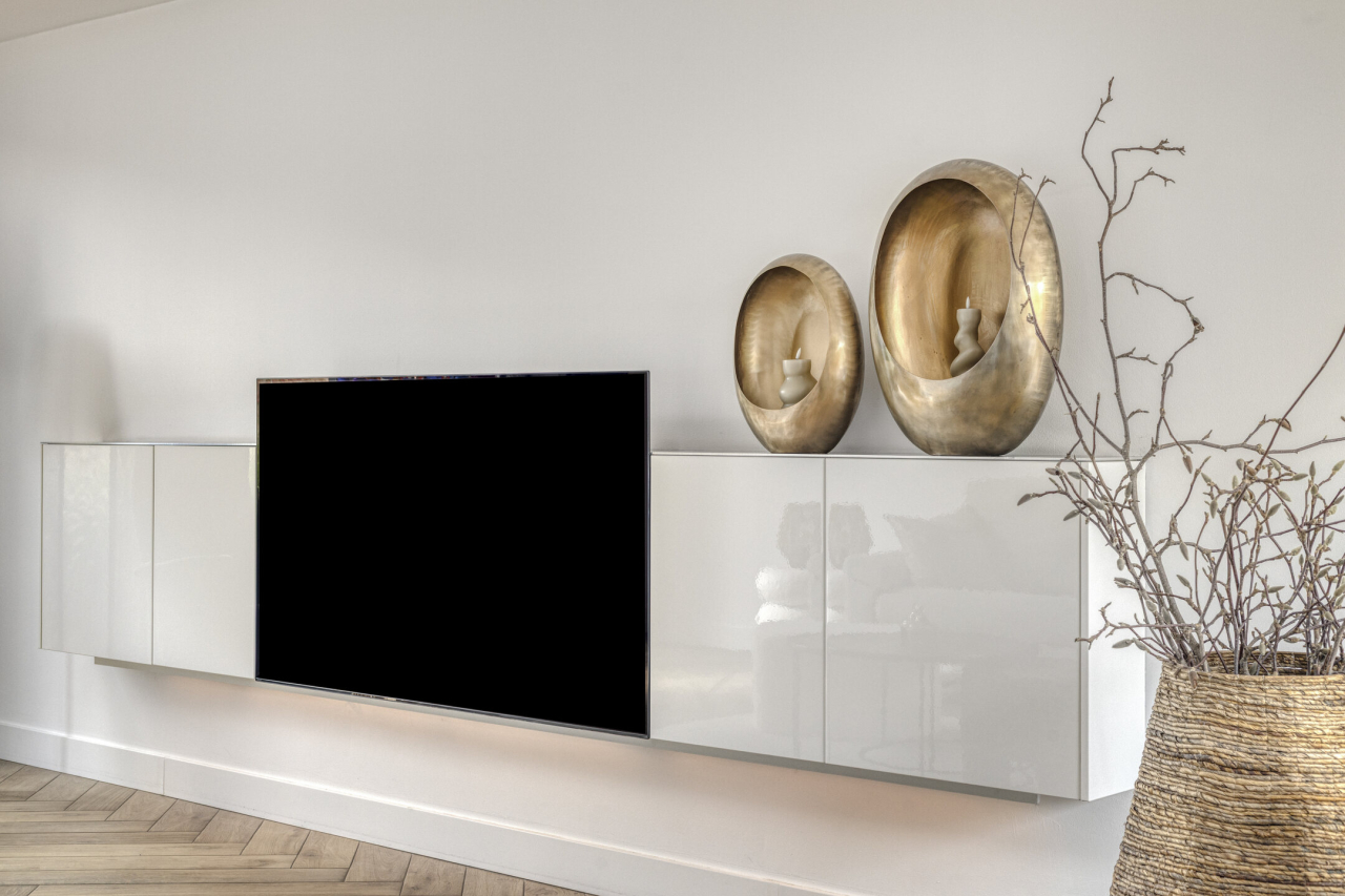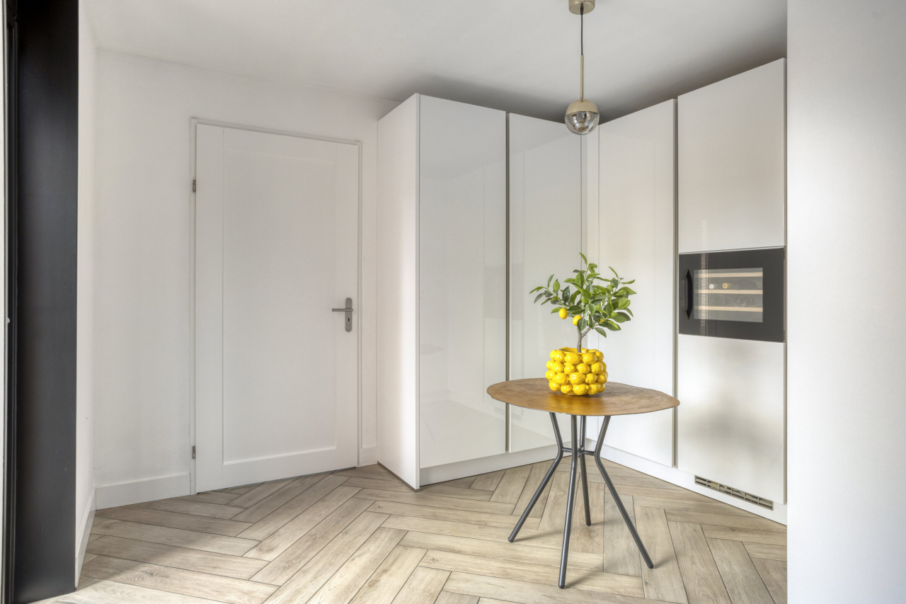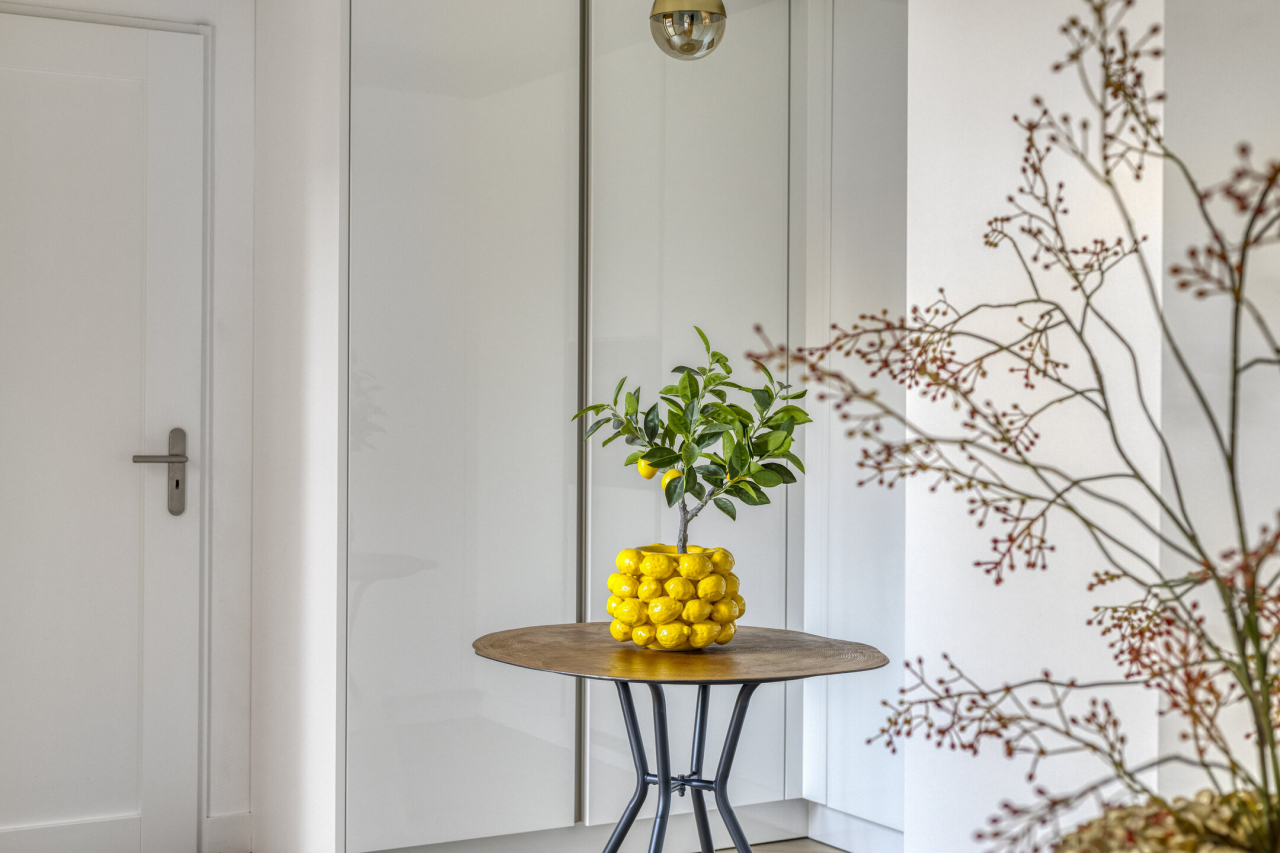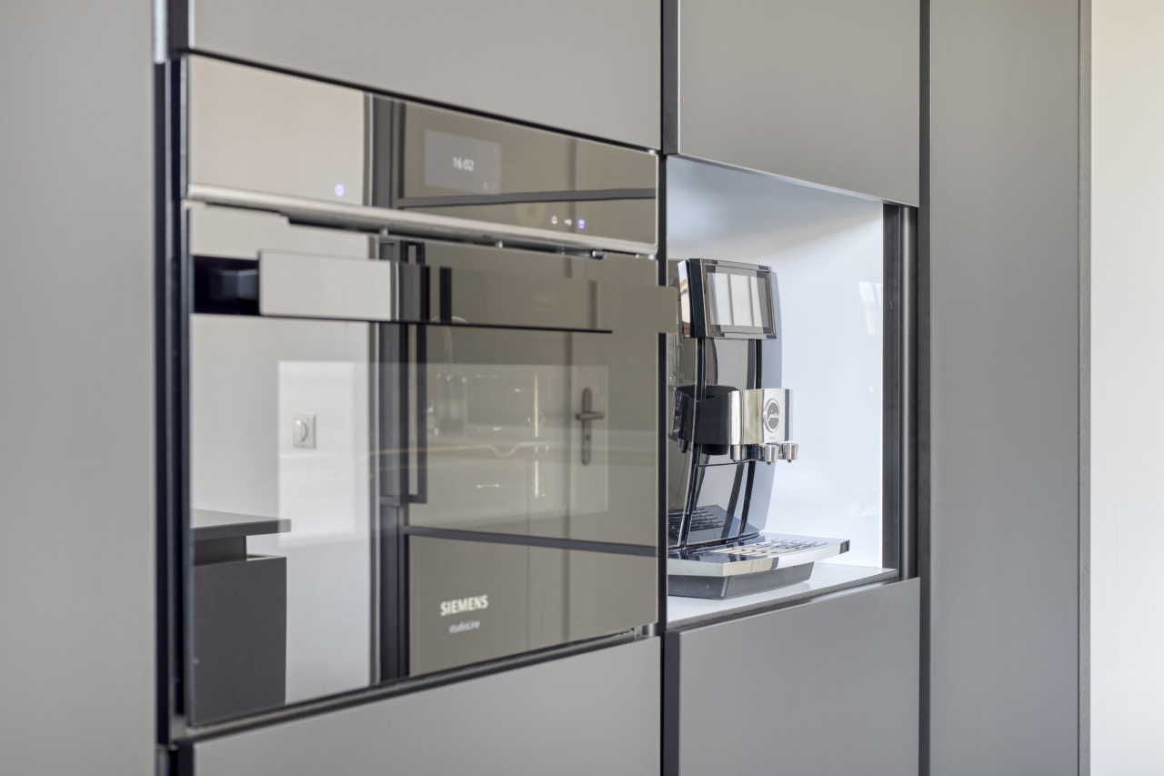 De overdekte entree is aan de voorzijde met een fraaie nieuwe voordeur en hoog raam. Vanuit de hal met visgraat tegelvloer met vloerverwarming, garderobe, trapopgang, trapkast, meterkast, modern toilet met fonteintje zijn de ouderslaapkamer met badkamer en via een stalen glazen deur de keuken/woonkamer bereikbaar. De ruime en lichte woonkamer met fraaie tegelvloer met vloerverwarming is voorzien van kamerhoge ramen voor bij de zithoek en aan de achterzijde bij de eethoek met een schuifpui. De luxe keuken is voorzien van een kook- en spoeleiland met composiet aanrechtblad. Deze is ingericht met diverse (hoge) keukenkasten, -lades en inbouwapparatuur zoals een 5 pits Miele inductie kookplaat met plafond afzuigkap, grote Siemens koelkast, Siemens combi stoom-oven, Miele vaatwasser en een handige Quooker. Aansluitend aan de keuken ligt de strakke bijkeuken met fraaie, hoge kasten met veel extra opbergruimte. En ook hier diverse inbouwapparatuur zoals een grote Siemens vriezer, een 2e grote Siemens koelkast en een wijnklimaatkast. Vanuit de bijkeuken zijn de inpandige berging / garage en (via een tuindeur) de tuin bereikbaar. Aan de voorzijde van de woning ligt de ouderslaapkamer met tevens een mooie tegelvloer met vloerverwarming en de moderne1e badkamer. Deze badkamer is ingericht met een dubbel wastafelmeubel , designradiator en royale inloopdouche met regendouche en handdouche.