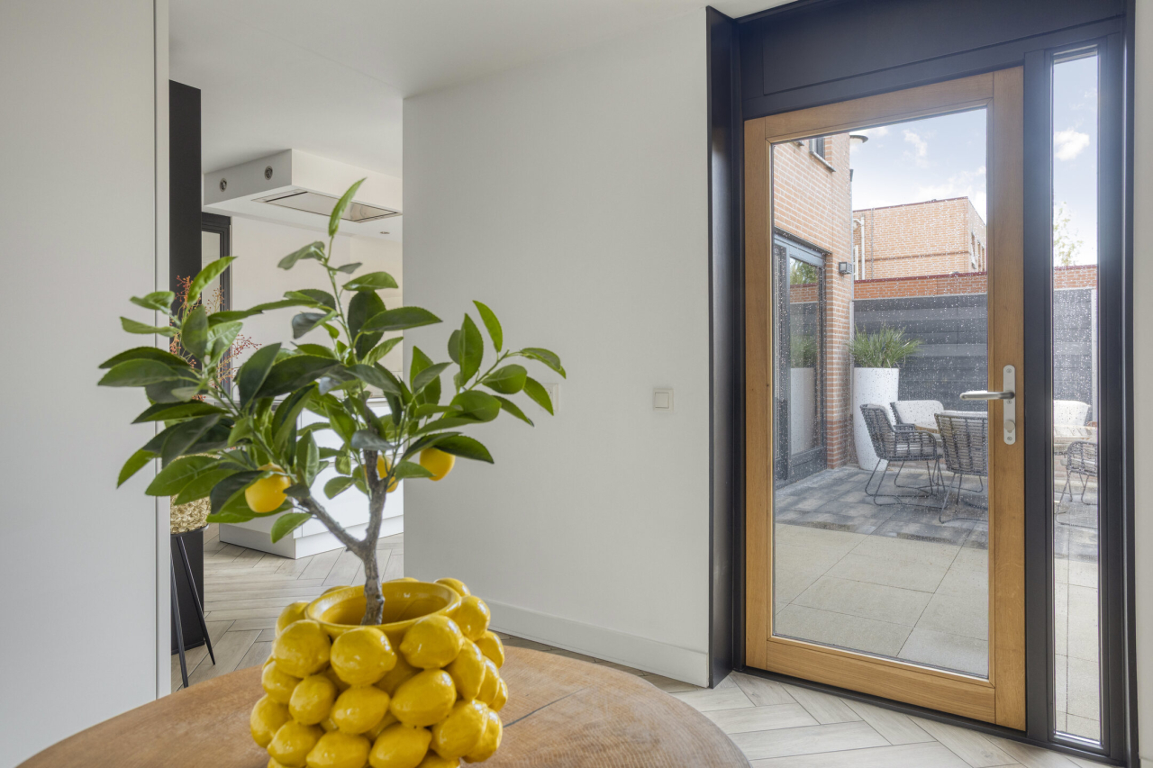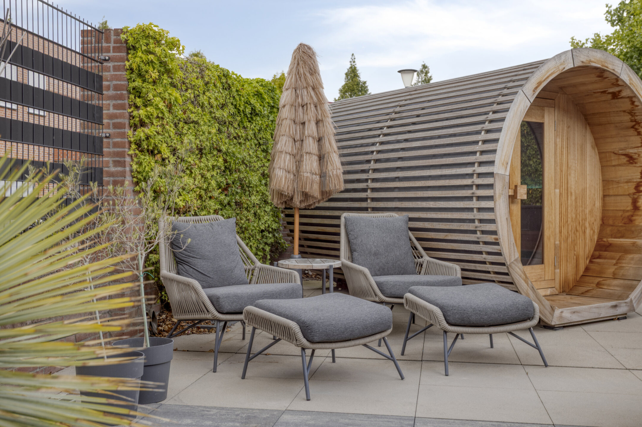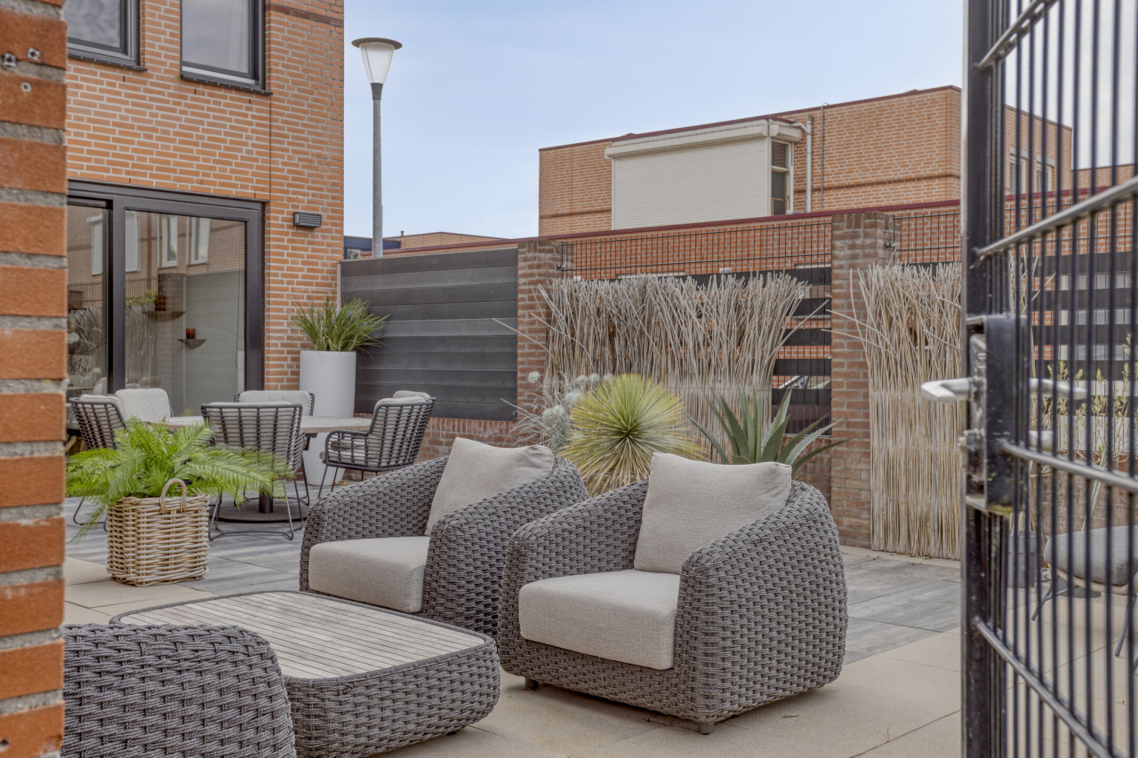 Achter het huis ligt een zonnige tuin grotendeels bestraat met fraaie siertegels en siergrind waardoor onderhoudsvriendelijk. De gedeeltelijk ommuurde tuin is voorzien van diverse terrassen en sierhekwerk met een tuinpoort als achterom die uitkomt op de oprit en verkeersluw pleintje. In de ronde houten buitensauna is het heerlijk genieten. De tuin is gelegen op het Westen - NoordWest dus er is altijd wel een zonnig plekje te vinden. De woning ligt vlakbij het stadspark, Parkeiland met speeltuinen en wandelgebied, winkelcentrum De Portage, scholen, kinderopvang ,NS station en oprit A2. Een heerlijk huis. Kom je kijken?