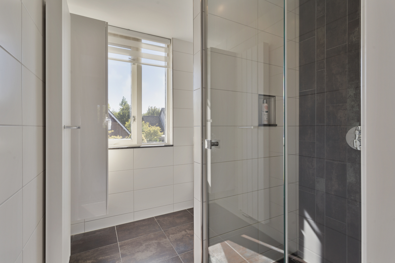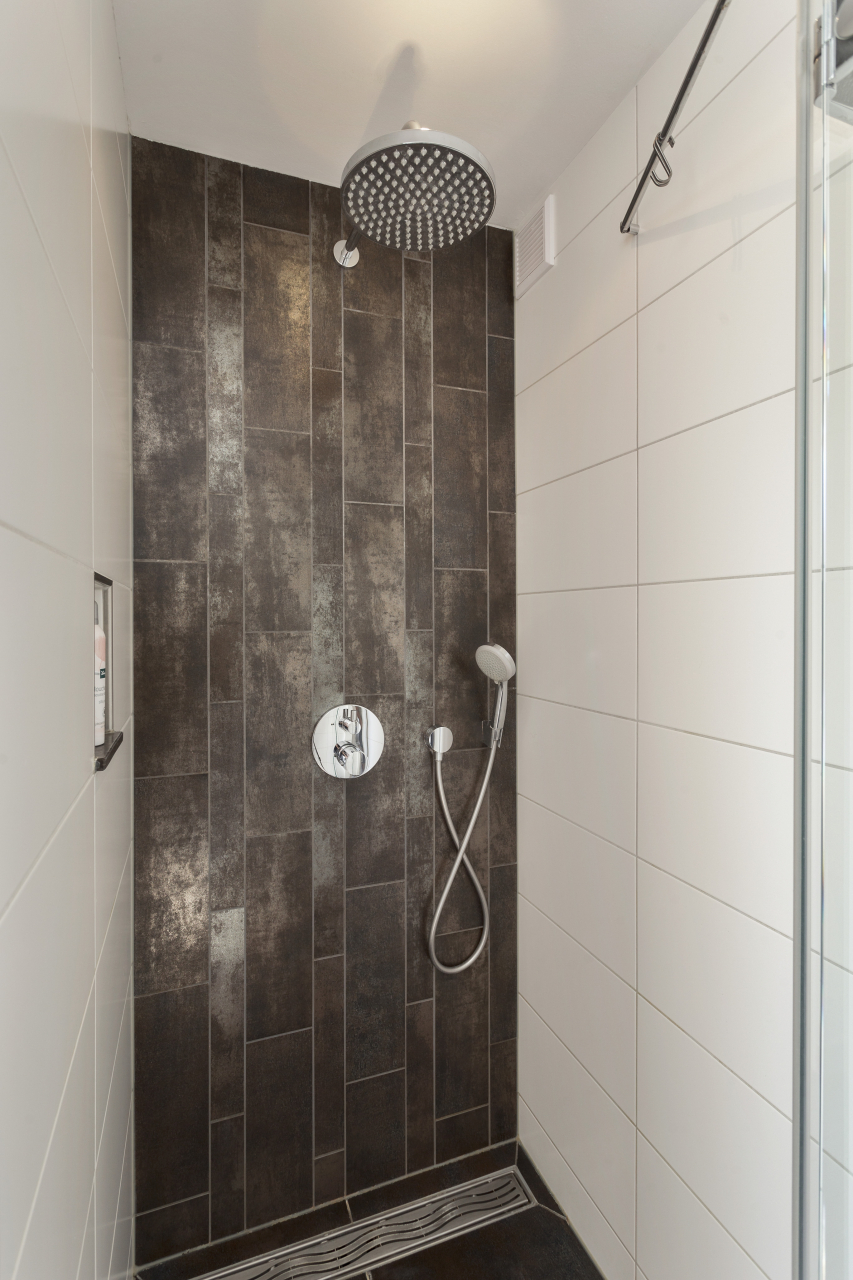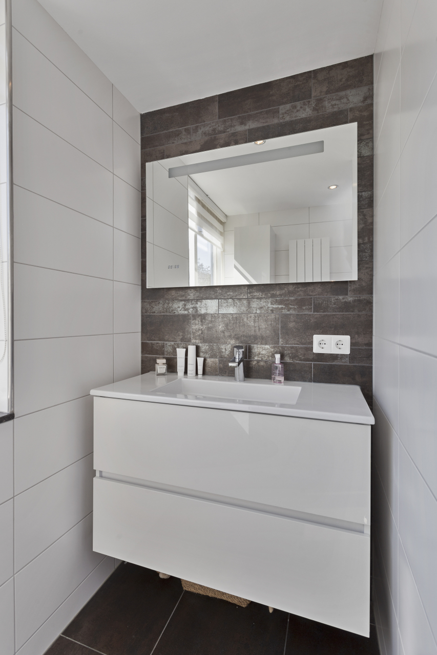 De moderne, volledig betegelde badkamer aan de voorzijde met dakkapel is ingericht met een inloopdouche met regendouche en handdouche, designradiator en breed wastafelmeubel met bijbehorende kast.