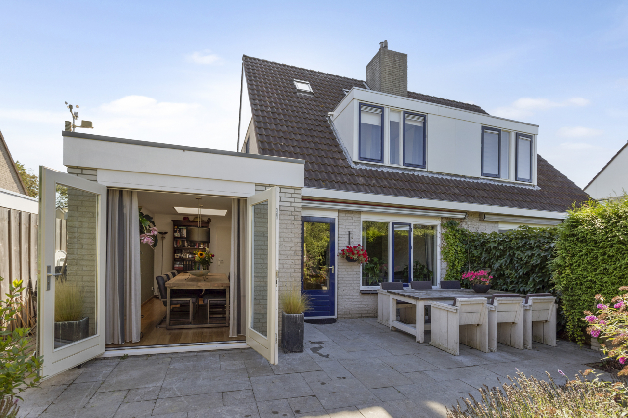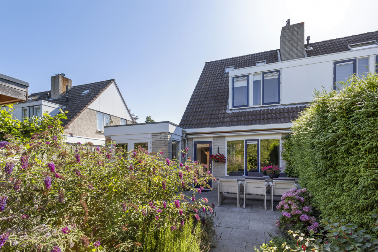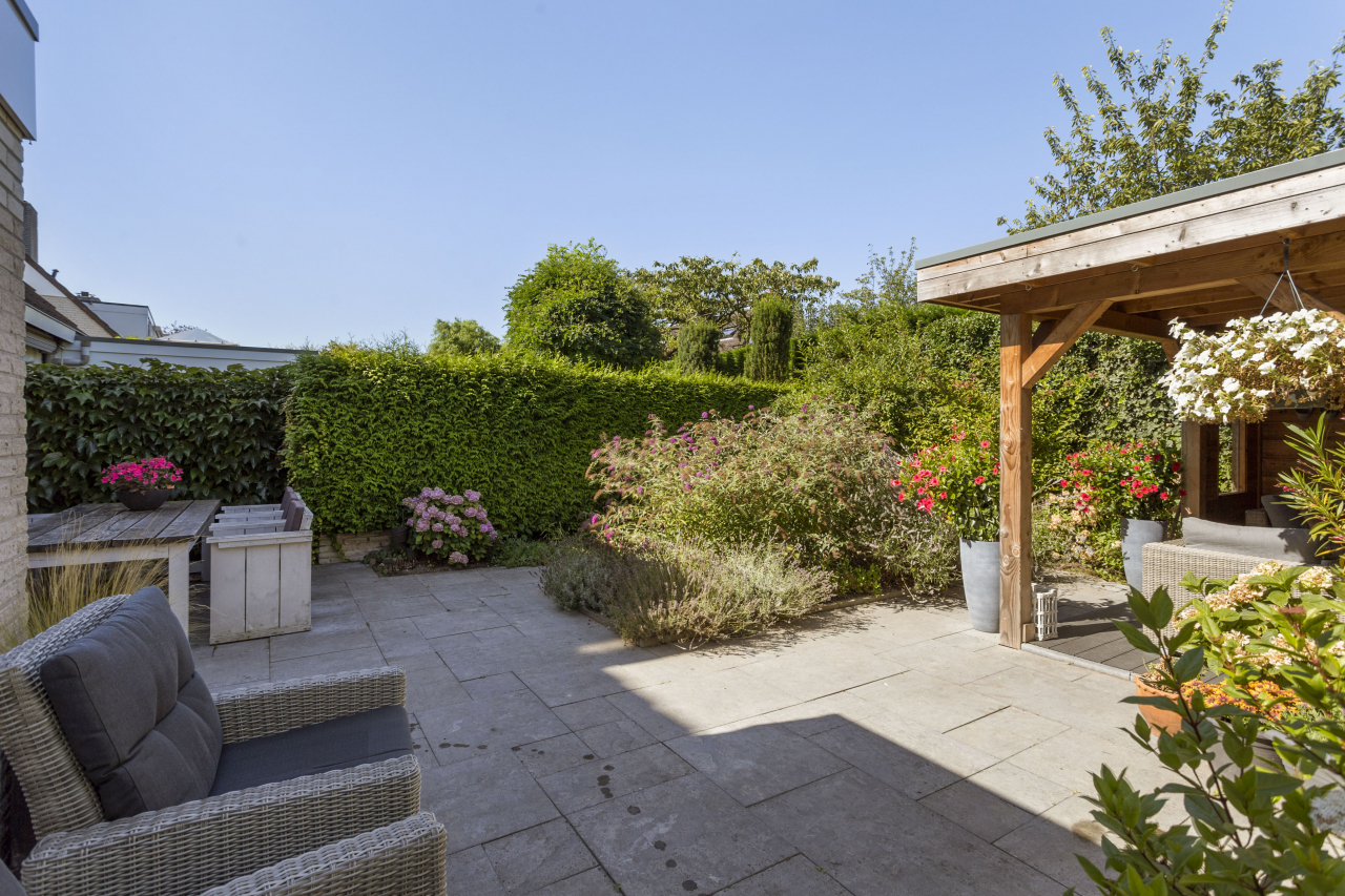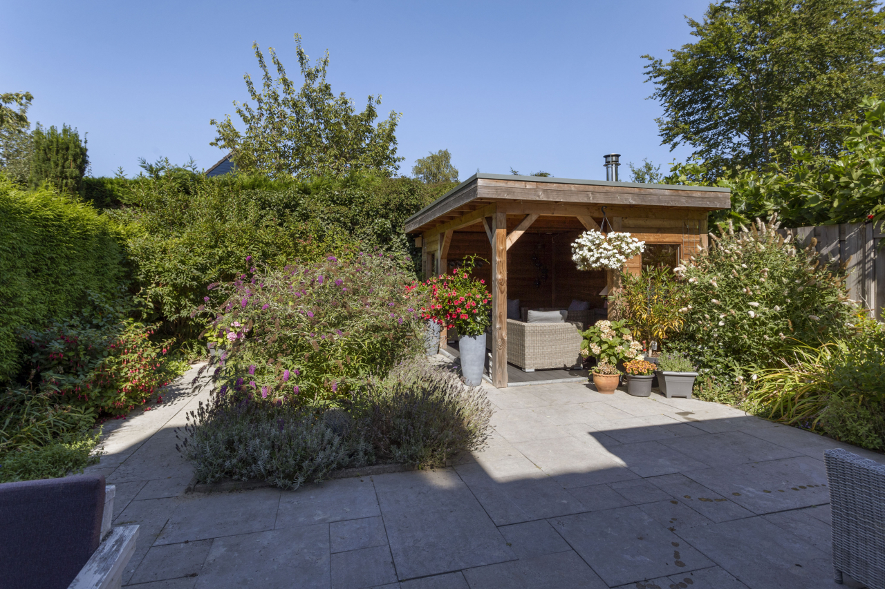 Achter de woning ligt een zonnige, heerlijke tuin op het Westen met achterom. De tuin, bereikbaar via een tuindeur in de woonkamer en openslaande deuren in de eetkamer, is voorzien van een groot terras achter de woning. Verder is er sierbestrating en diverse borders met beplanting en struiken. Er is tevens een groot zonnescherm aan de achtergevel. Achterin de tuin staat een houten veranda met houtkachel die zorgt voor vele comfortabele uren buiten.