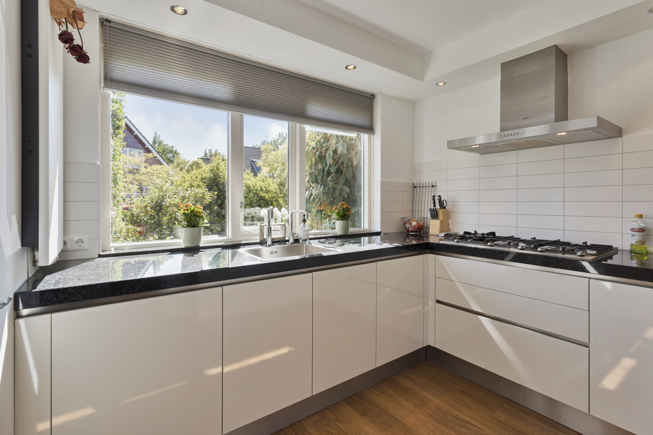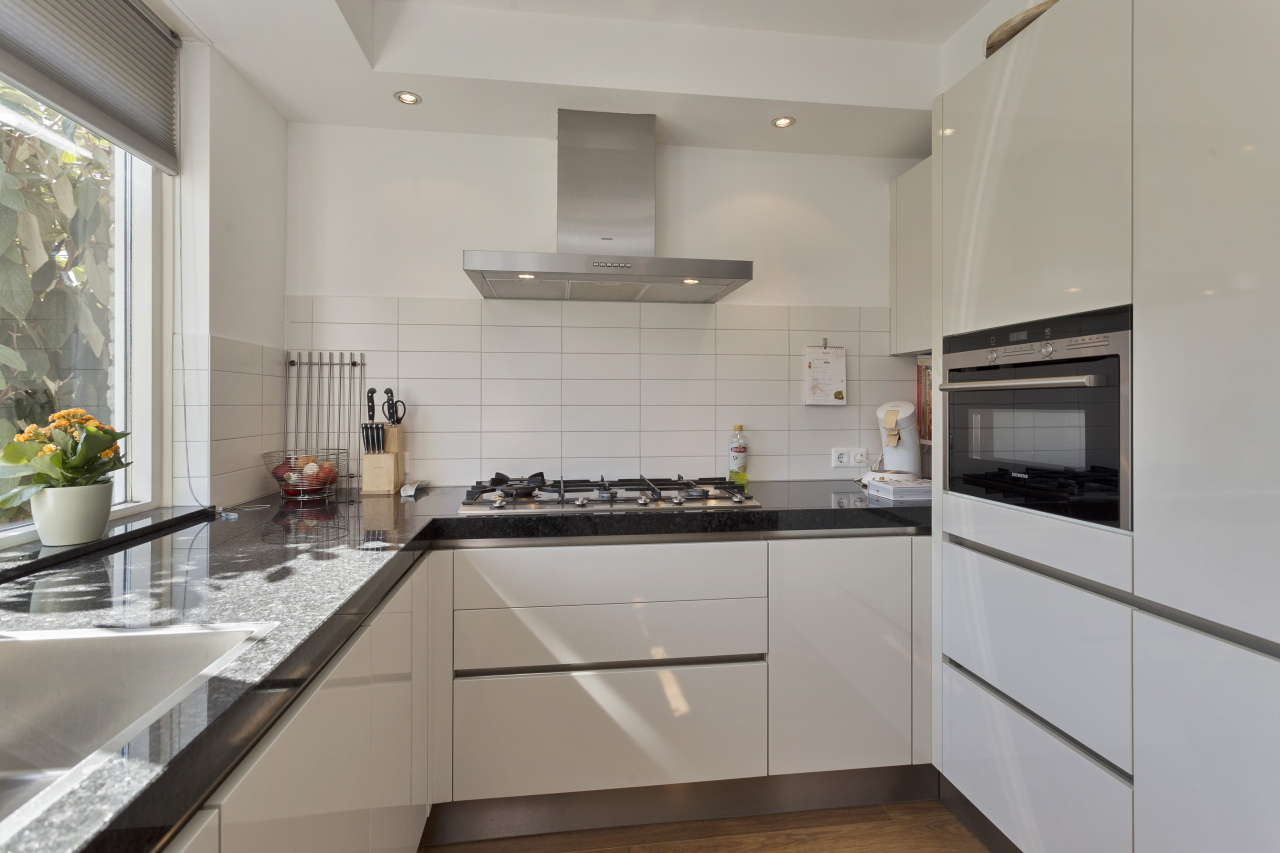 De moderne, open keuken aan de voorzijde, met composiet aanrechtblad in L-vorm, is compleet en voorzien van diverse keukenkasten en de inbouwapparatuur zoals: een Quooker, Atag 5 pits gaskookplaat met Siemens afzuigschouw en Siemens combi ovenmagnetron, Verder is er een Miele vaatwasser en Siemens koelkast.