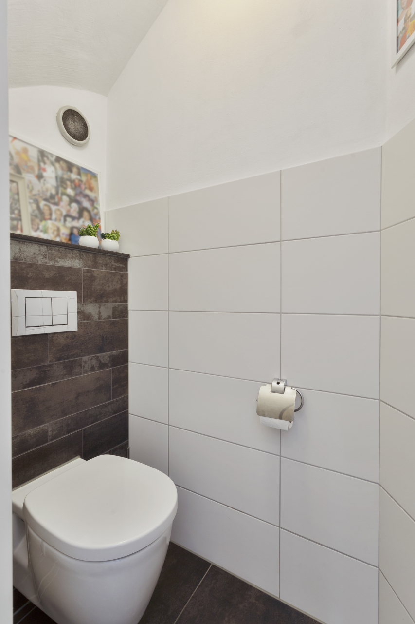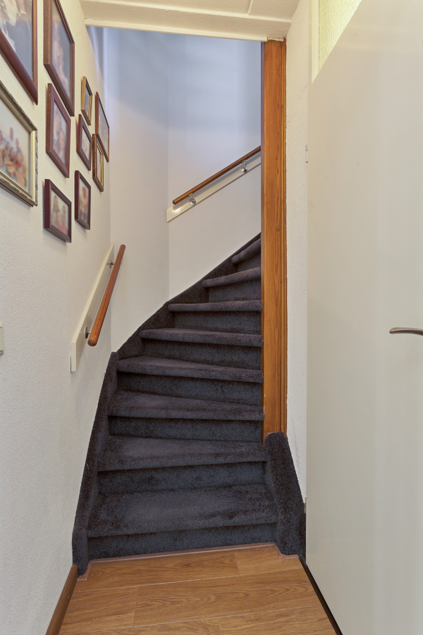 De 1e verdieping is bereikbaar via een halletje achter de keuken met een modern (hangend) toilet.