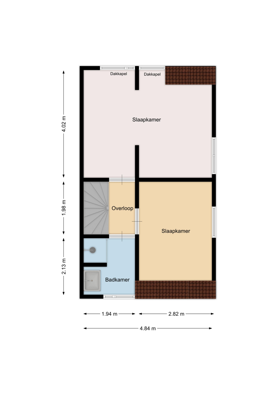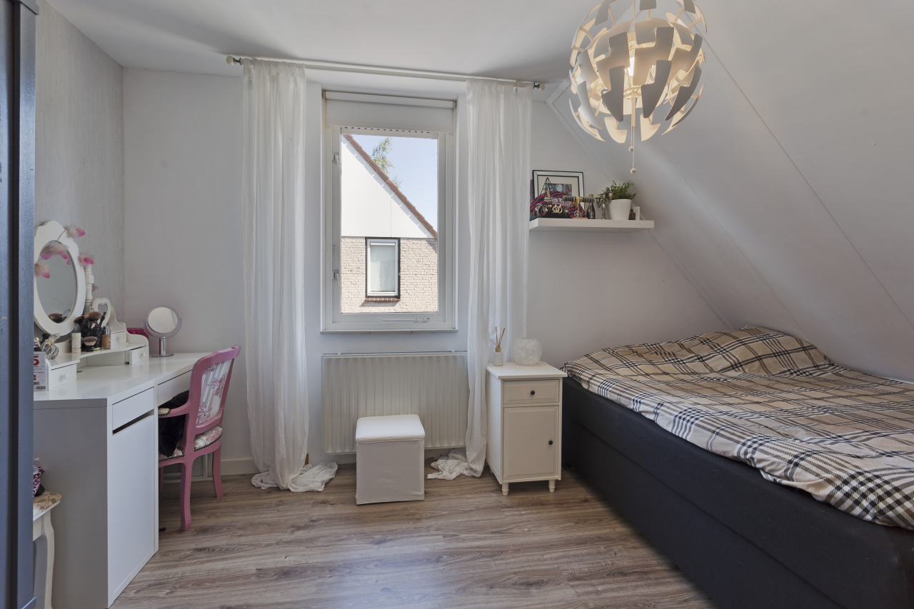 Op deze 1e verdieping liggen aan de overloop 2 slaapkamers en de lichte badkamer. Aan de voorzijde een slaapkamer met zijraam en laminaatvloer.