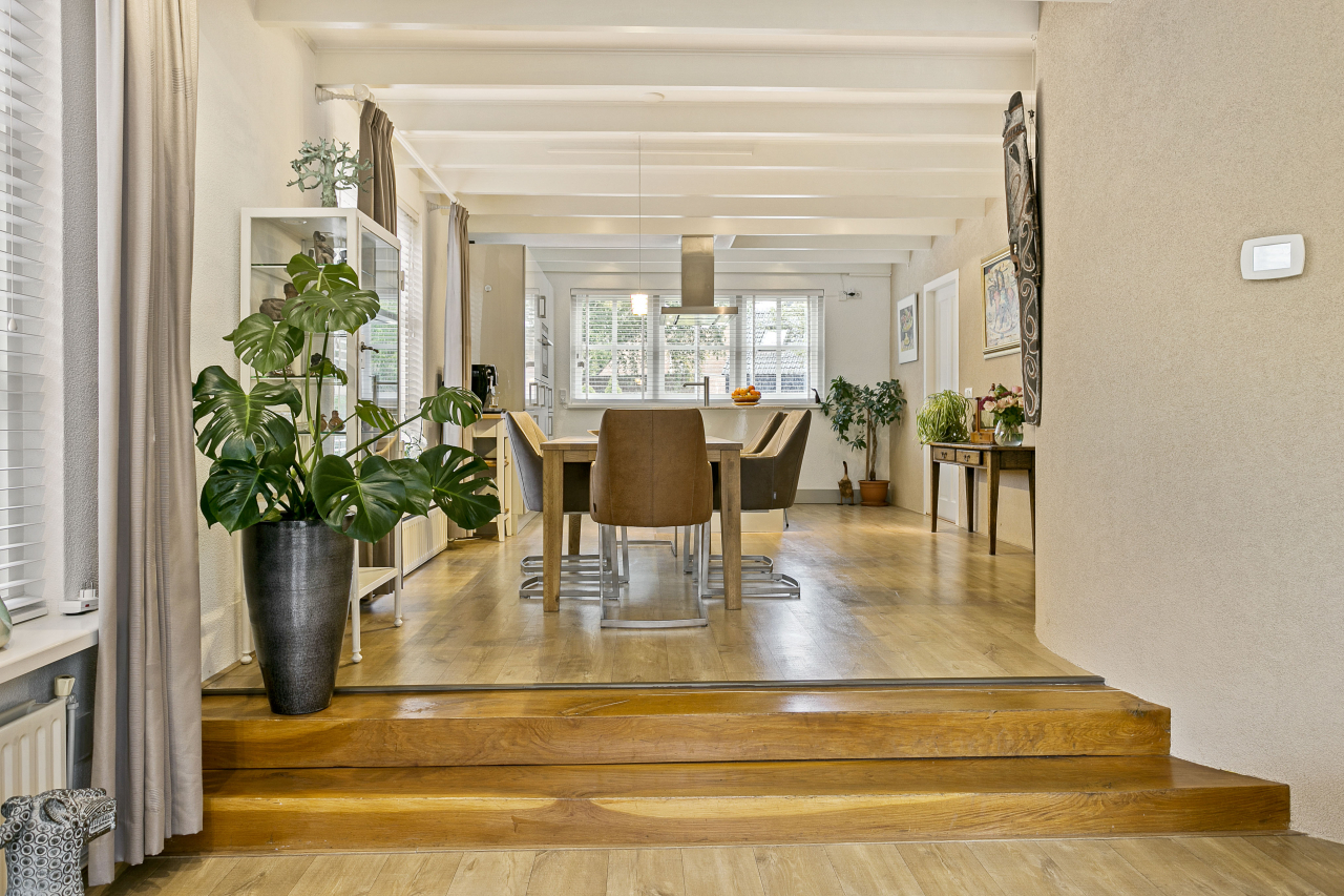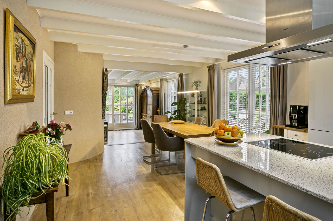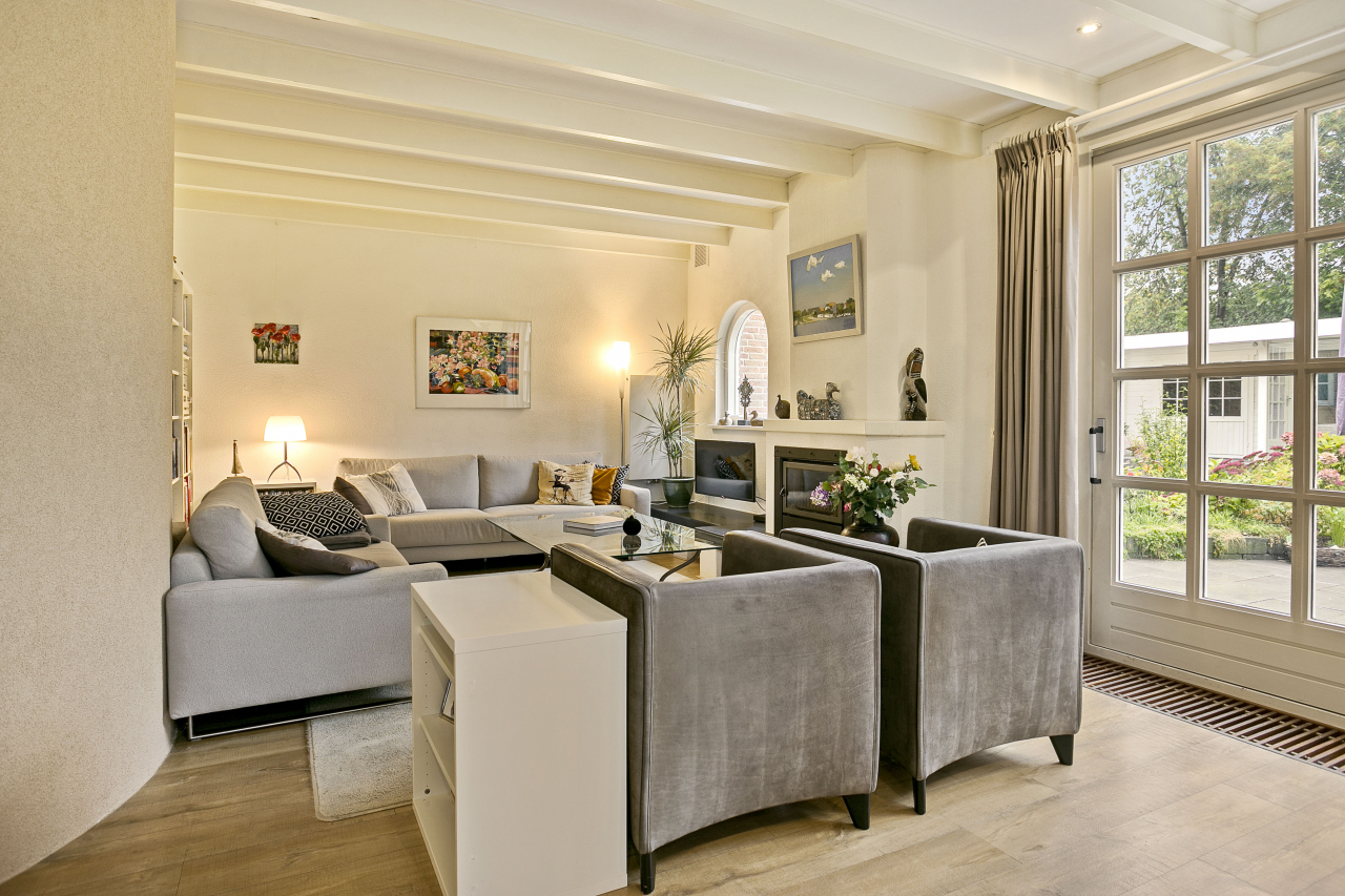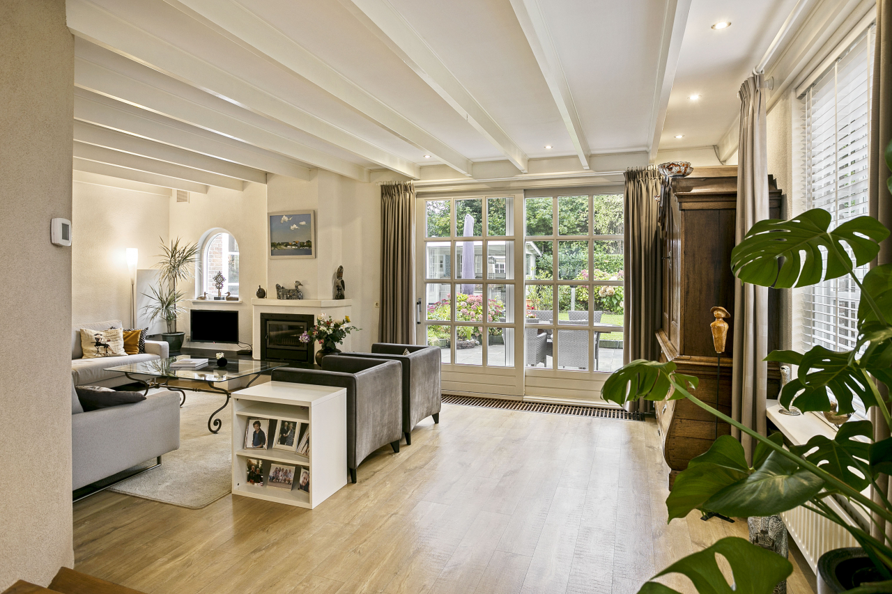 Vanuit de hal met garderobe, trapopgang, toilet met fonteintje zijn de woonkamer, keuken en aansluitend de bijkeuken bereikbaar. In de ruime, L vormige woonkamer met balkenplafond en sfeervolle openhaard met allesbrander, is aan de achterzijde een schuifpui die zorgt voor veel lichtinval. Er zijn tevens grote ramen met roedeverdeling aan de zijkant met zicht op de zij tuin.