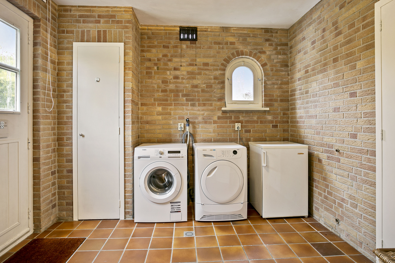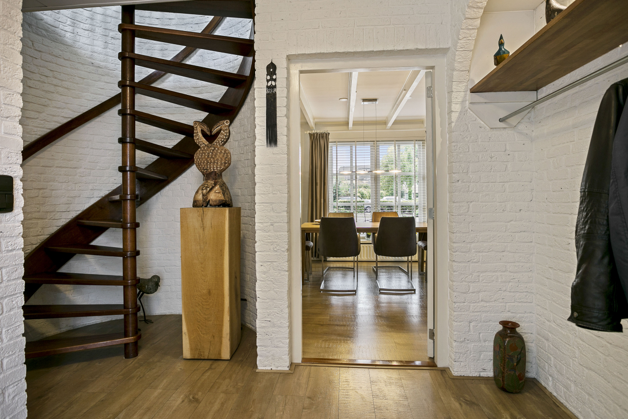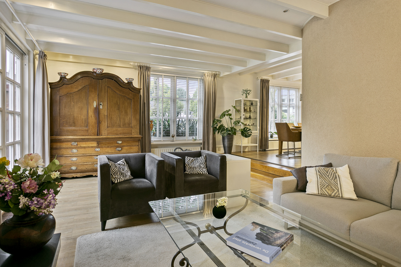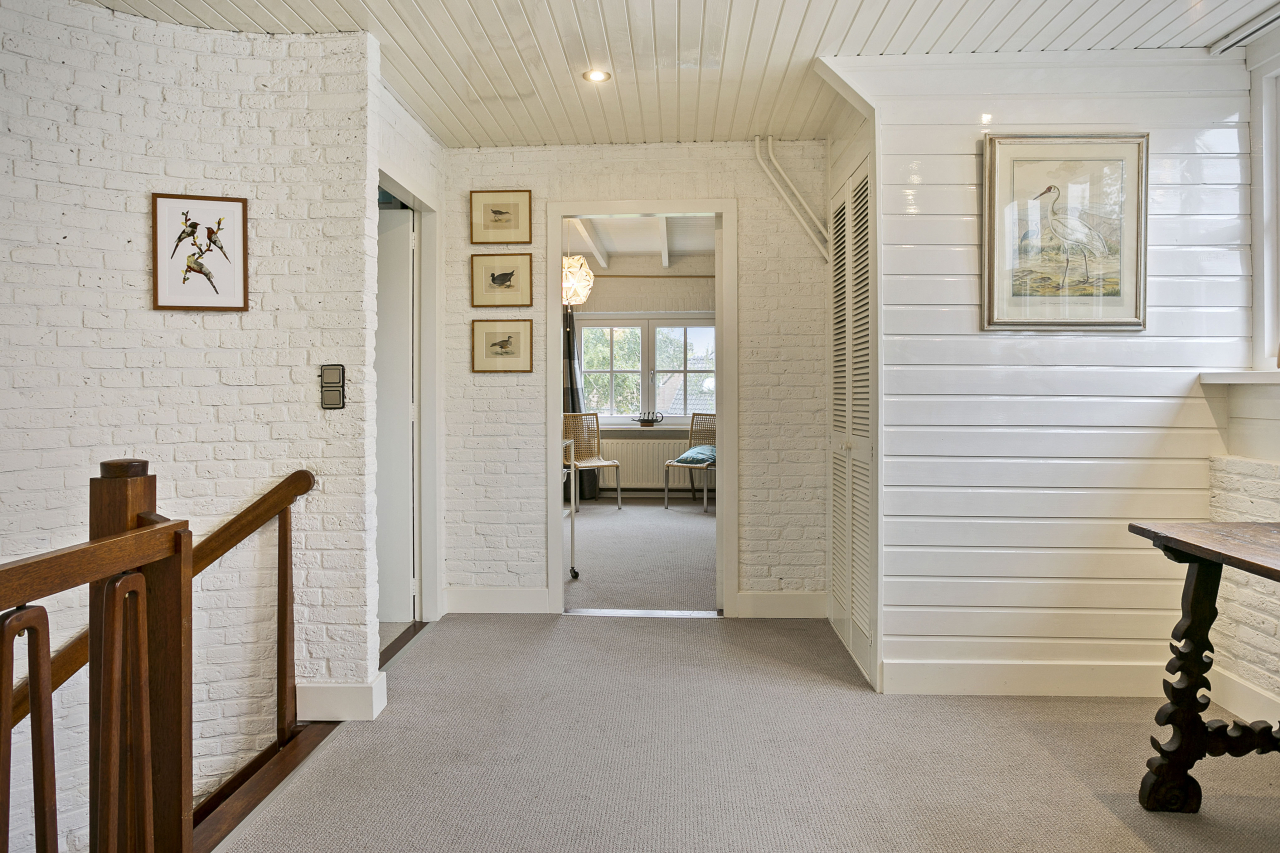 Vanuit de hal met garderobe, trapopgang, toilet met fonteintje zijn de woonkamer, keuken en aansluitend de bijkeuken bereikbaar. In de ruime, L vormige woonkamer met balkenplafond en sfeervolle openhaard met allesbrander, is aan de achterzijde een schuifpui die zorgt voor veel lichtinval. Er zijn tevens grote ramen met roedeverdeling aan de zijkant met zicht op de zij tuin.