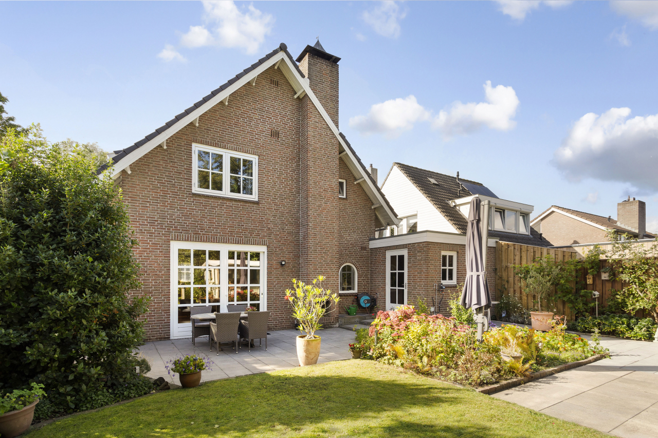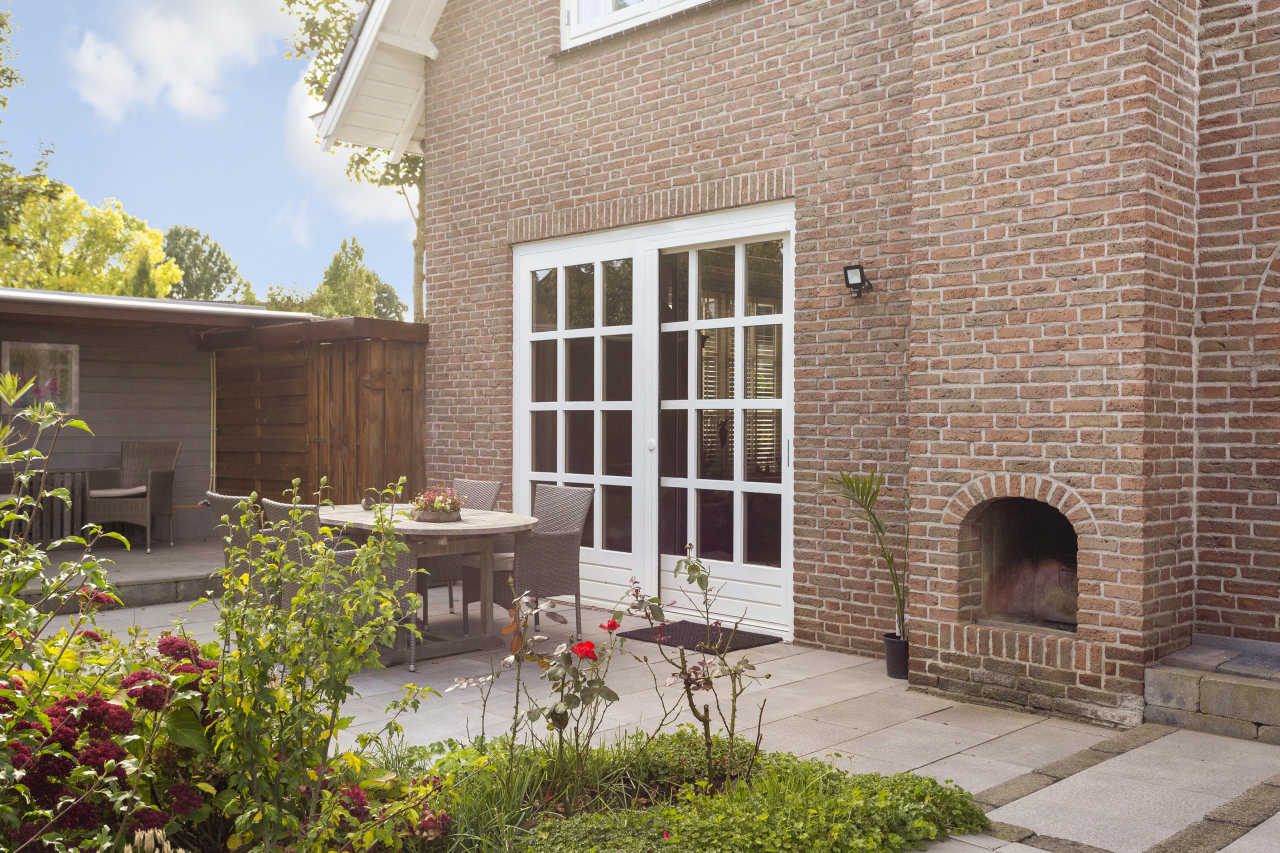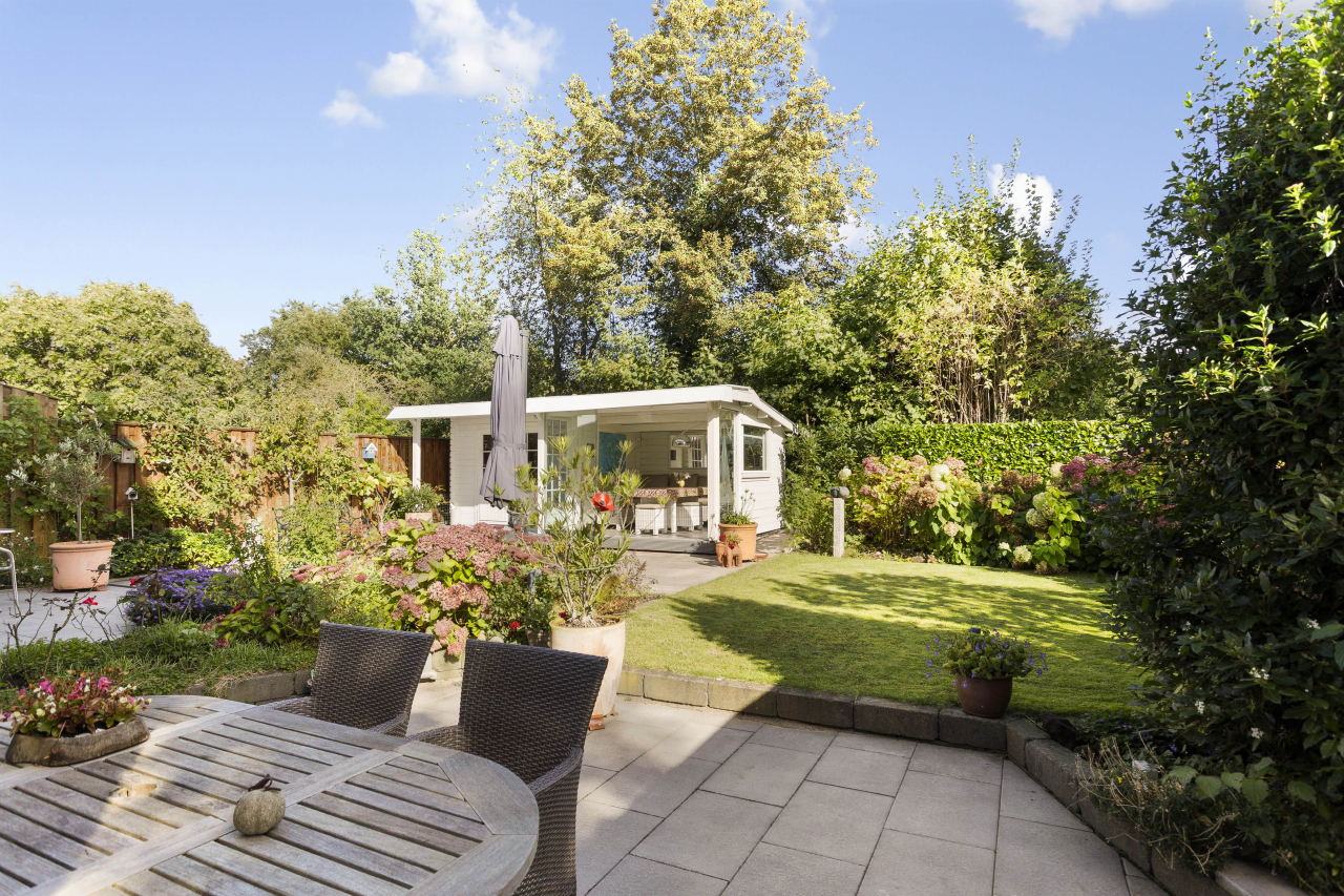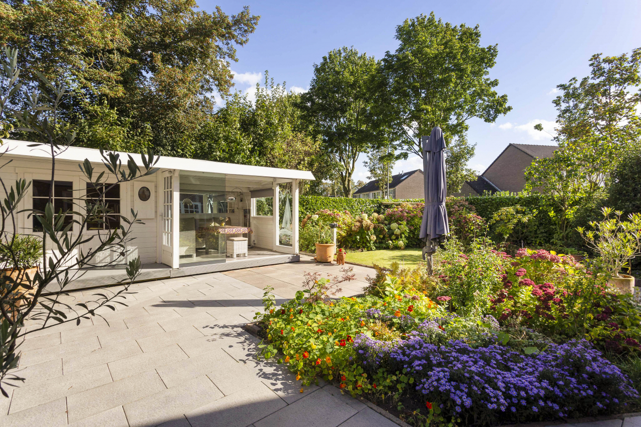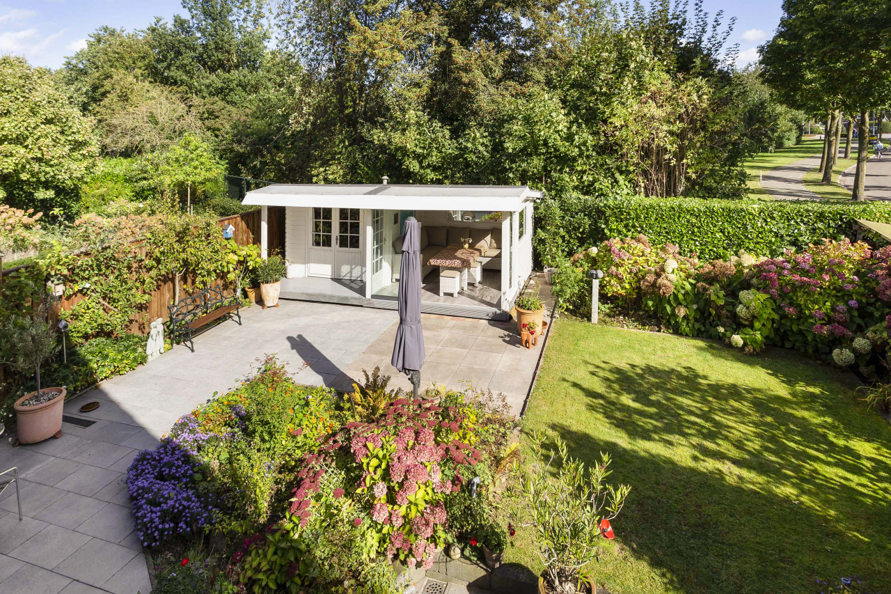 Bijna volledig rondom de woning ligt een fraaie tuin met achterom. Met een gazon, sproei installatie, diverse terrassen o.a. direct achter de woning. Verder een buitenhaard, borders, struiken, sierbestrating en achterin de tuin een houten tuinhuis met berging en tuinkamer met glazen schuifpui. Daarnaast nog een extra overkapping/ berging aan de zijkant van de woning bij de achterom. De tuin heeft veel privacy en loopt door tot aan een park achter het perceel van de woning.